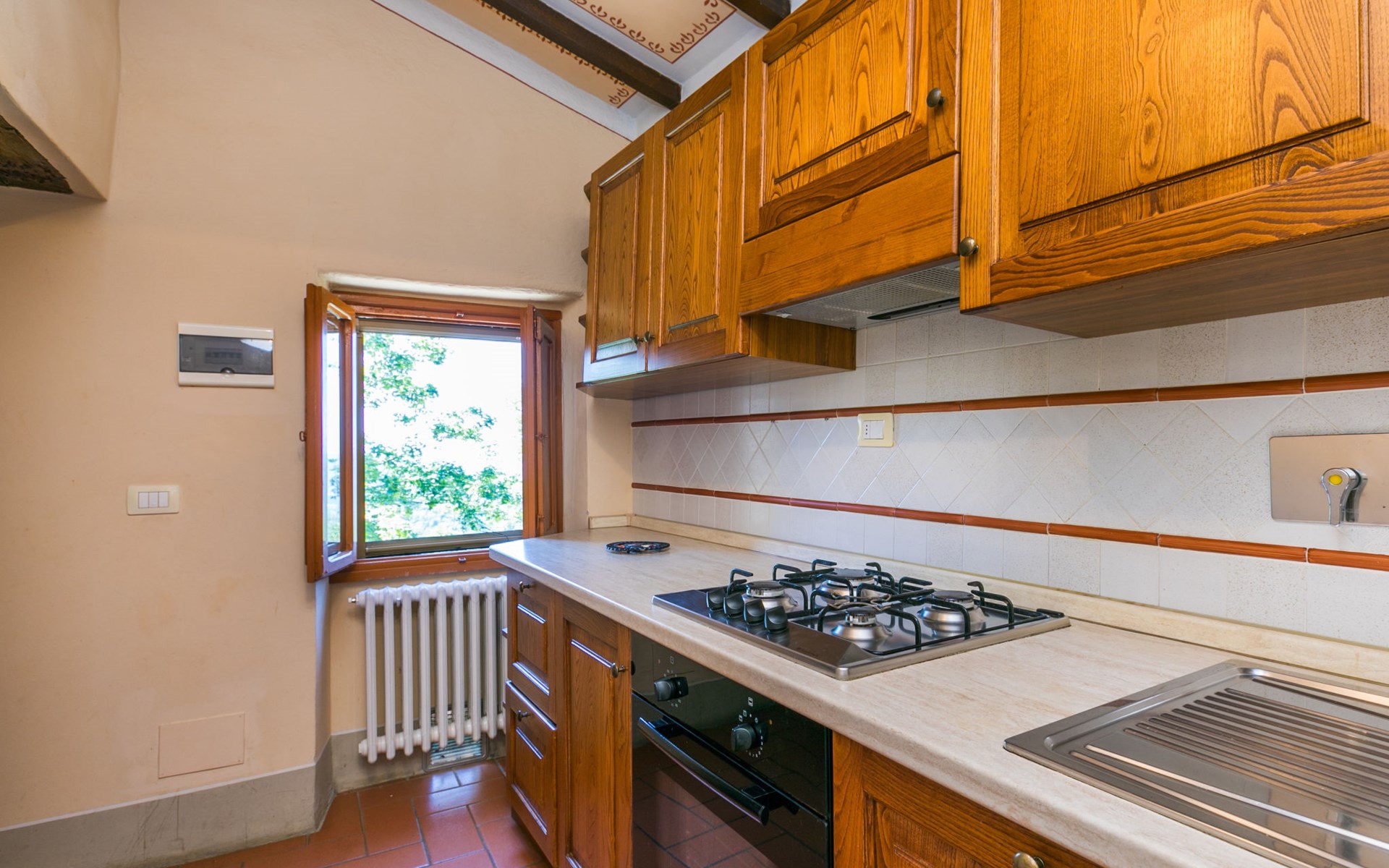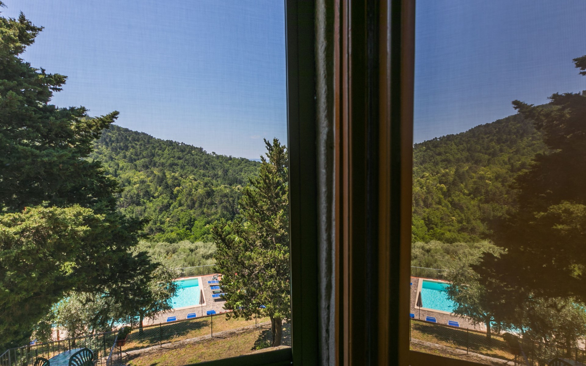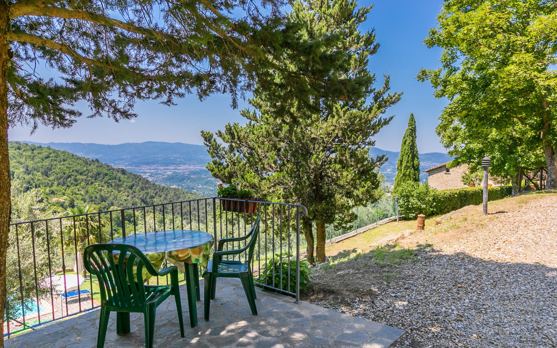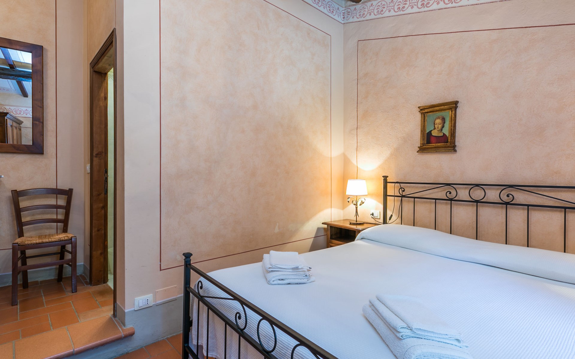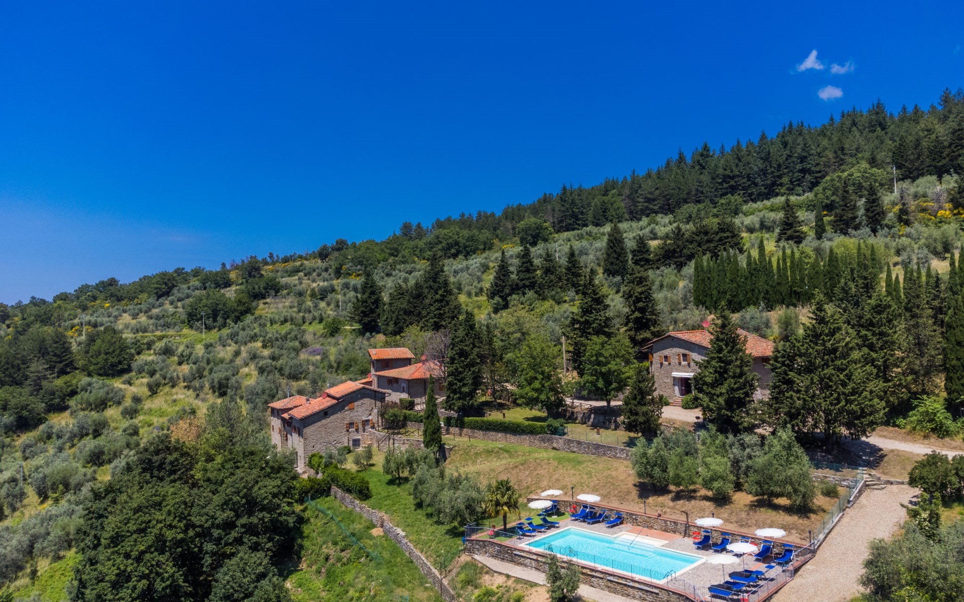 Borgo Stoppi, situated at 600 m a.s.l. at the foot of the Castello Poggio alla Regina, was a property of the counts Guidi since the 11th Century and after some changes of owners, in the 14th Century it became the main centre of the medieval district named "Curia del Castiglione" and agricultural capital of the surrounding mountain area, with its own town hall and big weekly market. Today, the old houses of the hamlet have been restored to 8 units, enhancing in a superb manner the beauty this affascinating place has maintained during the centuries: cypress, oak, pine and chestnuts trees are silent testimonies of Nature and wild boars, hares, squirrels, phaesants and owls may be watched in the surroundings. From the terrace covered with olive trees that produce one of the best and genuine olive oils of the area, you can enjoy a magnificent panorama over the Arno valley and the Chianti hills. Residence "Borgo Stoppi", 600 m a.s.l.. 2.5 km from the centre of Reggello, 30 km from the centre of Firenze, 35 km from the centre of Arezzo, in a quiet, sunny, elevated position, 70 km from the lake, in a cul-de-sac, in the countryside. For shared use: property 5'000 m2, swimming pool (6 x 12 m, depth 150 cm, seasonal availability: 22.May. - 08.Oct. pool opening hours: 08:00-21:00). Outdoor shower. Heating to be paid on the spot, heating available only from 01.Nov. - 07.Apr.. Steep motor access to the house (800 m via unmade road). Parking on the premises. Shop 2.5 km, grocery 2.5 km, supermarket 2.5 km, restaurant 2.5 km, bar 2.5 km, café 2.5 km, bus stop 3.5 km, railway station "Figline Valdarno" 10 km, bathing lake "Lago di Bilancino" 70 km. Nearby attractions: Firenze 40 km, Siena 86 km, Arezzo 64 km, Abazzia di Vallombrosa 16 km. Please note: car recommended. Suitable for families. The photograph shows a typical example.