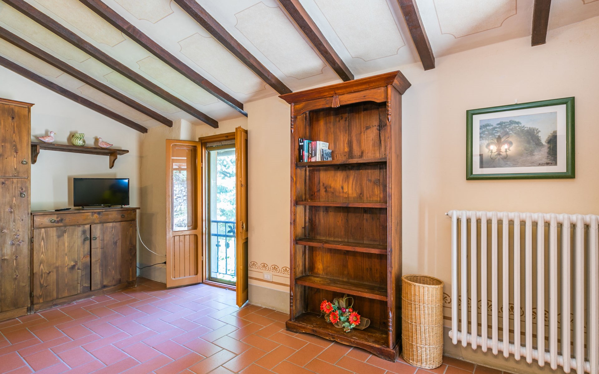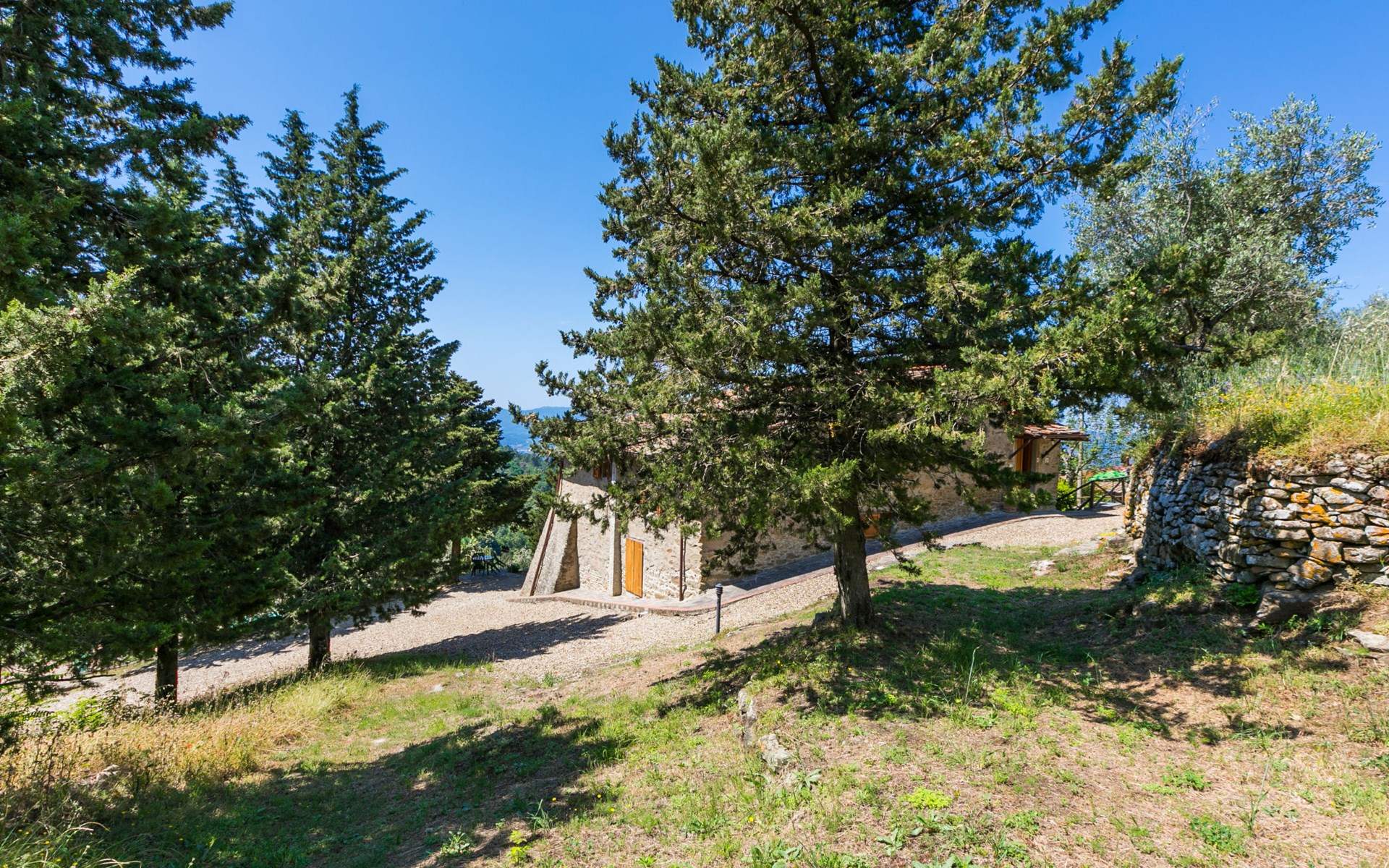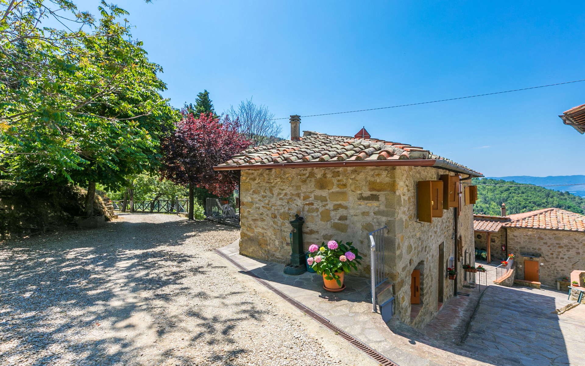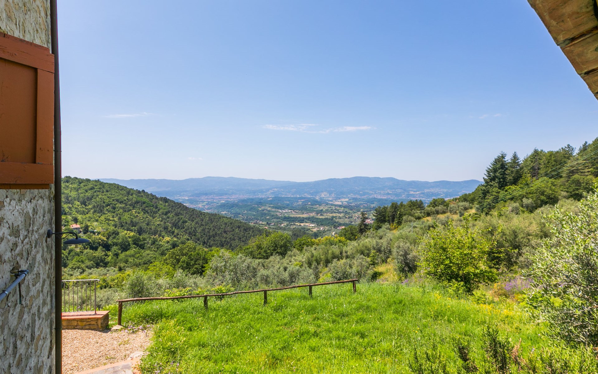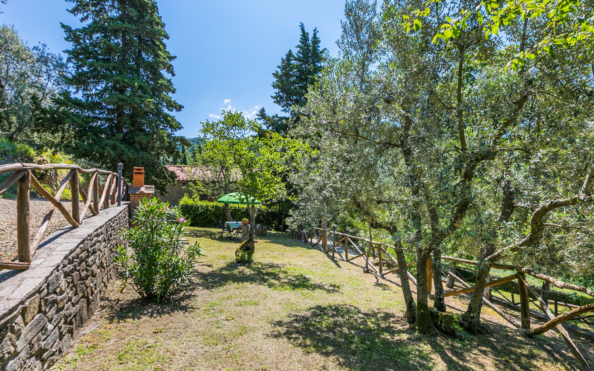 Borgo Stoppi, situated at 600 m a.s.l. at the foot of the Castello Poggio alla Regina, was a property of the counts Guidi since the 11th Century and after some changes of owners, in the 14th Century it became the main centre of the medieval district named "Curia del Castiglione" and agricultural capital of the surrounding mountain area, with its own town hall and big weekly market. Today, the old houses of the hamlet have been restored to 8 units, enhancing in a superb manner the beauty this affascinating place has maintained during the centuries: cypress, oak, pine and chestnuts trees are silent testimonies of Nature and wild boars, hares, squirrels, phaesants and owls may be watched in the surroundings. From the terrace covered with olive trees that produce one of the best and genuine olive oils of the area, you can enjoy a magnificent panorama over the Arno valley and the Chianti hills. Residence "Borgo Stoppi", 600 m a.s.l.. 2.5 km from the centre of Reggello, 30 km from the centre of Firenze, 35 km from the centre of Arezzo, in a quiet, sunny, elevated position, 70 km from the lake, in a cul-de-sac, in the countryside. For shared use: property 5'000 m2, swimming pool (6 x 12 m, depth 150 cm, seasonal availability: 22.May. - 08.Oct. pool opening hours: 08:00-21:00). Outdoor shower. Heating to be paid on the spot, heating available only from 01.Nov. - 07.Apr.. Steep motor access to the house (800 m via unmade road). Parking on the premises. Shop 2.5 km, grocery 2.5 km, supermarket 2.5 km, restaurant 2.5 km, bar 2.5 km, café 2.5 km, bus stop 3.5 km, railway station "Figline Valdarno" 10 km, bathing lake "Lago di Bilancino" 70 km. Nearby attractions: Firenze 40 km, Siena 86 km, Arezzo 64 km, Abazzia di Vallombrosa 16 km. Please note: car recommended. Suitable for families. The photograph shows a typical example.