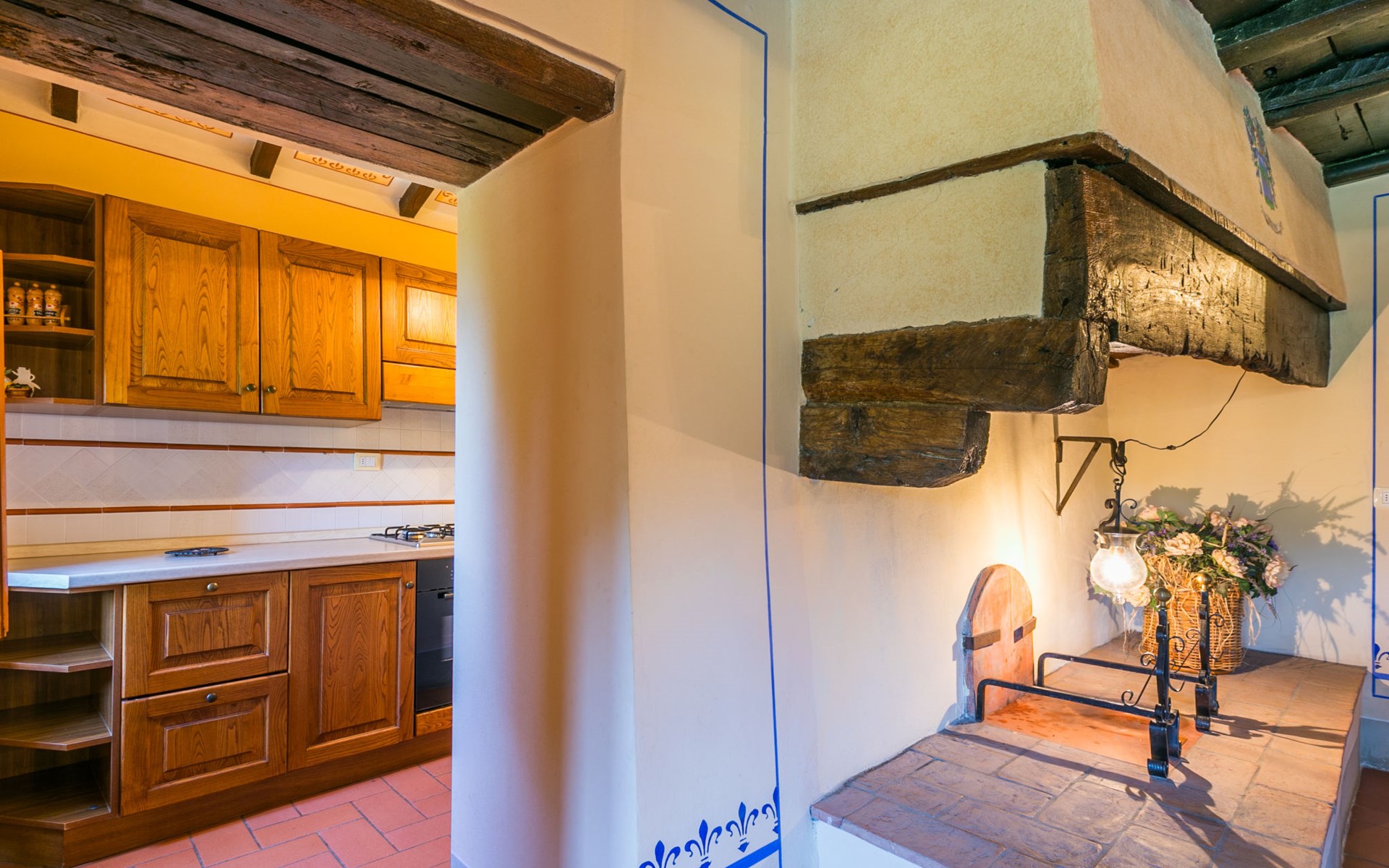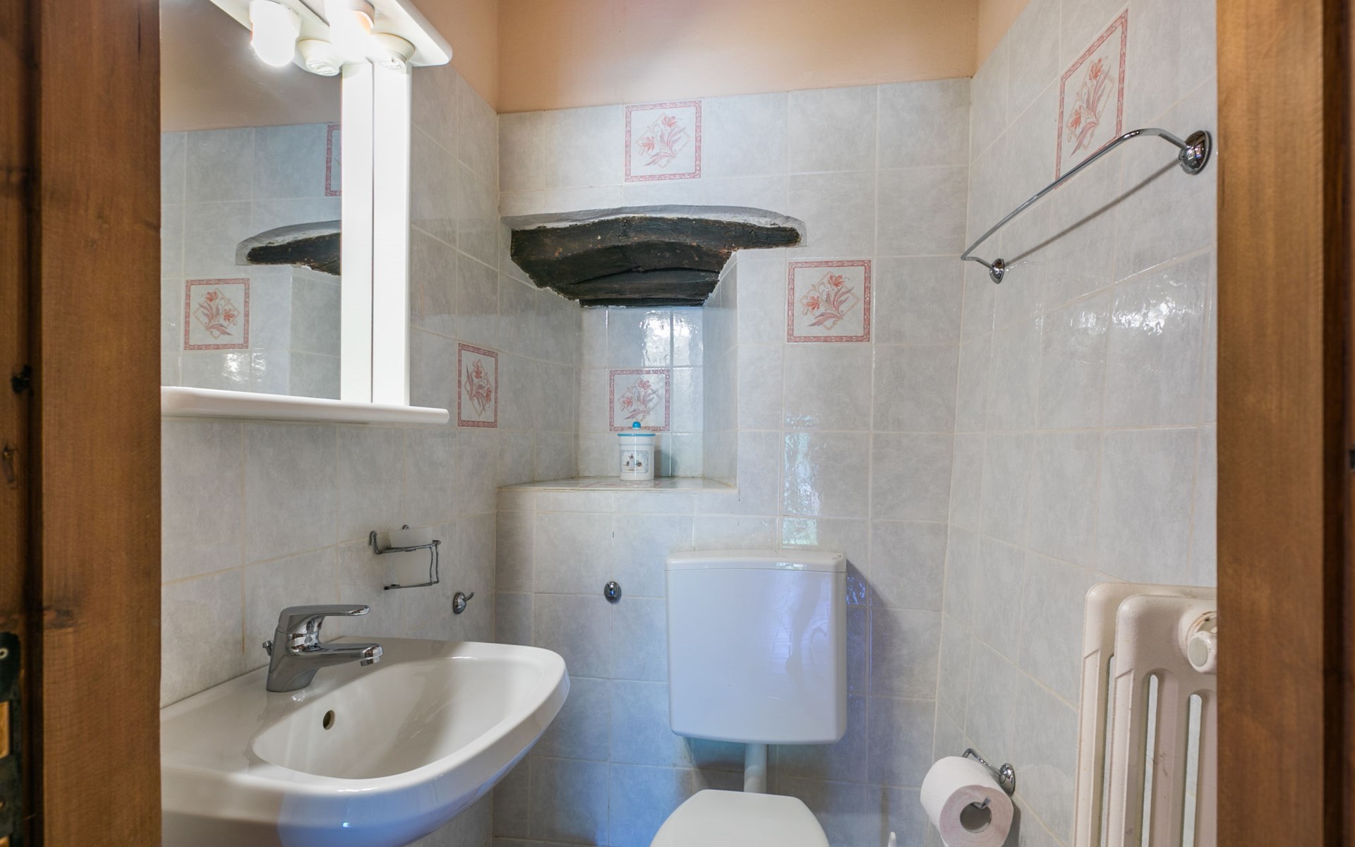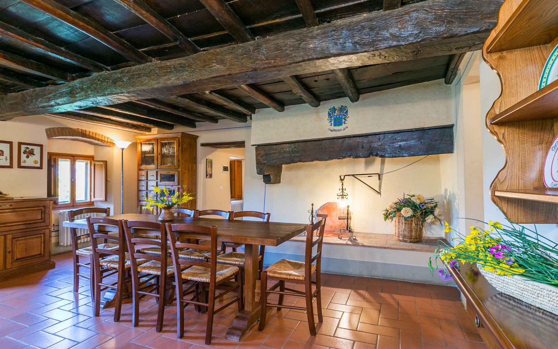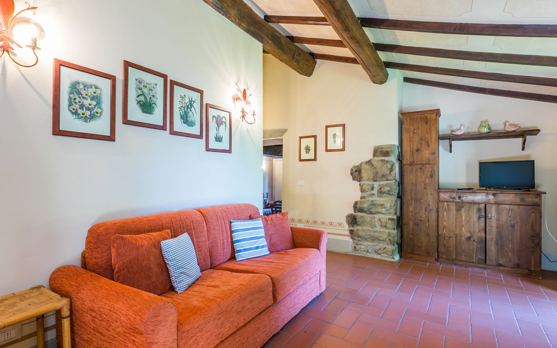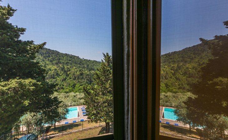 Borgo Stoppi, situated at 600 m a.s.l. at the foot of the Castello Poggio alla Regina, was a property of the counts Guidi since the 11th Century and after some changes of owners, in the 14th Century it became the main centre of the medieval district named "Curia del Castiglione" and agricultural capital of the surrounding mountain area, with its own town hall and big weekly market. Today, the old houses of the hamlet have been restored to 8 units, enhancing in a superb manner the beauty this affascinating place has maintained during the centuries: cypress, oak, pine and chestnuts trees are silent testimonies of Nature and wild boars, hares, squirrels, phaesants and owls may be watched in the surroundings. From the terrace covered with olive trees that produce one of the best and genuine olive oils of the area, you can enjoy a magnificent panorama over the Arno valley and the Chianti hills. Residence "Borgo Stoppi", 600 m a.s.l.. 2.5 km from the centre of Reggello, 30 km from the centre of Firenze, 35 km from the centre of Arezzo, in a quiet, sunny, elevated position, 70 km from the lake, in a cul-de-sac, in the countryside. For shared use: property 5'000 m2, swimming pool (6 x 12 m, depth 150 cm, seasonal availability: 22.May. - 08.Oct. pool opening hours: 08:00-21:00). Outdoor shower. Heating to be paid on the spot, heating available only from 01.Nov. - 07.Apr.. Steep motor access to the house (800 m via unmade road). Parking on the premises. Shop 2.5 km, grocery 2.5 km, supermarket 2.5 km, restaurant 2.5 km, bar 2.5 km, café 2.5 km, bus stop 3.5 km, railway station "Figline Valdarno" 10 km, bathing lake "Lago di Bilancino" 70 km. Nearby attractions: Firenze 40 km, Siena 86 km, Arezzo 64 km, Abazzia di Vallombrosa 16 km. Please note: car recommended. Suitable for families. The photograph shows a typical example.