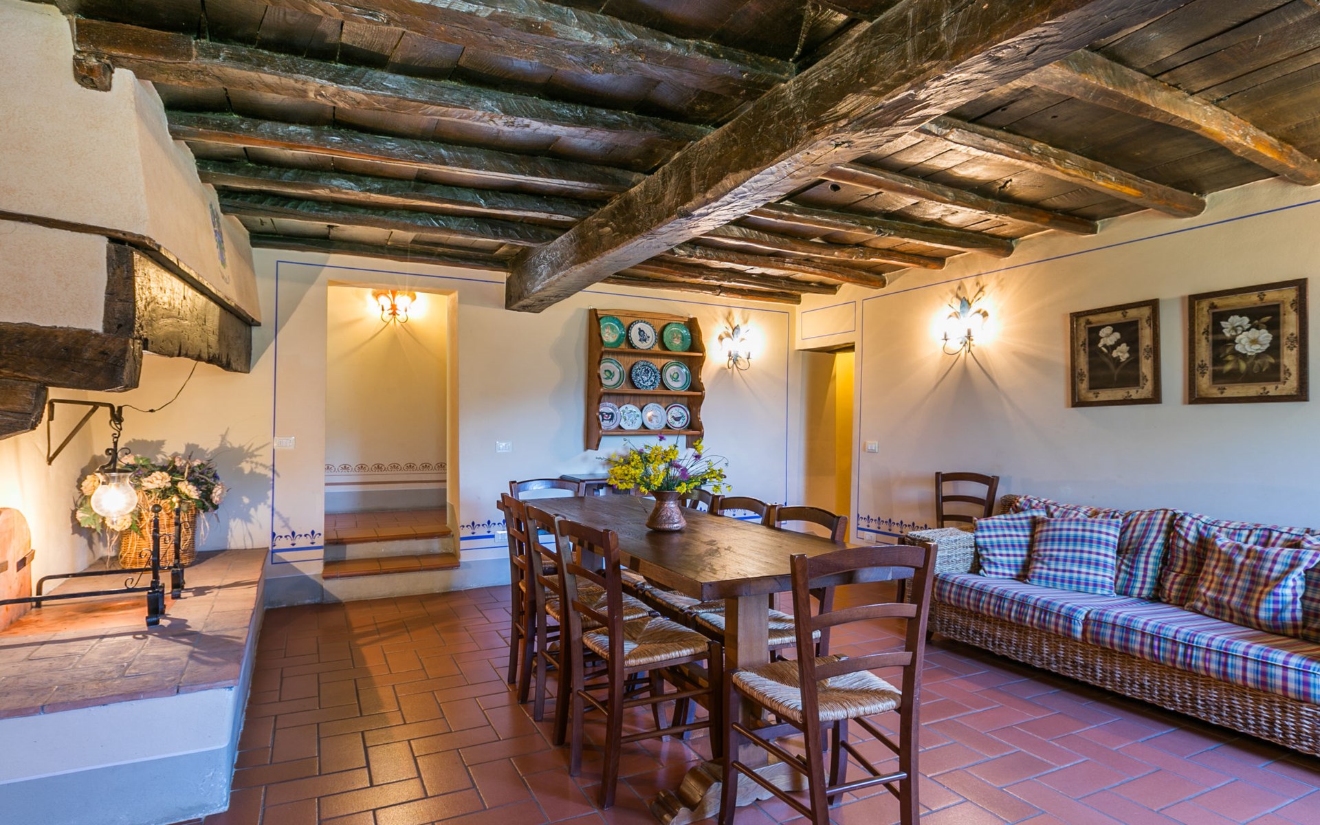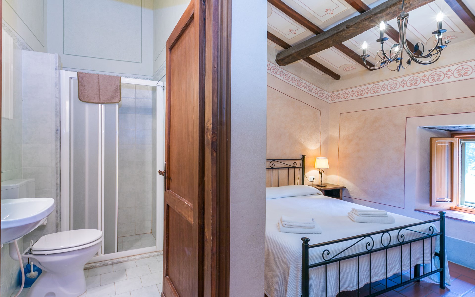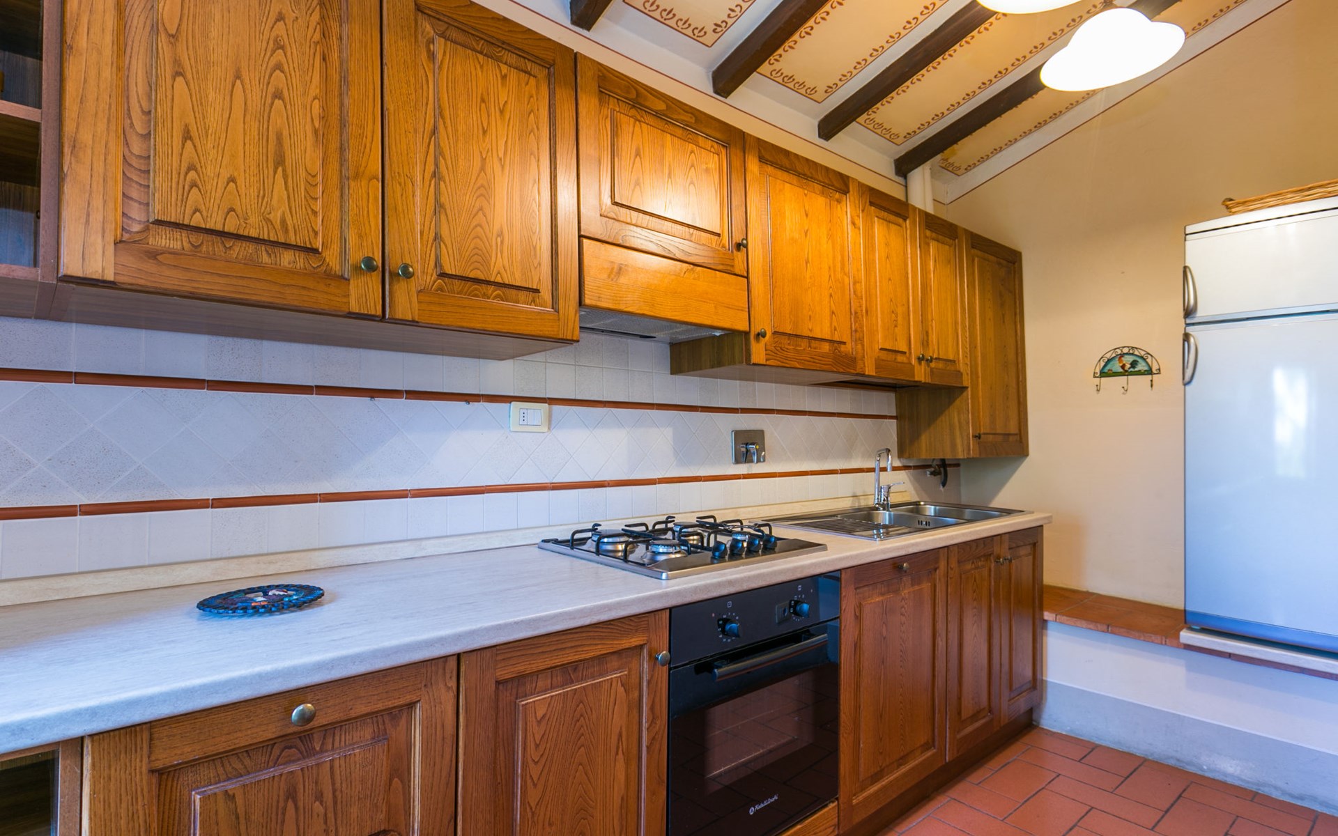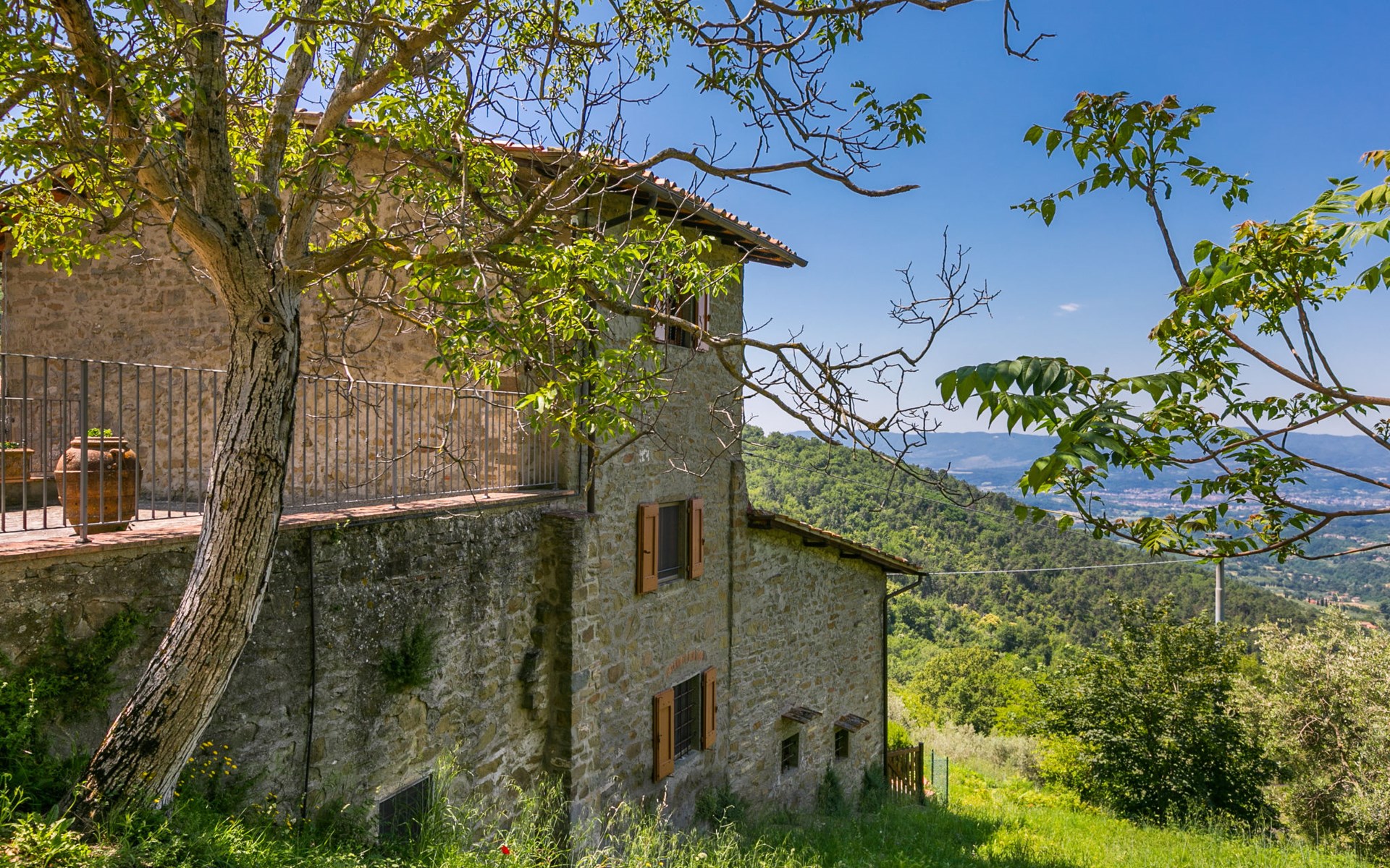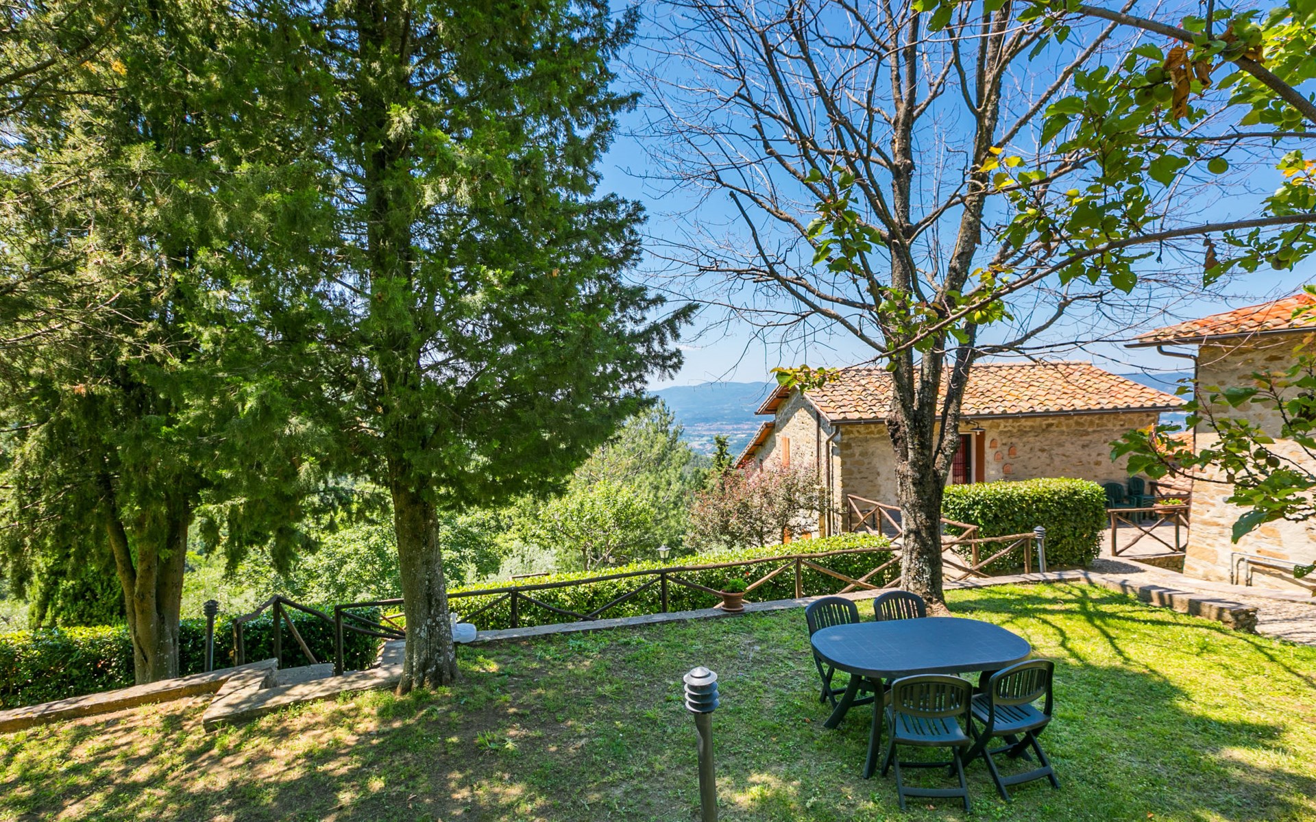 Borgo Stoppi, situated at 600 m a.s.l. at the foot of the Castello Poggio alla Regina, was a property of the counts Guidi since the 11th Century and after some changes of owners, in the 14th Century it became the main centre of the medieval district named "Curia del Castiglione" and agricultural capital of the surrounding mountain area, with its own town hall and big weekly market. Today, the old houses of the hamlet have been restored to 8 units, enhancing in a superb manner the beauty this affascinating place has maintained during the centuries: cypress, oak, pine and chestnuts trees are silent testimonies of Nature and wild boars, hares, squirrels, phaesants and owls may be watched in the surroundings. From the terrace covered with olive trees that produce one of the best and genuine olive oils of the area, you can enjoy a magnificent panorama over the Arno valley and the Chianti hills. Residence "Borgo Stoppi", 600 m a.s.l.. 2.5 km from the centre of Reggello, 30 km from the centre of Firenze, 35 km from the centre of Arezzo, in a quiet, sunny, elevated position, 70 km from the lake, in a cul-de-sac, in the countryside. For shared use: property 5'000 m2, swimming pool (6 x 12 m, depth 150 cm, seasonal availability: 22.May. - 08.Oct. pool opening hours: 08:00-21:00). Outdoor shower. Heating to be paid on the spot, heating available only from 01.Nov. - 07.Apr.. Steep motor access to the house (800 m via unmade road). Parking on the premises. Shop 2.5 km, grocery 2.5 km, supermarket 2.5 km, restaurant 2.5 km, bar 2.5 km, café 2.5 km, bus stop 3.5 km, railway station "Figline Valdarno" 10 km, bathing lake "Lago di Bilancino" 70 km. Nearby attractions: Firenze 40 km, Siena 86 km, Arezzo 64 km, Abazzia di Vallombrosa 16 km. Please note: car recommended. Suitable for families. The photograph shows a typical example.