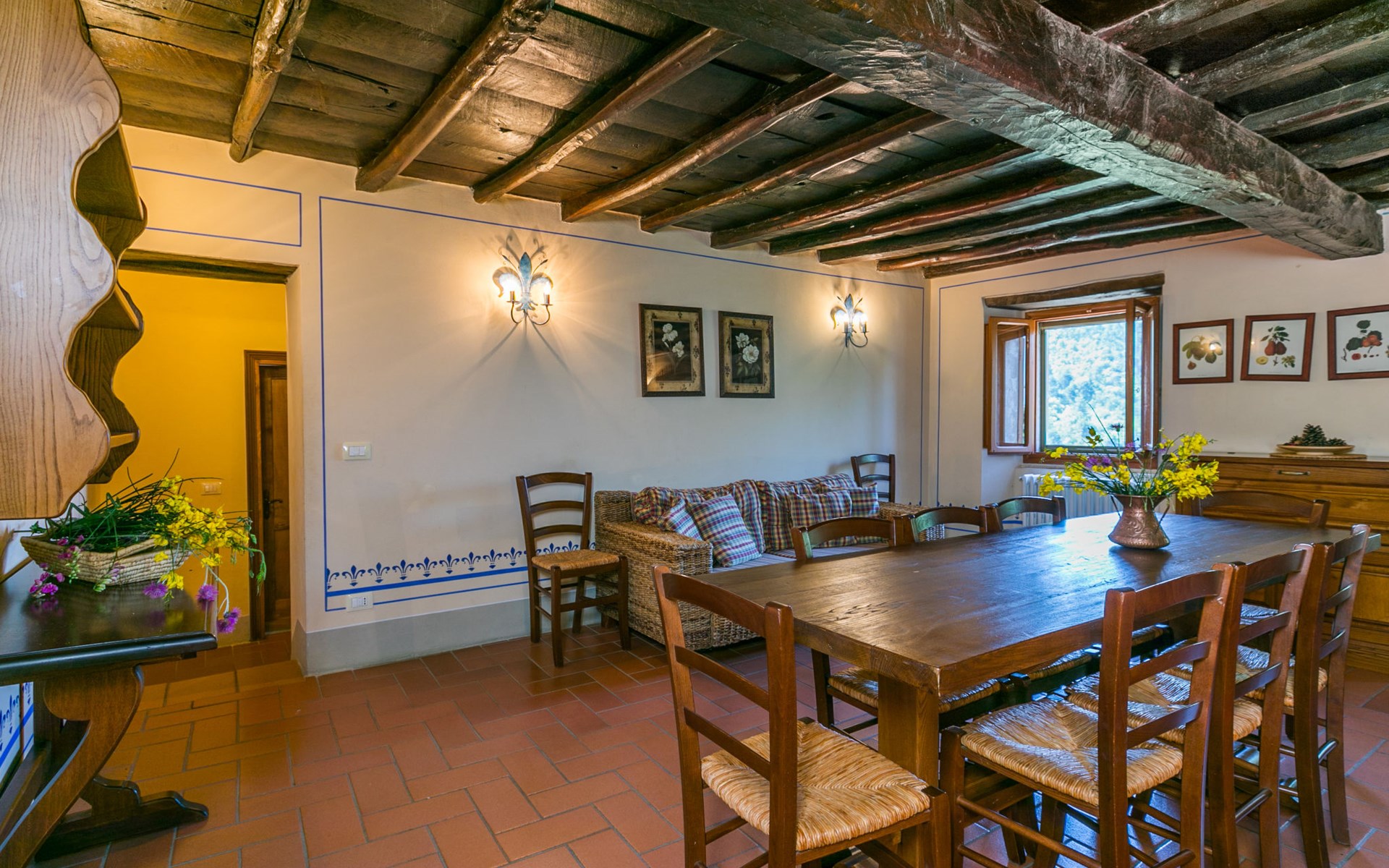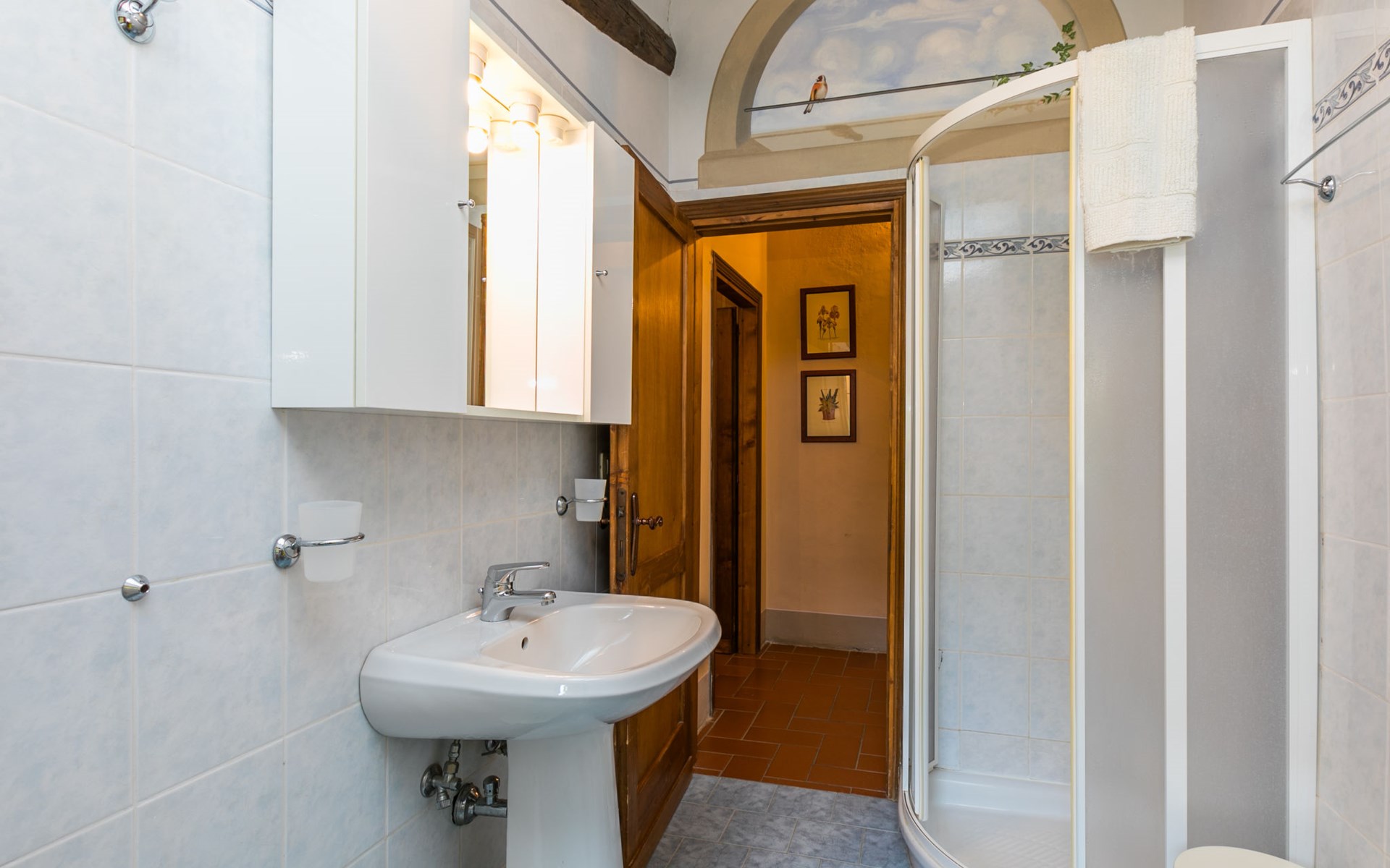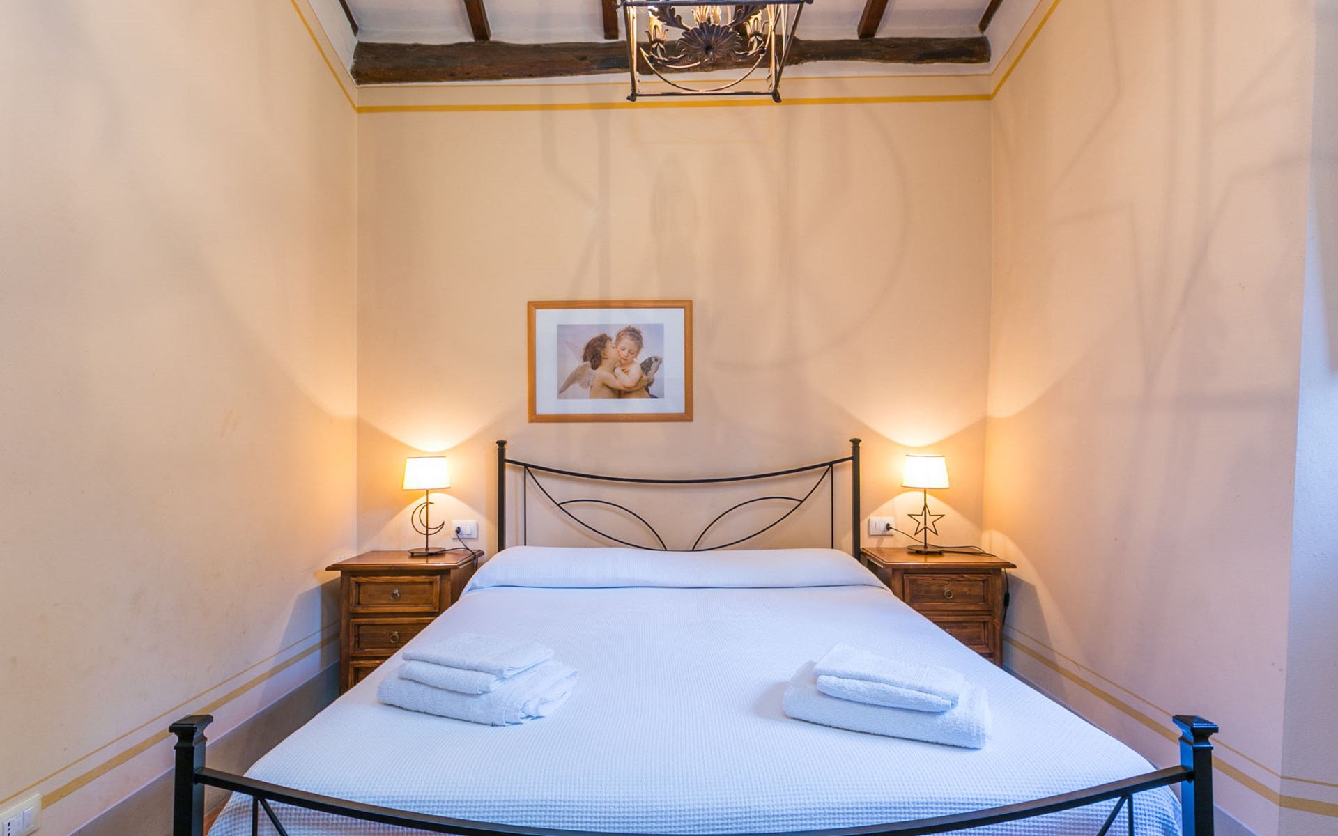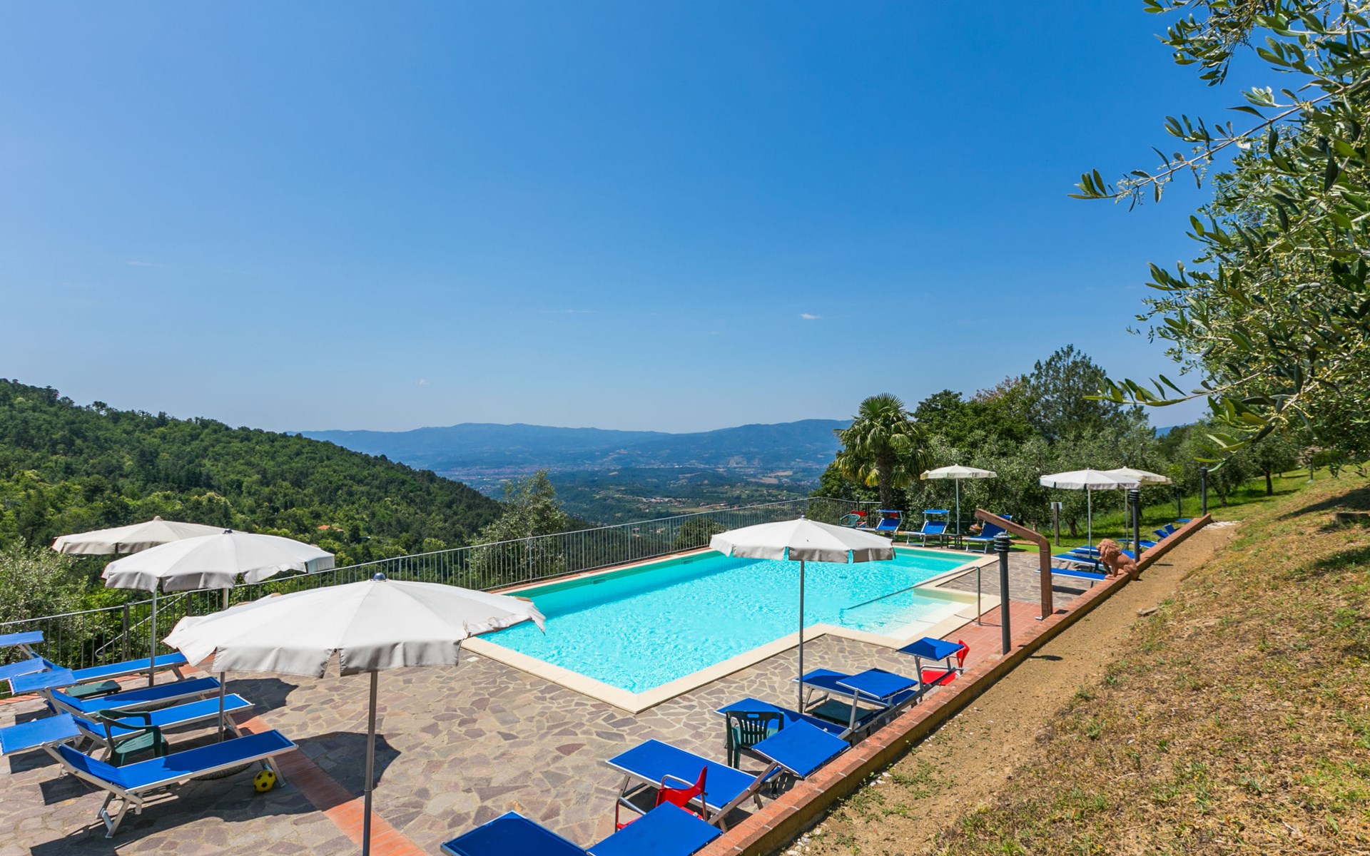 Borgo Stoppi, situated at 600 m a.s.l. at the foot of the Castello Poggio alla Regina, was a property of the counts Guidi since the 11th Century and after some changes of owners, in the 14th Century it became the main centre of the medieval district named "Curia del Castiglione" and agricultural capital of the surrounding mountain area, with its own town hall and big weekly market. Today, the old houses of the hamlet have been restored to 8 units, enhancing in a superb manner the beauty this affascinating place has maintained during the centuries: cypress, oak, pine and chestnuts trees are silent testimonies of Nature and wild boars, hares, squirrels, phaesants and owls may be watched in the surroundings. From the terrace covered with olive trees that produce one of the best and genuine olive oils of the area, you can enjoy a magnificent panorama over the Arno valley and the Chianti hills. Residence "Borgo Stoppi", 600 m a.s.l.. 2.5 km from the centre of Reggello, 30 km from the centre of Firenze, 35 km from the centre of Arezzo, in a quiet, sunny, elevated position, 70 km from the lake, in a cul-de-sac, in the countryside. For shared use: property 5'000 m2, swimming pool (6 x 12 m, depth 150 cm, seasonal availability: 22.May. - 08.Oct. pool opening hours: 08:00-21:00). Outdoor shower. Heating to be paid on the spot, heating available only from 01.Nov. - 07.Apr.. Steep motor access to the house (800 m via unmade road). Parking on the premises. Shop 2.5 km, grocery 2.5 km, supermarket 2.5 km, restaurant 2.5 km, bar 2.5 km, café 2.5 km, bus stop 3.5 km, railway station "Figline Valdarno" 10 km, bathing lake "Lago di Bilancino" 70 km. Nearby attractions: Firenze 40 km, Siena 86 km, Arezzo 64 km, Abazzia di Vallombrosa 16 km. Please note: car recommended. Suitable for families. The photograph shows a typical example.
