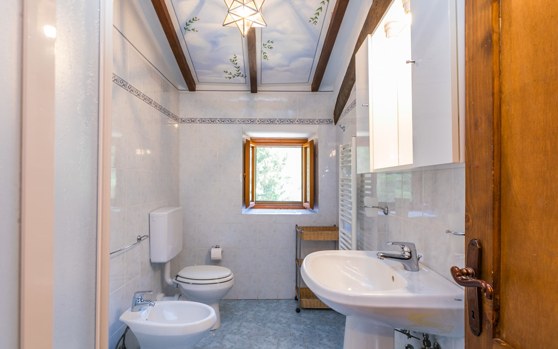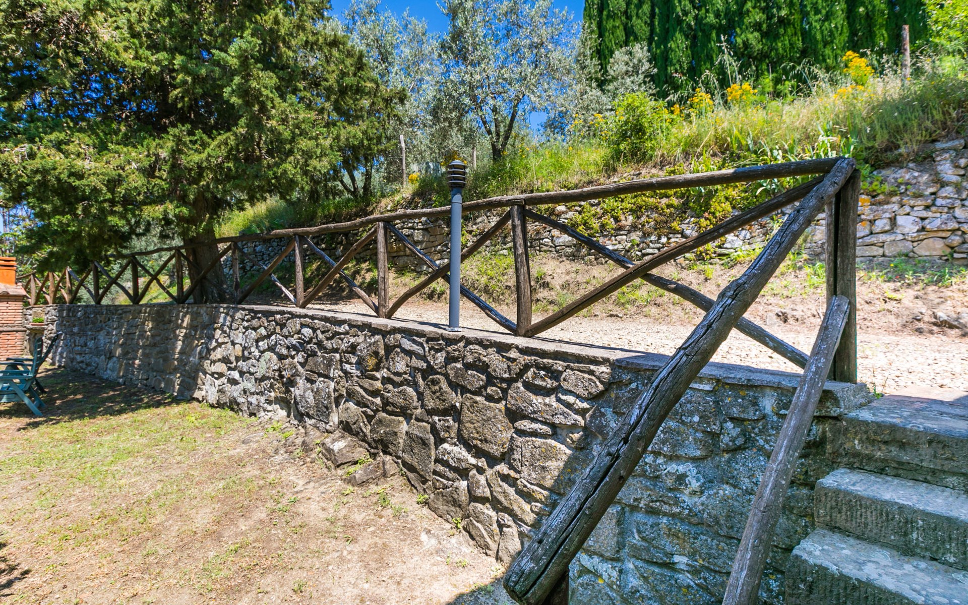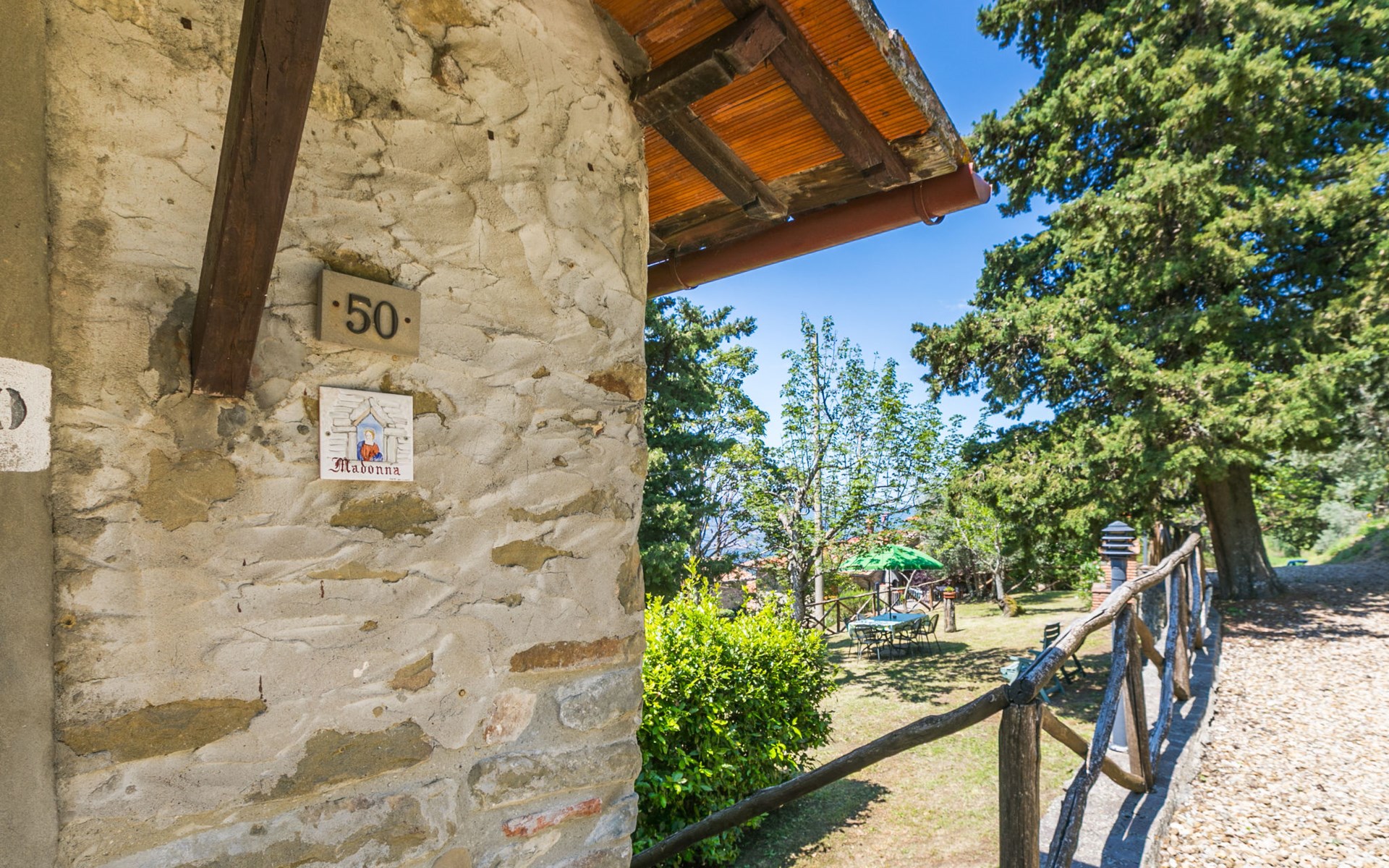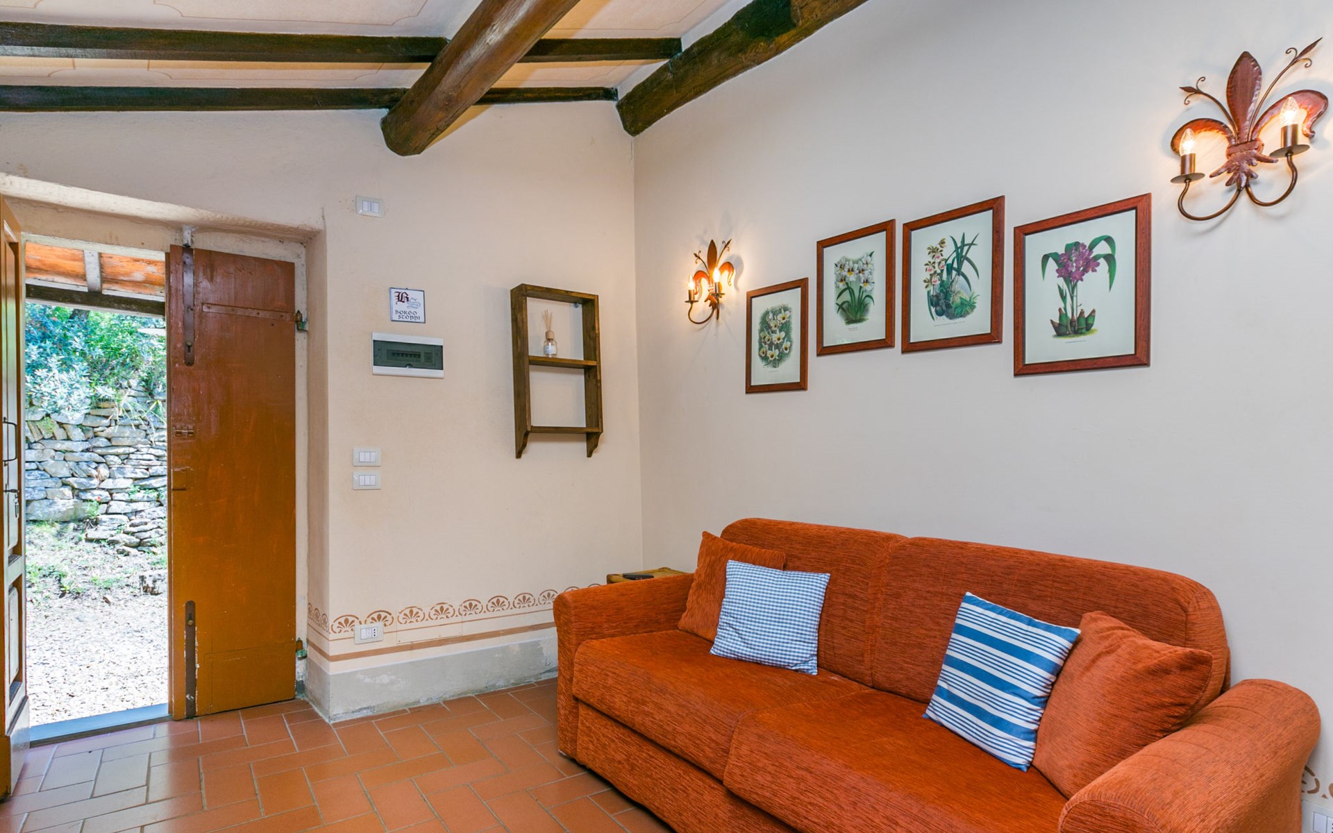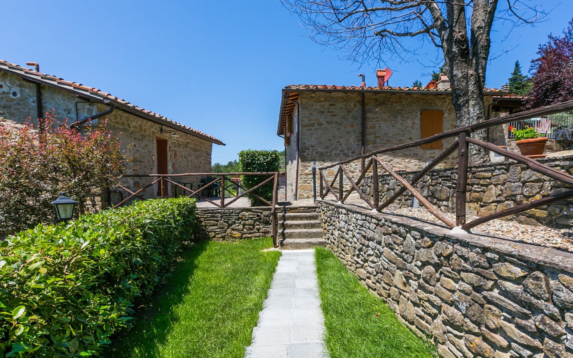 Borgo Stoppi, situated at 600 m a.s.l. at the foot of the Castello Poggio alla Regina, was a property of the counts Guidi since the 11th Century and after some changes of owners, in the 14th Century it became the main centre of the medieval district named "Curia del Castiglione" and agricultural capital of the surrounding mountain area, with its own town hall and big weekly market. Today, the old houses of the hamlet have been restored to 8 units, enhancing in a superb manner the beauty this affascinating place has maintained during the centuries: cypress, oak, pine and chestnuts trees are silent testimonies of Nature and wild boars, hares, squirrels, phaesants and owls may be watched in the surroundings. From the terrace covered with olive trees that produce one of the best and genuine olive oils of the area, you can enjoy a magnificent panorama over the Arno valley and the Chianti hills. Residence "Borgo Stoppi", 600 m a.s.l.. 2.5 km from the centre of Reggello, 30 km from the centre of Firenze, 35 km from the centre of Arezzo, in a quiet, sunny, elevated position, 70 km from the lake, in a cul-de-sac, in the countryside. For shared use: property 5'000 m2, swimming pool (6 x 12 m, depth 150 cm, seasonal availability: 22.May. - 08.Oct. pool opening hours: 08:00-21:00). Outdoor shower. Heating to be paid on the spot, heating available only from 01.Nov. - 07.Apr.. Steep motor access to the house (800 m via unmade road). Parking on the premises. Shop 2.5 km, grocery 2.5 km, supermarket 2.5 km, restaurant 2.5 km, bar 2.5 km, café 2.5 km, bus stop 3.5 km, railway station "Figline Valdarno" 10 km, bathing lake "Lago di Bilancino" 70 km. Nearby attractions: Firenze 40 km, Siena 86 km, Arezzo 64 km, Abazzia di Vallombrosa 16 km. Please note: car recommended. Suitable for families. The photograph shows a typical example.