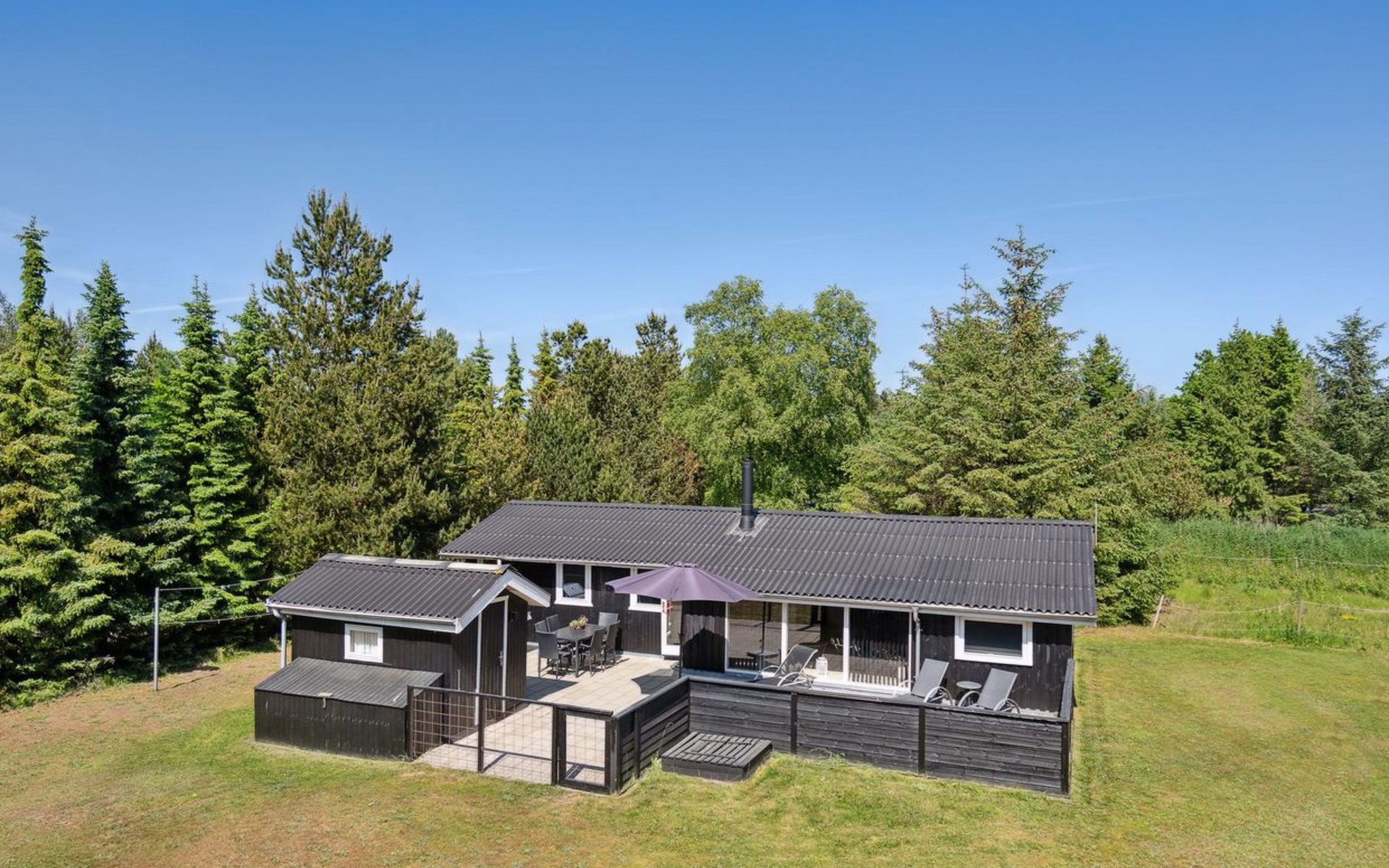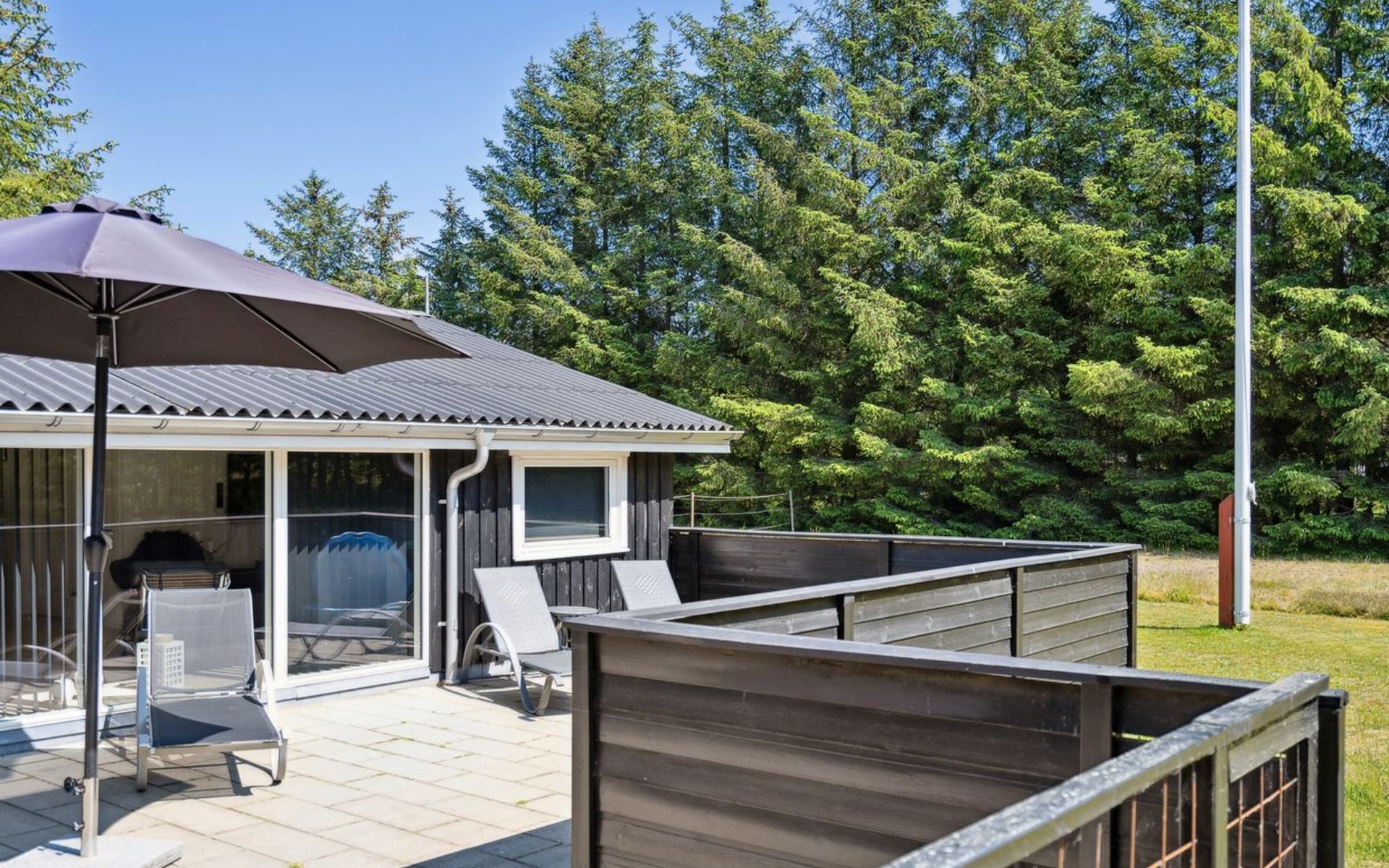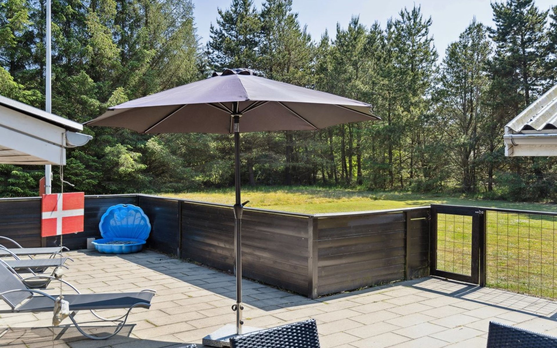 Single-family house, built in 1970. 250 m from the sea. Private: natural state property 2'550 m2. Terrace (50 m2), children's playground (swing). In the house: washing machine. Parking at the house. Grocery 600 m. The owner does not accept any youth groups.