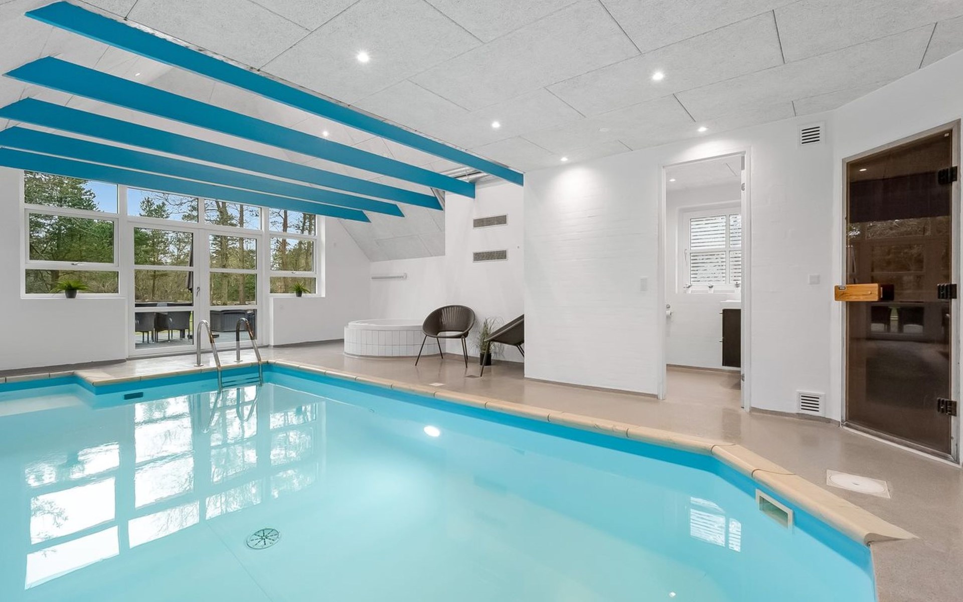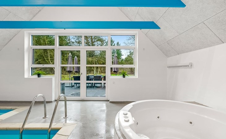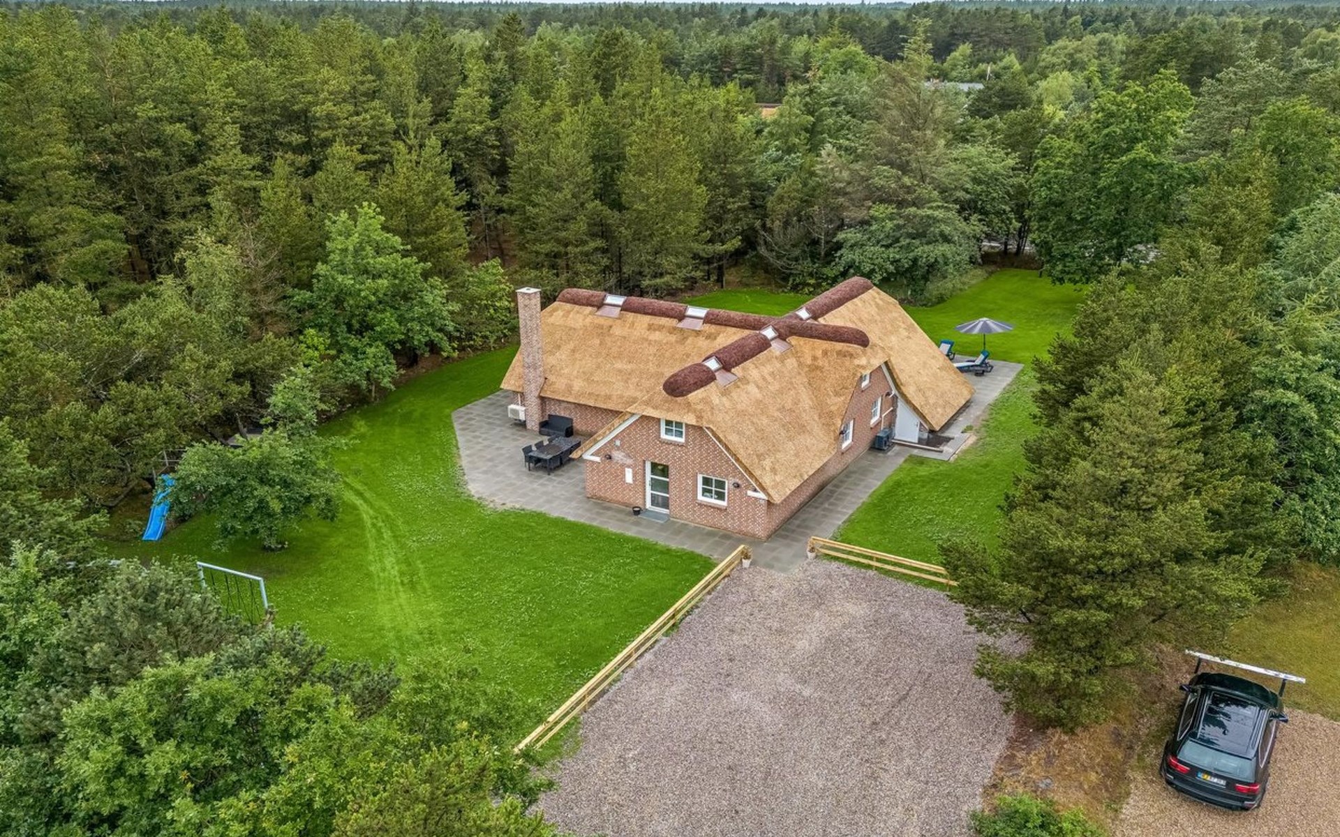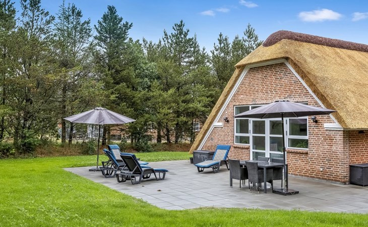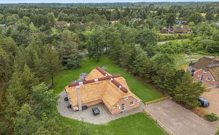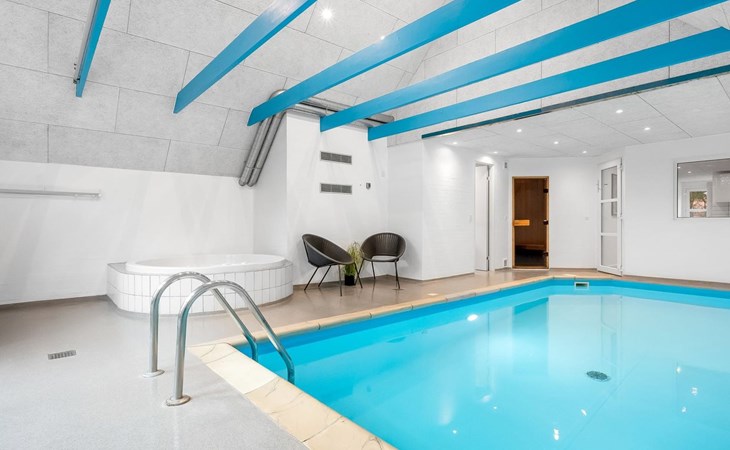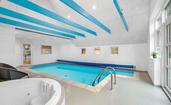 Single-family house, built in 1994. 2.5 km from the sea. Private: natural state property 2'286 m2, indoor pool (3 x 6 m, 18 m2, depth 140 - 140 cm). Terrace (220 m2), children's playground (slide, swing). In the house: sauna, trampoline, washing machine, tumble dryer. Parking at the house. E-charging station. Grocery 1 km. The owner does not accept any youth groups.