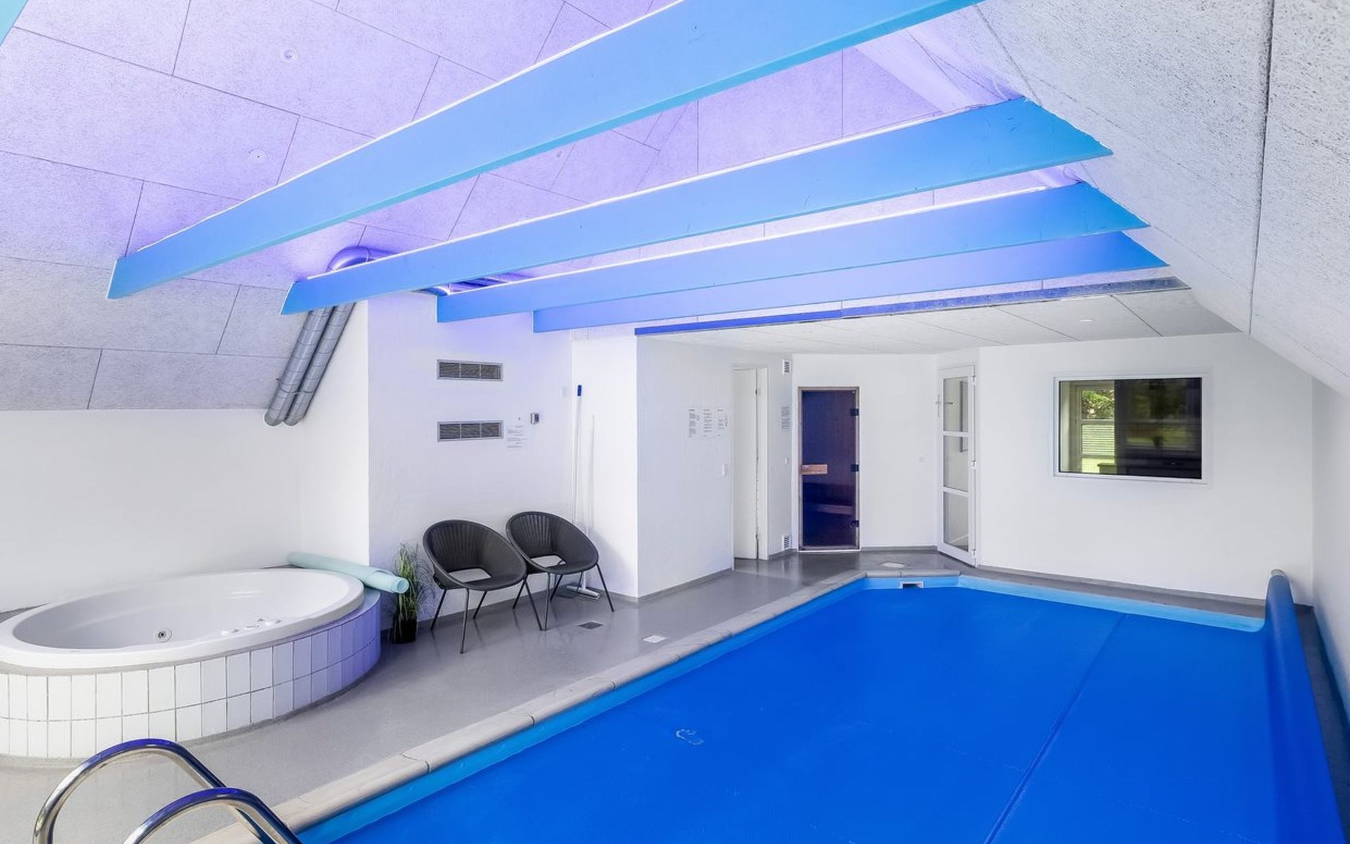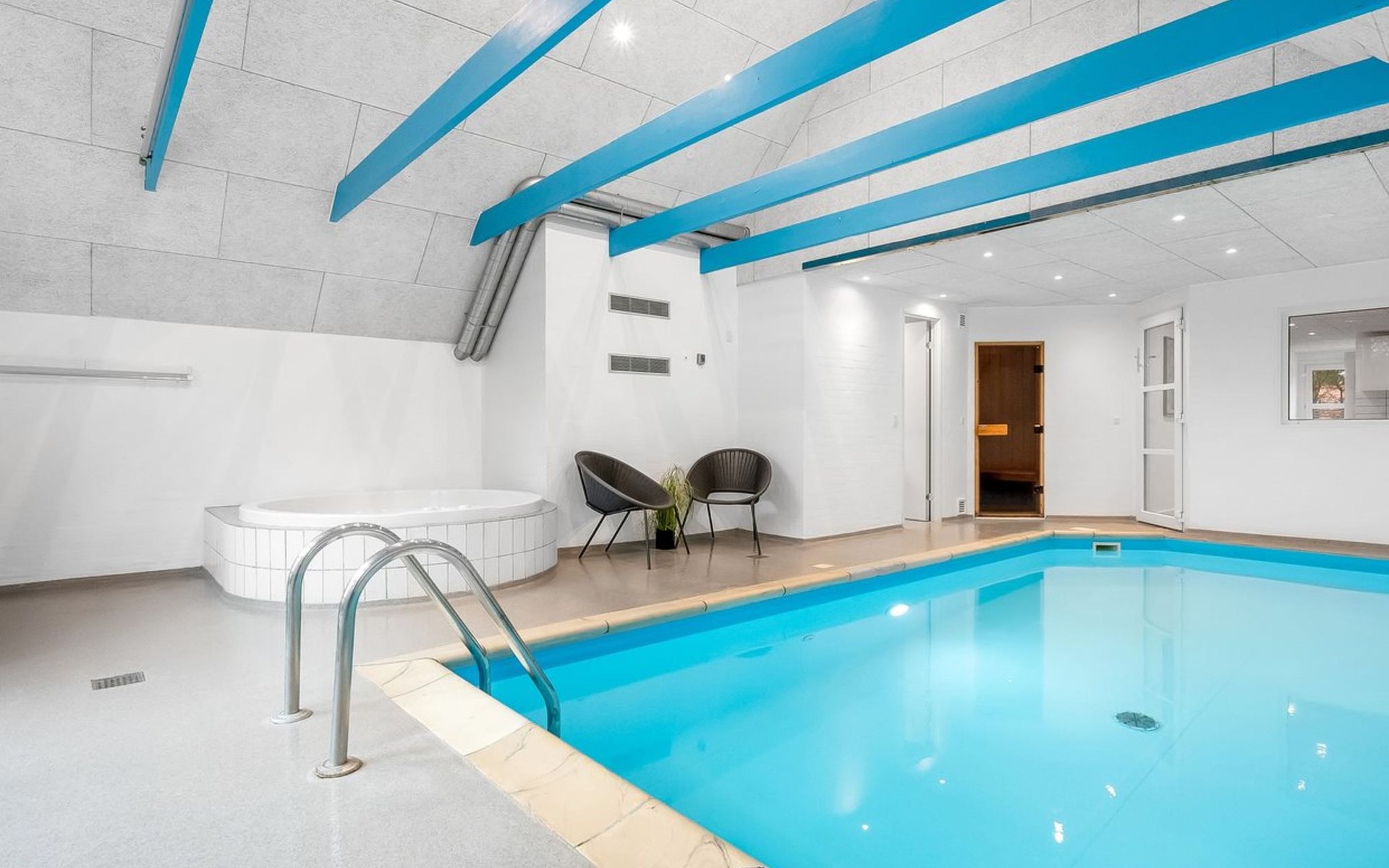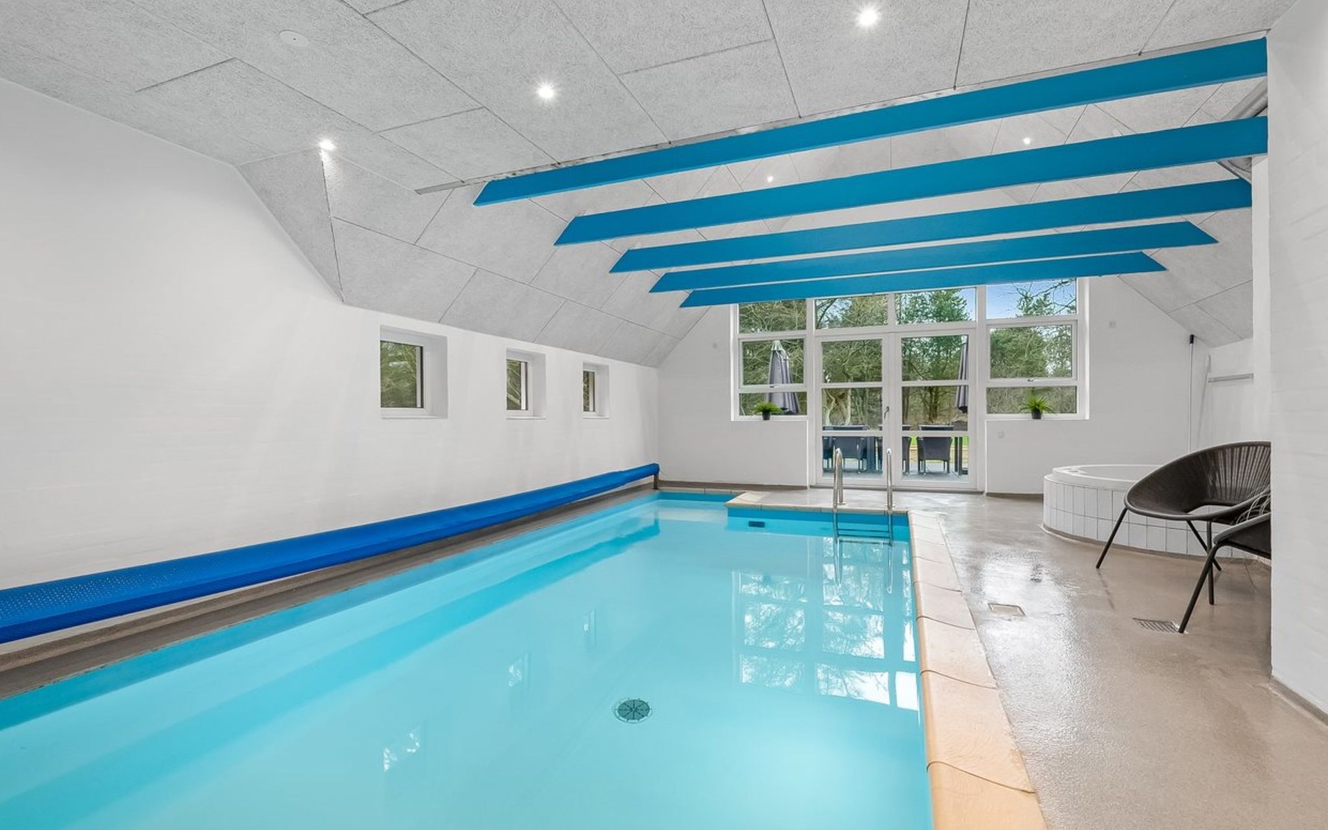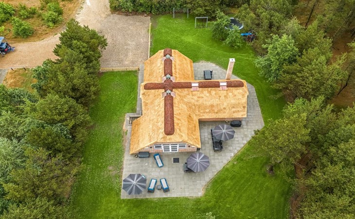 Single-family house, built in 1994. 2.5 km from the sea. Private: natural state property 2'286 m2, indoor pool (3 x 6 m, 18 m2, depth 140 - 140 cm). Terrace (220 m2), children's playground (slide, swing). In the house: sauna, trampoline, washing machine, tumble dryer. Parking at the house. E-charging station. Grocery 1 km. The owner does not accept any youth groups.