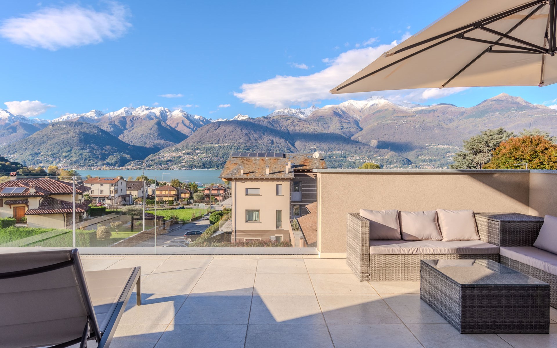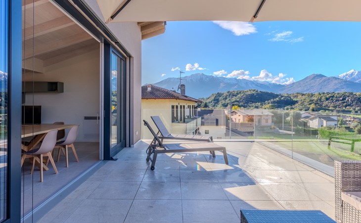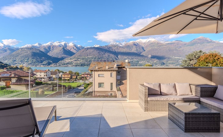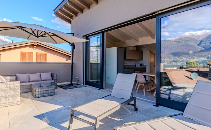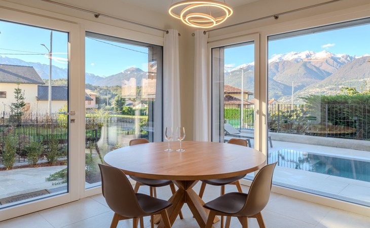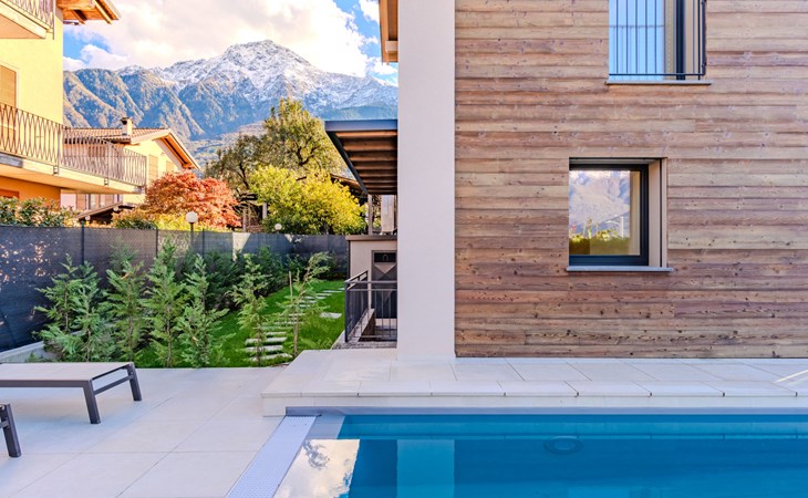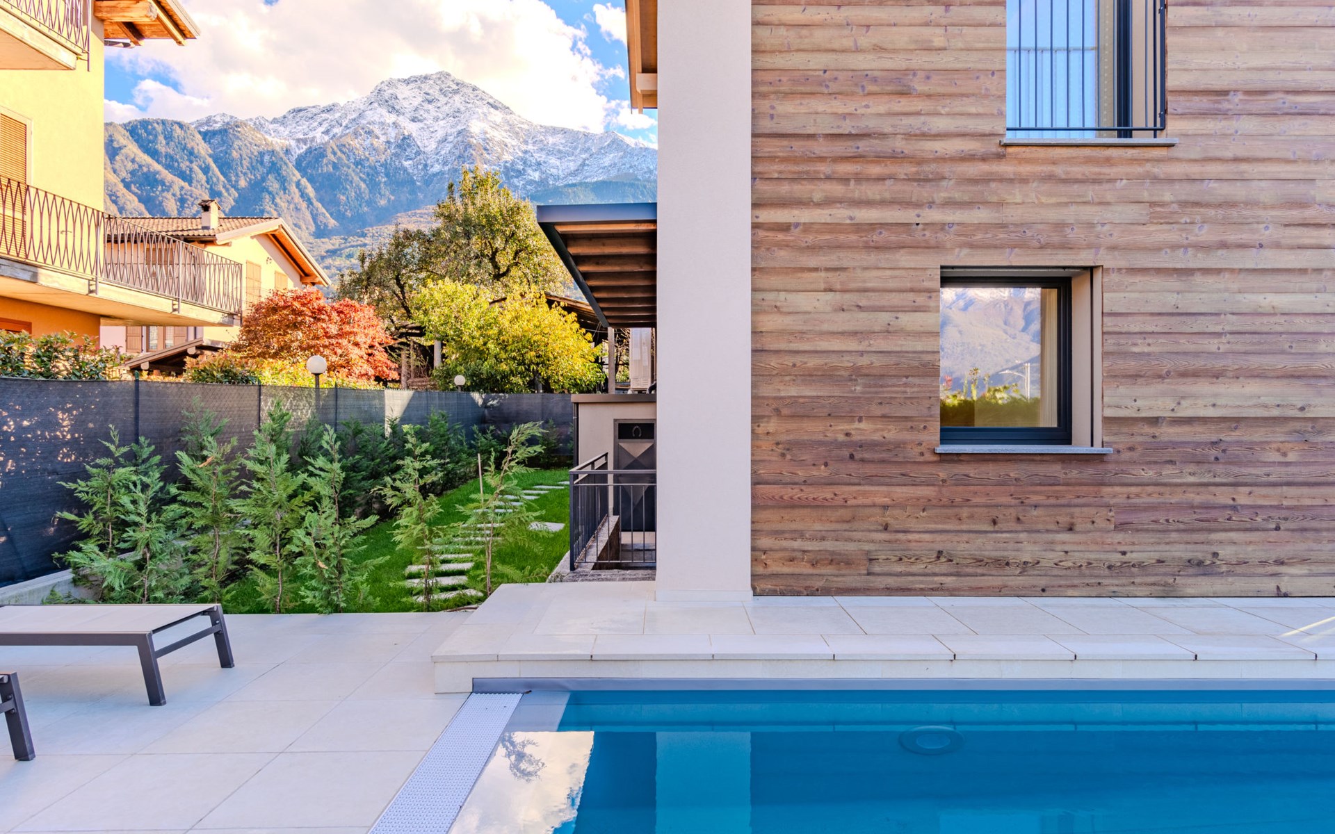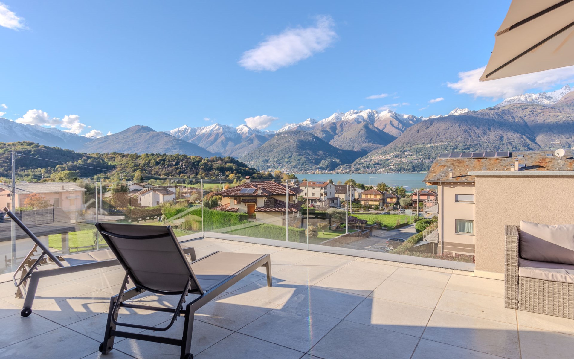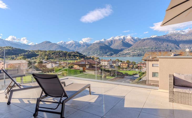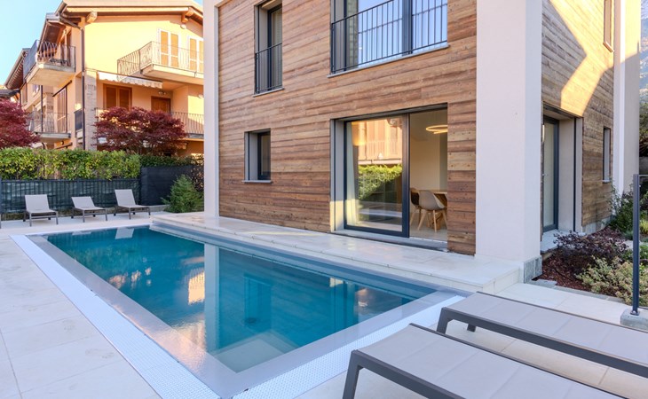 Large, modern house "Uliveto", 3 storeys, built in 2023. 650 m from the centre of Colico, 38 km from the centre of Lecco, 69 km from the centre of Como, in a central, elevated position, 700 m from the lake. Private: property 300 m2 (fenced) with lawn, swimming pool angular (3 x 8 m, depth 140 cm, seasonal availability: 01.Apr. - 30.Oct.). Outdoor shower, pool maintenance by the owner/gardener. In the house: storage room for bicycles. Linen change (suppl. charge extra). Room cleaning on request (extra). Parking (for 3 cars) on the premises, single garage. Supermarket 1.5 km, restaurant 450 m, bar 500 m, bakery, pedestrian zone 600 m, bus stop 900 m, railway station "Colico" 1 km, ferry 600 m, grass beach "Lido di Colico" 700 m. Golf course (18 hole) 37 km, surf school 1.5 km, riding stable 3.4 km, children's playground 1.1 km. Nearby attractions: Forte Montecchio Nord, Abbazia di Piona, Torri di Fontanedo. Well-known ski regions can easily be reached: Madesimo, Livigno. Well-known lakes can easily be reached: Lago di Mezzola. Hiking paths: Pian di Spagna, Monte Legnone. The owner does not accept any youth groups.