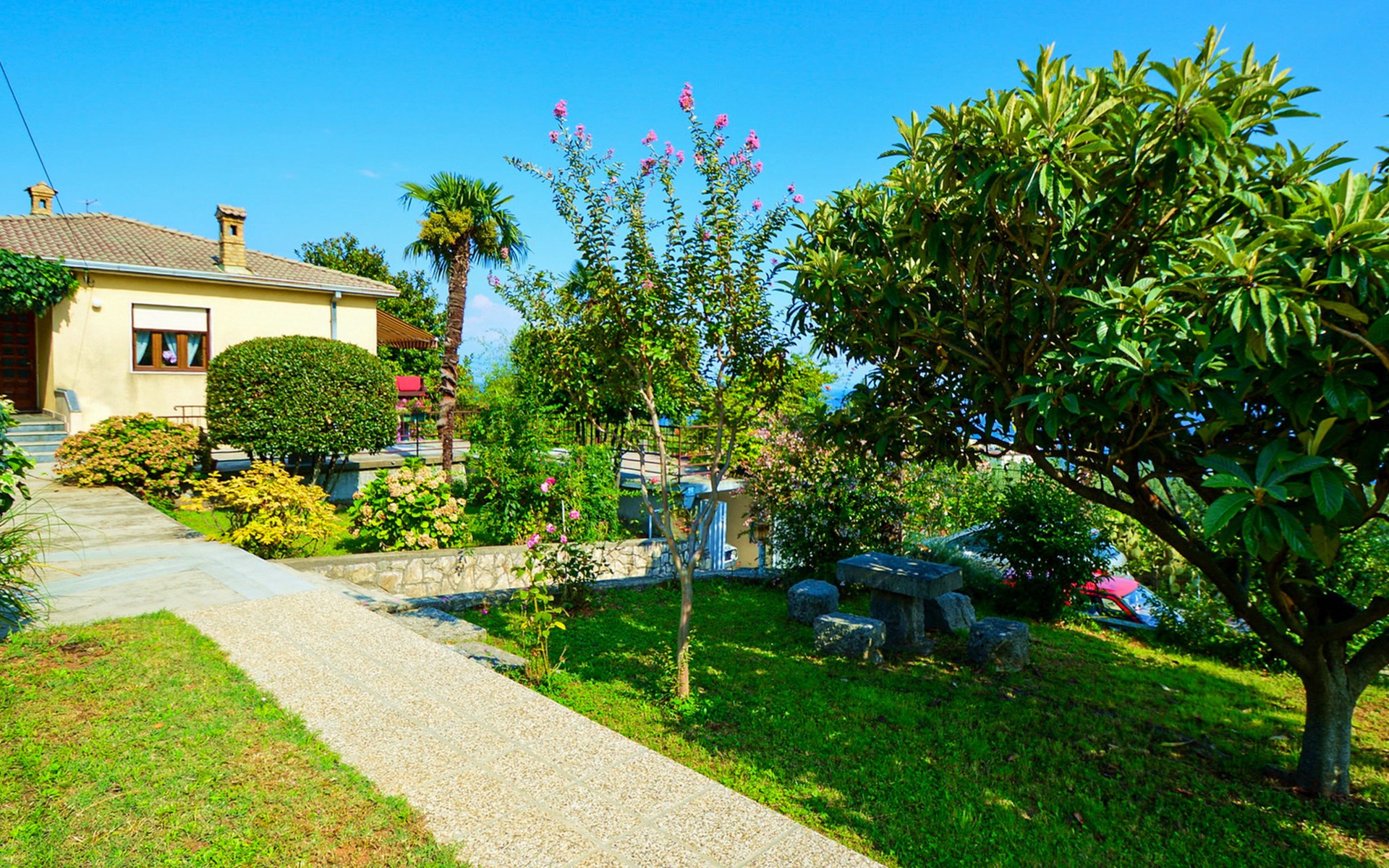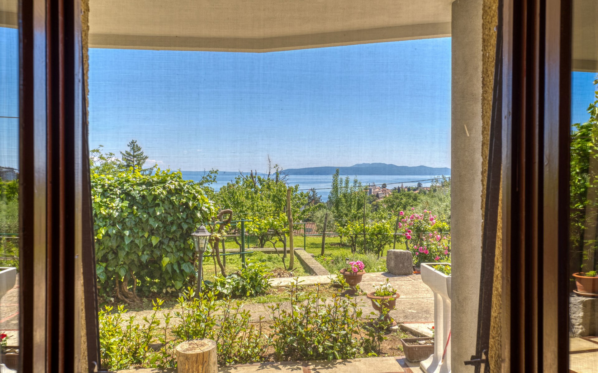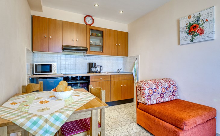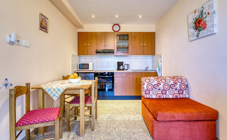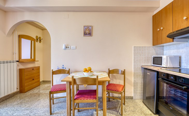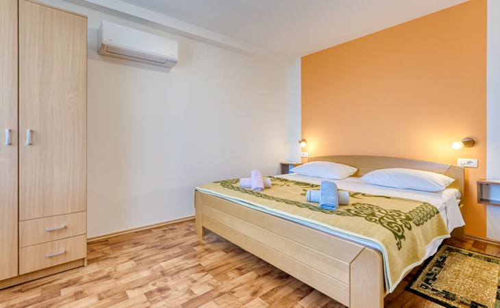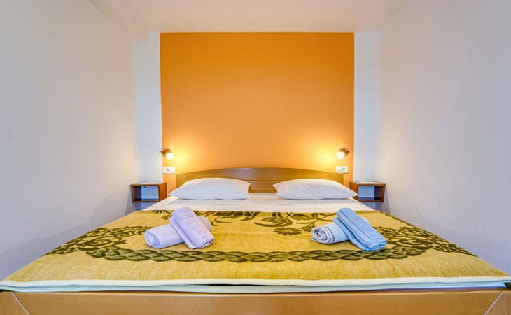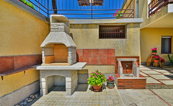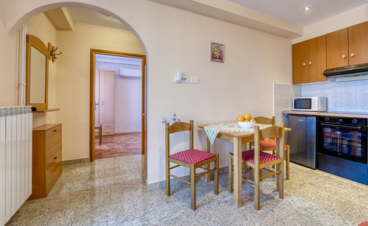 Apartment house "Marija". 900 m from the centre, in a quiet, sunny position on a slope, 650 m from the sea, 650 m from the beach, in the countryside. For shared use: garden lawn 60 m2, plants. Barbecue. In the house: internet access, central heating system. Narrow motor access. Parking at the house on the premises. Shop 350 m, supermarket 1 km, restaurant, café, bus stop 500 m, pebble beach, rocky beach, public bathing area 650 m. Tennis 550 m.