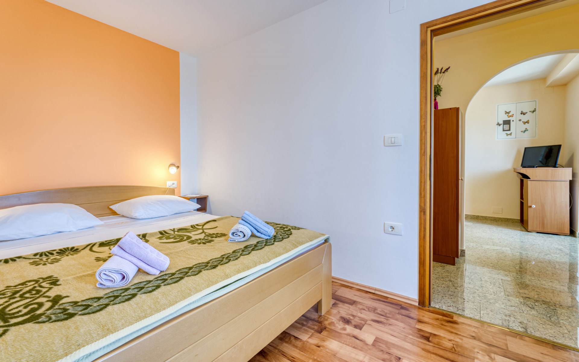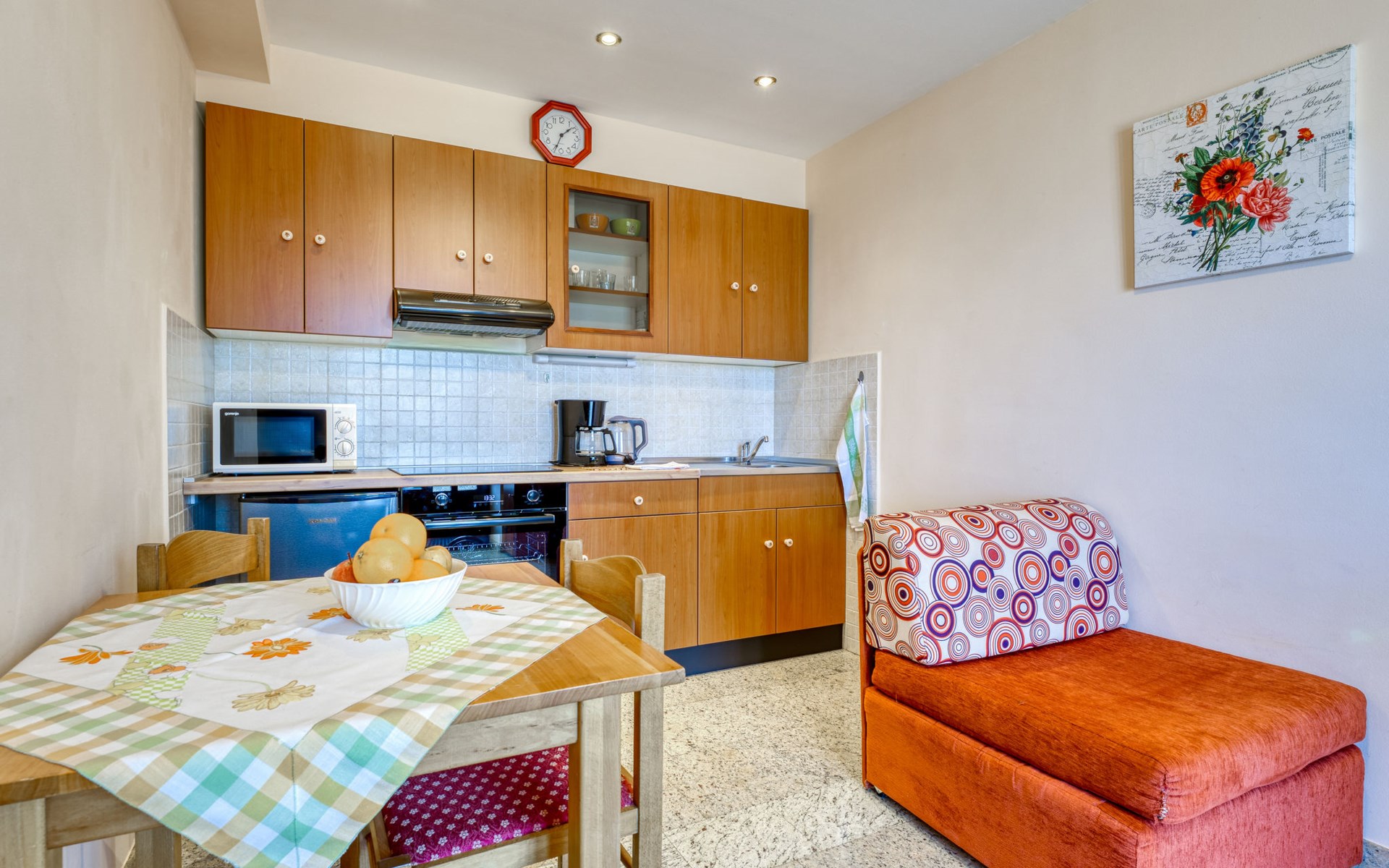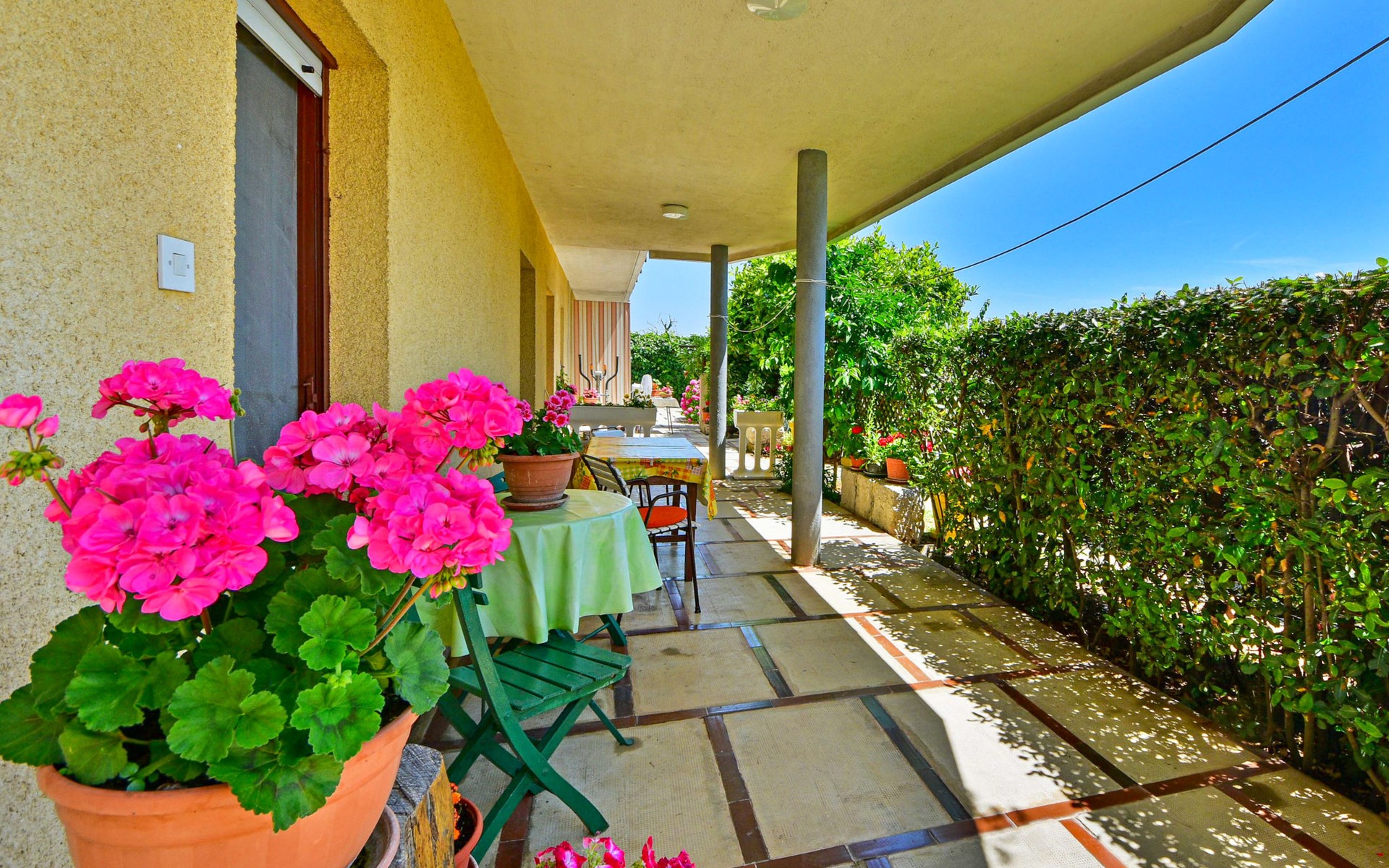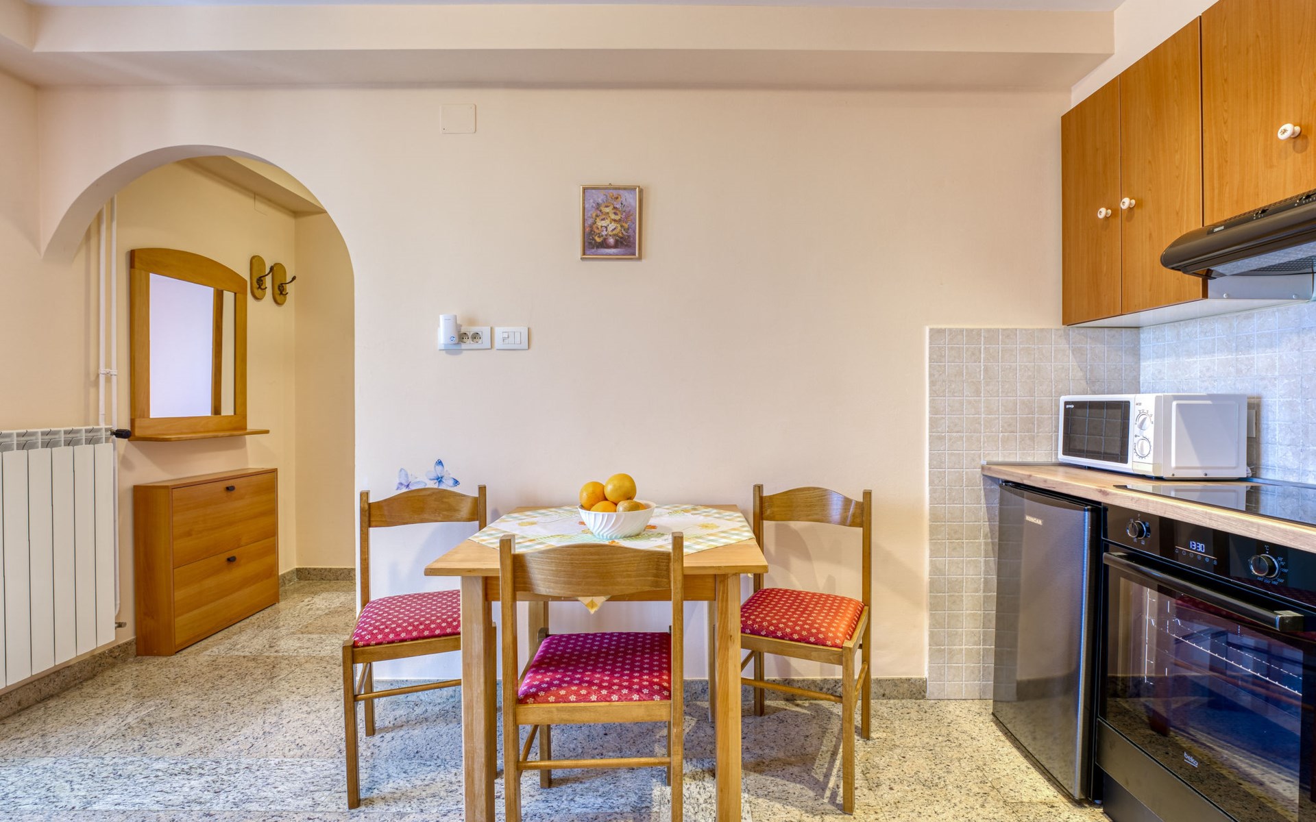 Apartment house "Marija". 900 m from the centre, in a quiet, sunny position on a slope, 650 m from the sea, 650 m from the beach, in the countryside. For shared use: garden lawn 60 m2, plants. Barbecue. In the house: internet access, central heating system. Narrow motor access. Parking at the house on the premises. Shop 350 m, supermarket 1 km, restaurant, café, bus stop 500 m, pebble beach, rocky beach, public bathing area 650 m. Tennis 550 m.