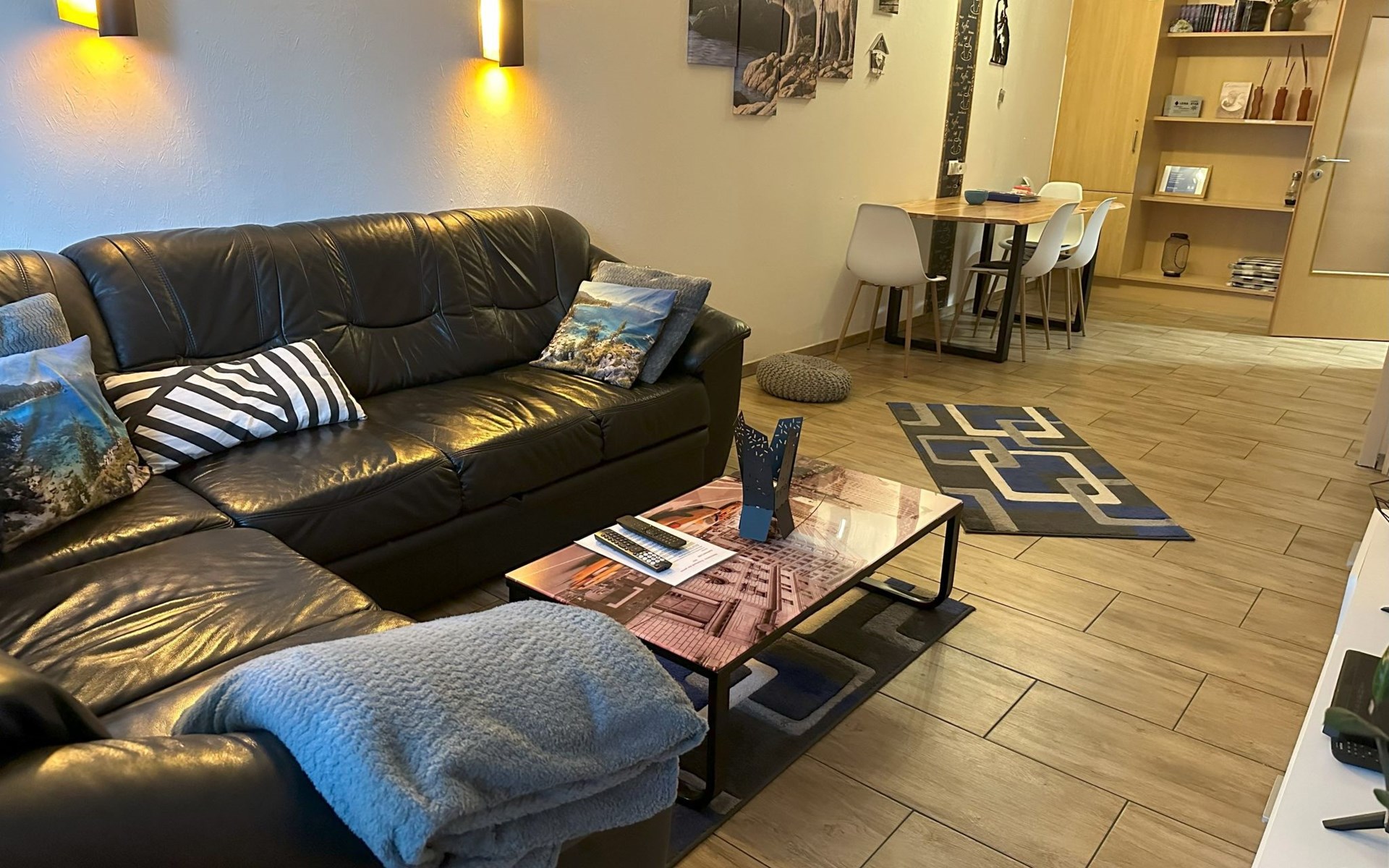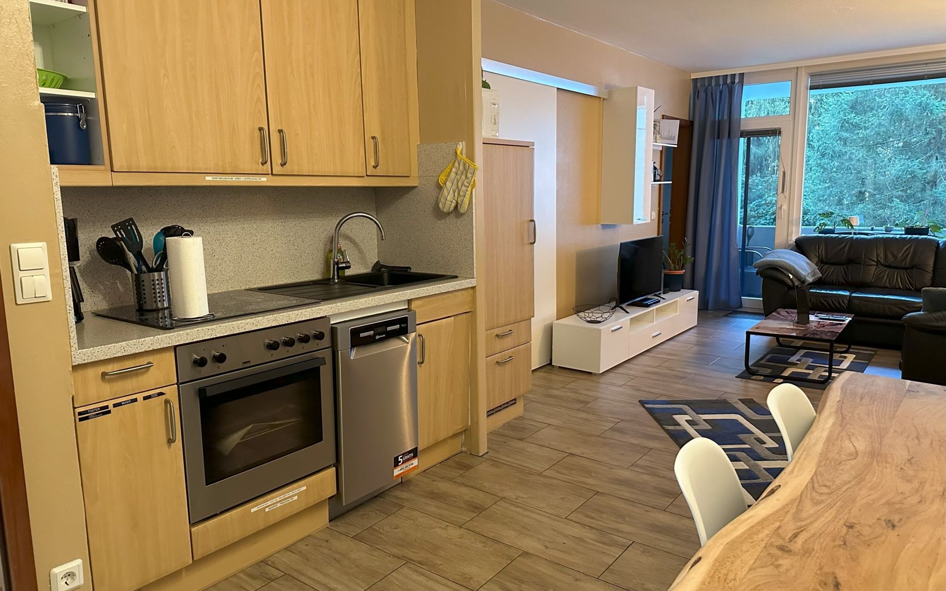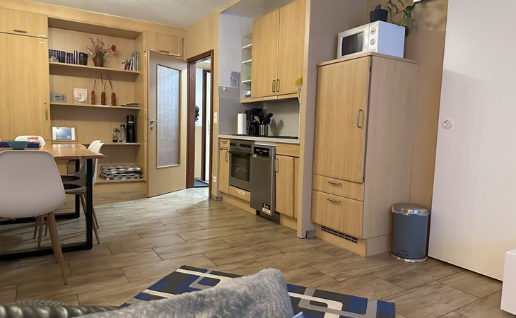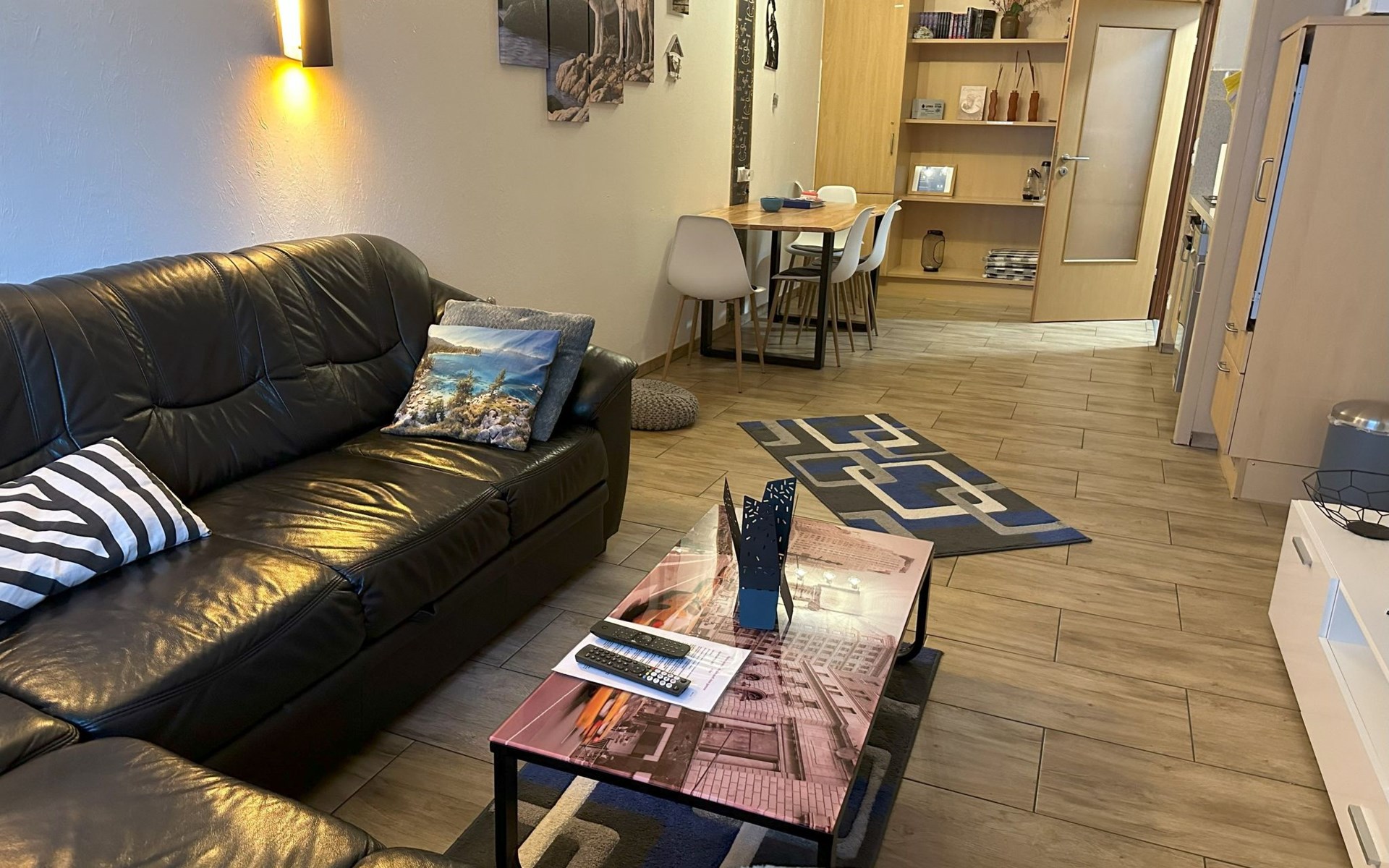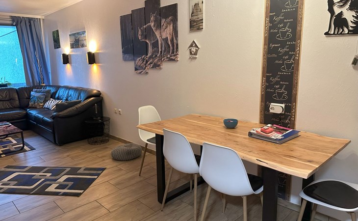 Inside, the flat impresses with its modern and high-quality furnishings. The combined living/dining room with open-plan kitchen leaves nothing to be desired: A leather sofa, a large dining table for 5 and a fully equipped kitchenette guarantee a pleasant stay. Two bedrooms with box-spring beds, including a double bed and two single beds, offer excellent sleeping comfort. The interior is complemented by two newly tiled bathrooms, one with a walk-in shower, and free high-speed WiFi as well as a GIGA TV box from Vodafone including Netflix for entertainment in the evening.