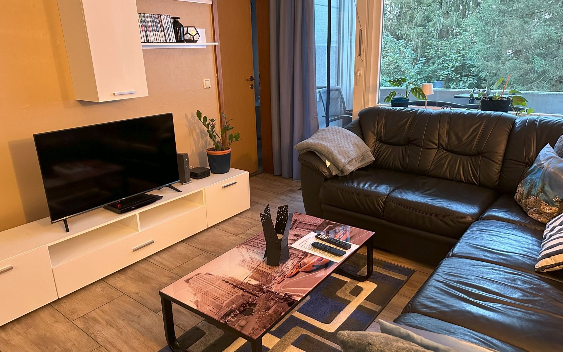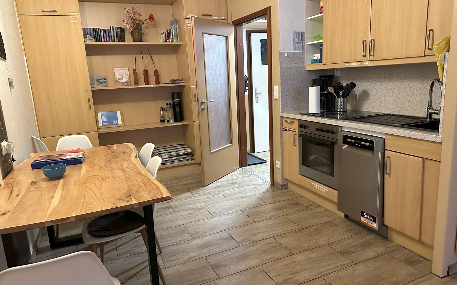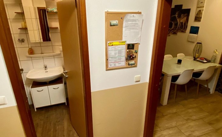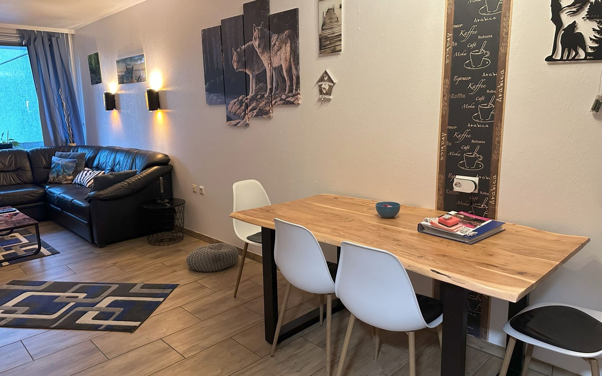 Inside, the flat impresses with its modern and high-quality furnishings. The combined living/dining room with open-plan kitchen leaves nothing to be desired: A leather sofa, a large dining table for 5 and a fully equipped kitchenette guarantee a pleasant stay. Two bedrooms with box-spring beds, including a double bed and two single beds, offer excellent sleeping comfort. The interior is complemented by two newly tiled bathrooms, one with a walk-in shower, and free high-speed WiFi as well as a GIGA TV box from Vodafone including Netflix for entertainment in the evening.