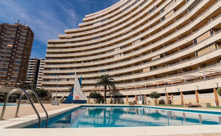 Playa de la Fossa: Apartment block "Voramar", 15 storeys. 1.8 km from the centre of Calpe, in a busy, sunny position, 10 m from the sea, from the beach, direct access to the beach. For shared use: property (fenced), garden, 3 swimming pools (seasonal availability: 01.May. - 31.Oct.). Children's pool, outdoor shower, terrace. In the house: lift. Supermarket, restaurant 50 m, bar 100 m, pub garden 10 m, bus stop, sandy beach "Playa de la Fossa" 10 m. Sports harbour, marina 350 m, golf course (9 hole) 10.5 km, surf school, sailing school. Nearby attractions: Aqualandia, Terra MÃtica, Mundomar, Terra Natura, Benidorm Palace (Benidorm). The owner does not accept any youth groups. Residence with electric gates.