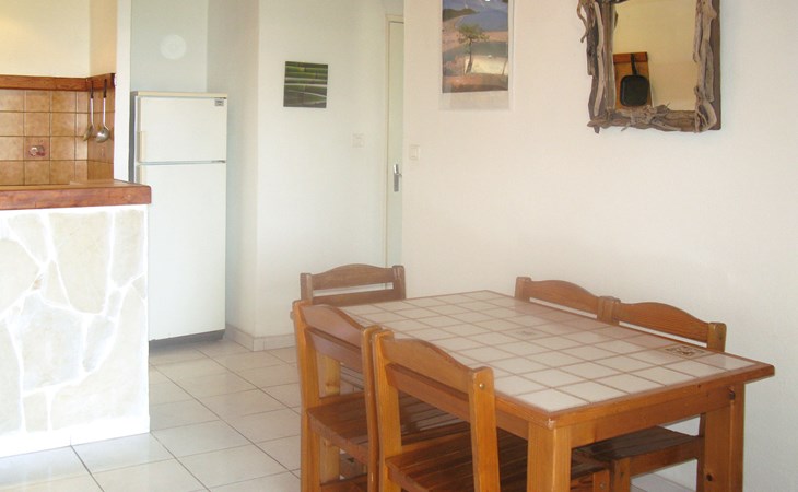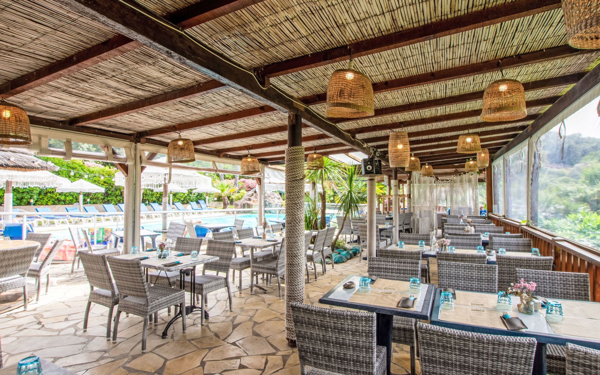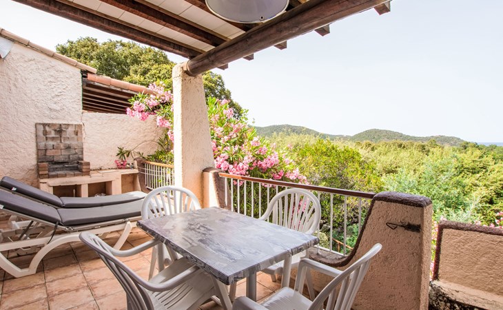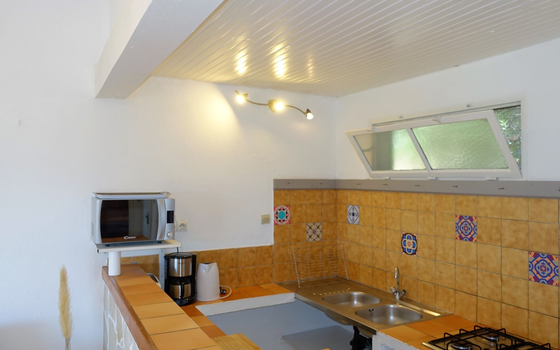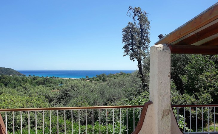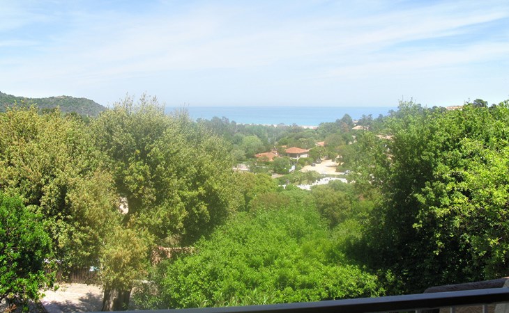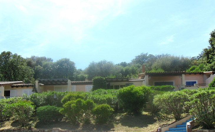 Olmucciu 8 km from Pinarellu: Small, cosy resort "Fium del Cavu". 25 houses in the residence. In the district of Olmucciu 8 km from the centre of Pinarellu, 16 km from the centre of Porto Vecchio, 131 km from the centre of Bastia, in a sunny position on a slope, 500 m from the sea, 500 m from the beach, 500 m from the river, in a cul-de-sac, in the countryside. For shared use: beautiful terraced garden with plants and trees, meadow, swimming pool fenced (16 x 8 m, seasonal availability: 14.May. - 28.Oct.). Outdoor shower, terrace. In the complex: reception, restaurant, bar, WiFi, billiard table. Parking on the premises. Shop 5 km, supermarket 16 km, bus stop 5 km, sandy beach "Plage de l'Ovu Santu" 500 m. Tennis 250 m. Please note: car recommended. The photograph shows a typical example. Wifi only at the reception.