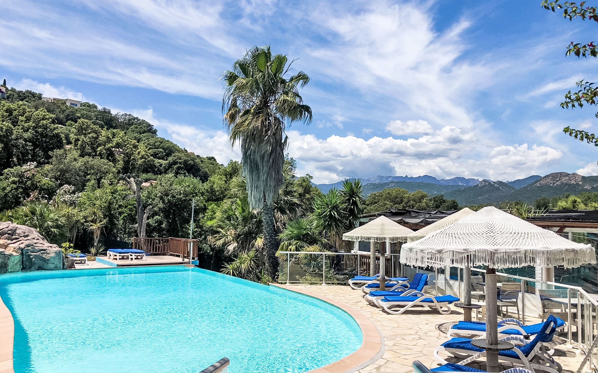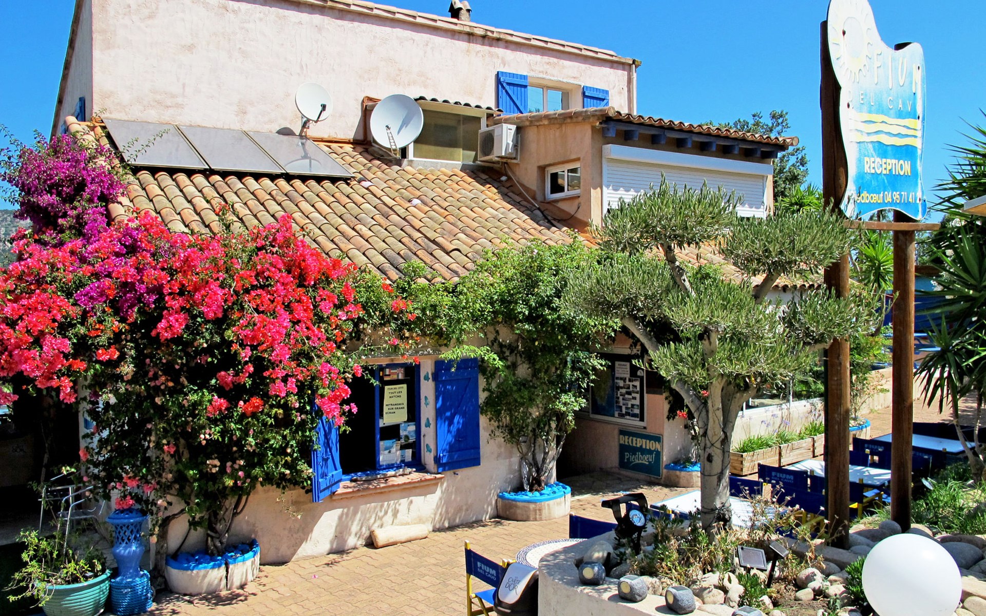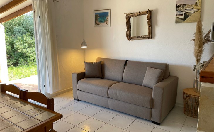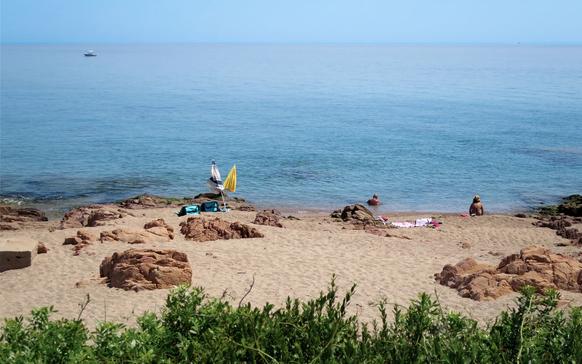 Olmucciu 8 km from Pinarellu: Small, cosy resort "Fium del Cavu". 25 houses in the residence. In the district of Olmucciu 8 km from the centre of Pinarellu, 16 km from the centre of Porto Vecchio, 131 km from the centre of Bastia, in a sunny position on a slope, 500 m from the sea, 500 m from the beach, 500 m from the river, in a cul-de-sac, in the countryside. For shared use: beautiful terraced garden with plants and trees, meadow, swimming pool fenced (16 x 8 m, seasonal availability: 14.May. - 28.Oct.). Outdoor shower, terrace. In the complex: reception, restaurant, bar, WiFi, billiard table. Parking on the premises. Shop 5 km, supermarket 16 km, bus stop 5 km, sandy beach "Plage de l'Ovu Santu" 500 m. Tennis 250 m. Please note: car recommended. The photograph shows a typical example. Wifi only at the reception.
