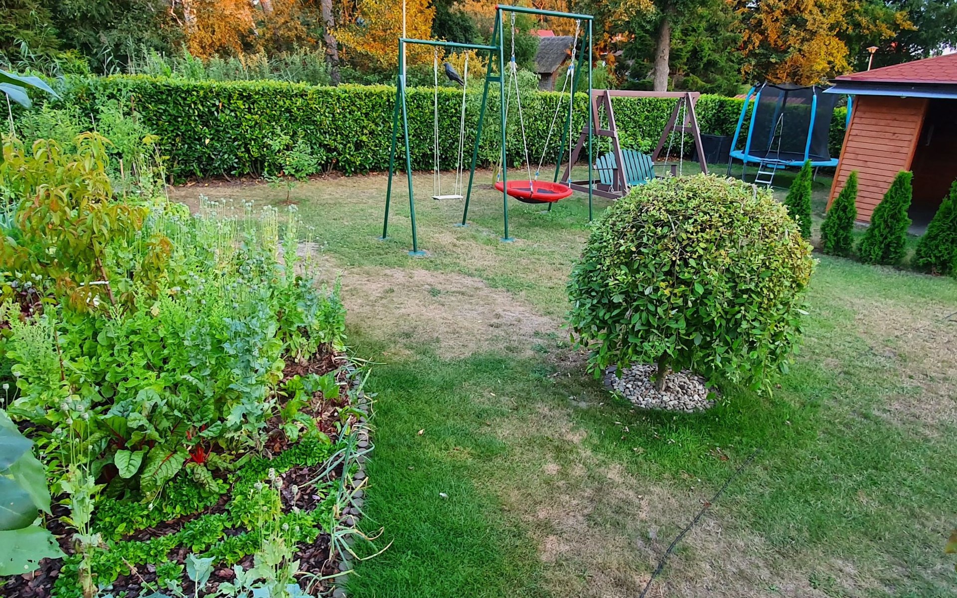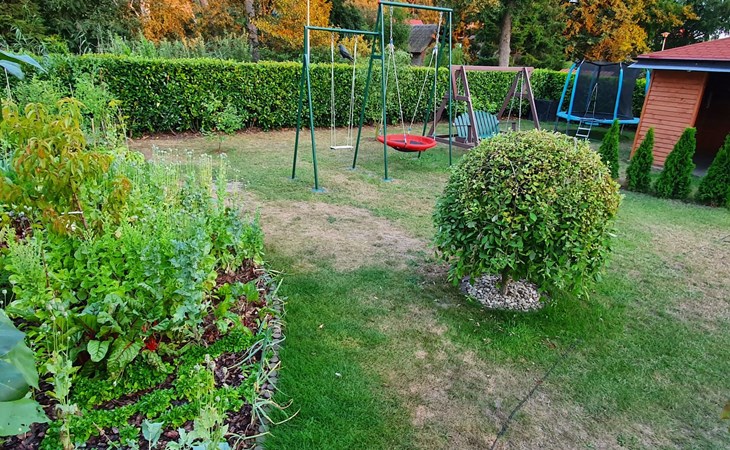 The plot is generally 1200 square metres in size. A children's swing and a gazebo for barbecues are available for all guests, as is a vegetable garden which guests can use.