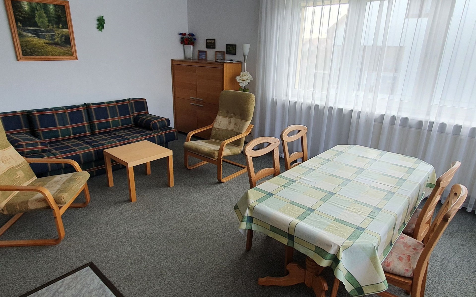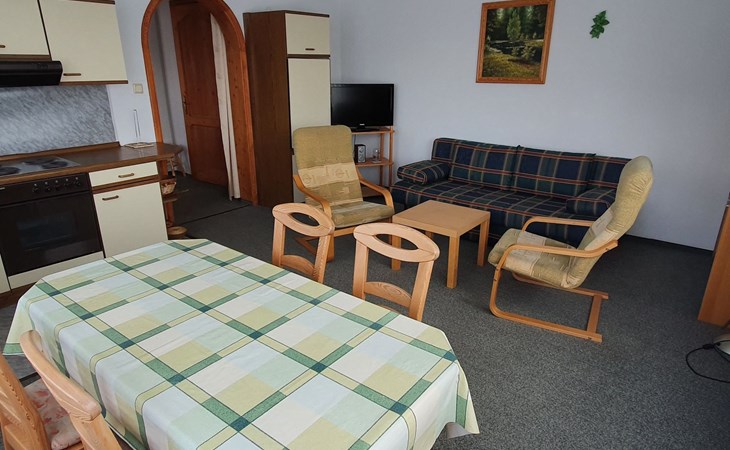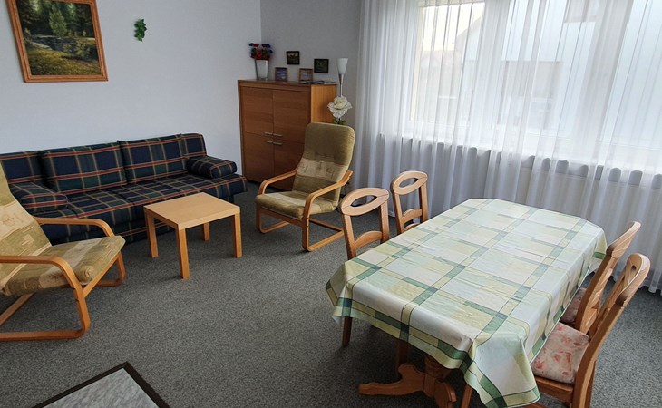 Tastefully and more than just functionally furnished 2-room flat on the 1st floor. Living/bedroom with pull-out double sofa bed, wardrobe and dining area with table and chairs, as well as integrated complete kitchenette, electric cooker with 4 hotplates, oven, fridge, coffee machine, electric kettle, pots and pans and crockery. A separate double bedroom, wardrobe, shower/WC, satellite TV with German programmes, WLAN and heating. Large garden with garden furniture, children's swing, barbecue, bicycles on request. Car parking space on the fenced garden property.