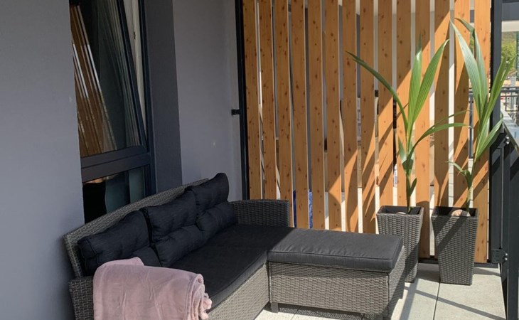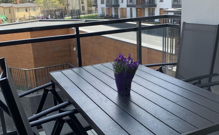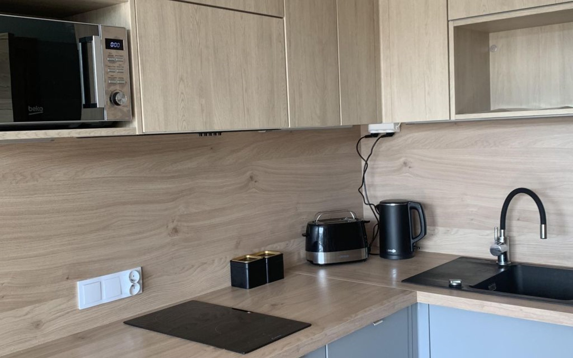 The flat consists of one bedroom with a double bed, which can be converted into two separate beds upon request, and a living room with a kitchenette. This area has a double sofa bed and dining table, 4 chairs, flat screen TV. The kitchenette is fully equipped: cob and sachet coffee maker, toaster, induction cooktop, dishwasher, kettle, microwave, plates, cutlery, pots, pans and other necessary kitchen utensils. The bathroom has a shower cubicle. The property provides free towels, bed linen and hotel toiletries. The flat has a large, comfortable terrace- 11 m2. The terrace has a dining table, 4 chairs and a sofa with a chaise longue. Baby chair and cot - on request.The flat has a free parking space in the garage under the building. The property is monitored.