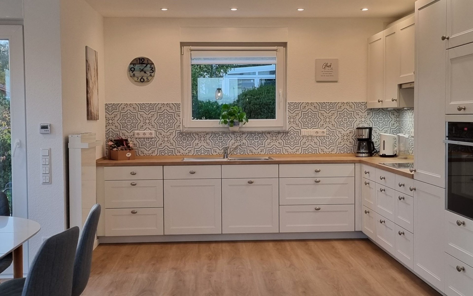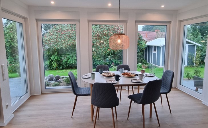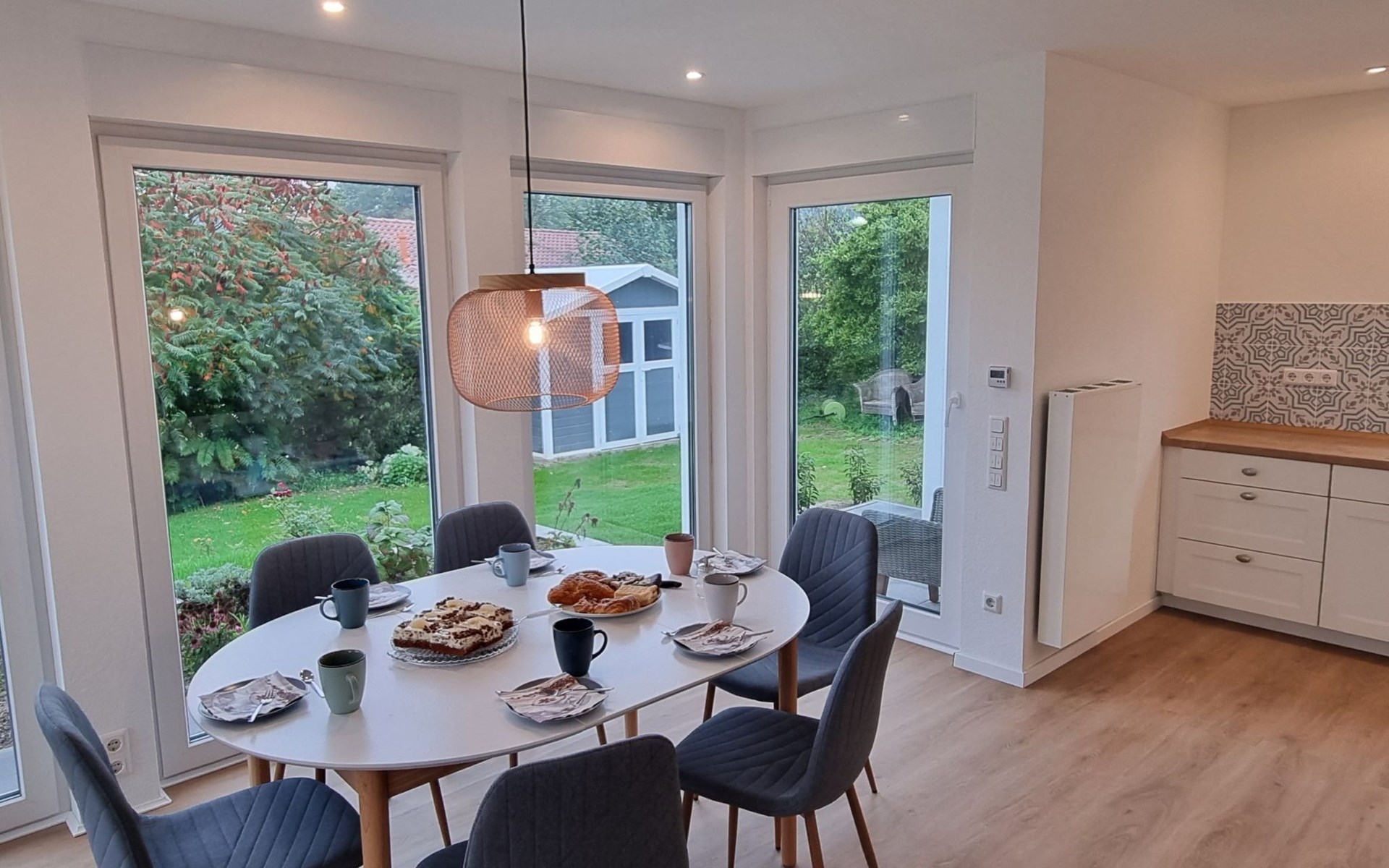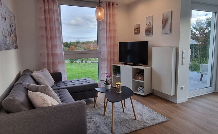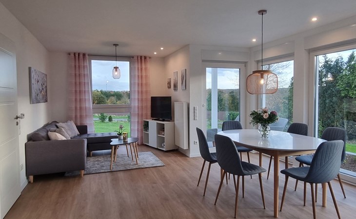 Open-plan living area of 31 m² with large kitchen, dining table in the bay window, cosy sofa corner with a view of the outdoors and satellite TV