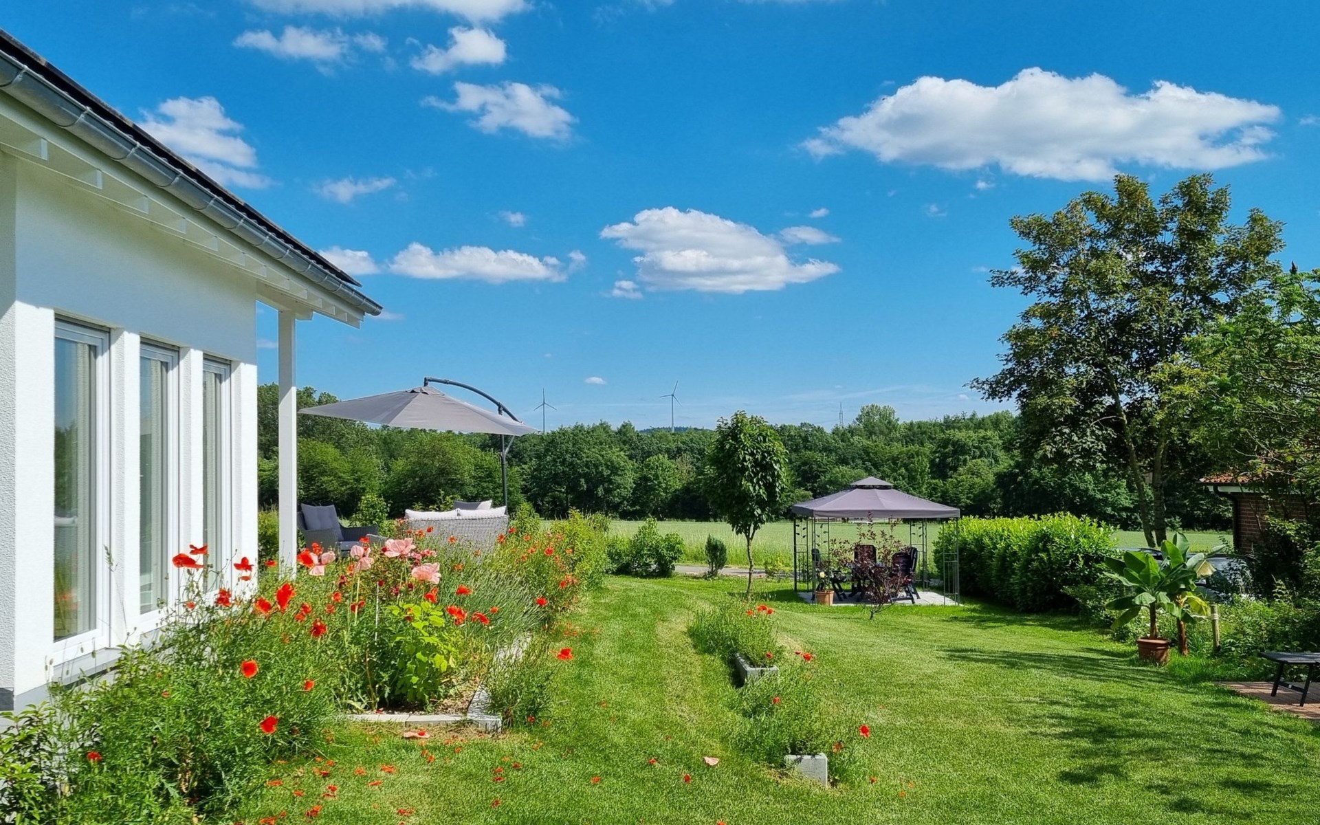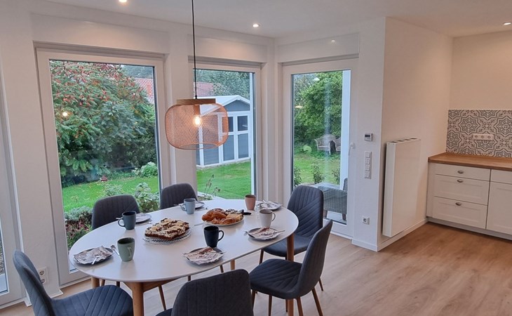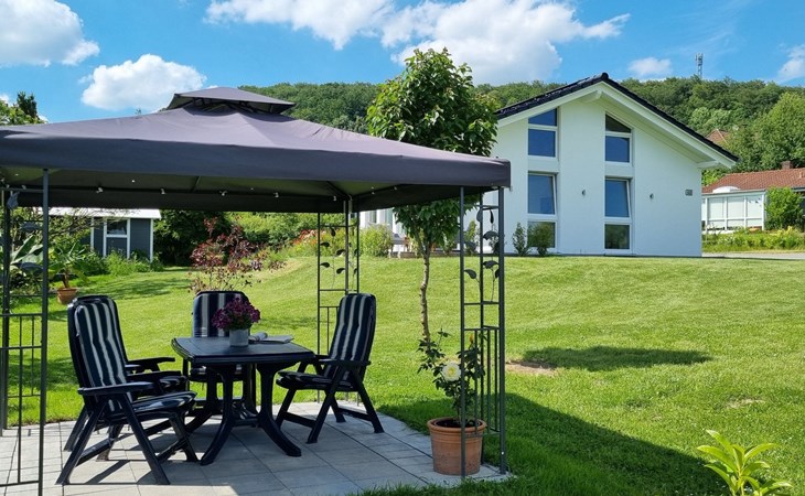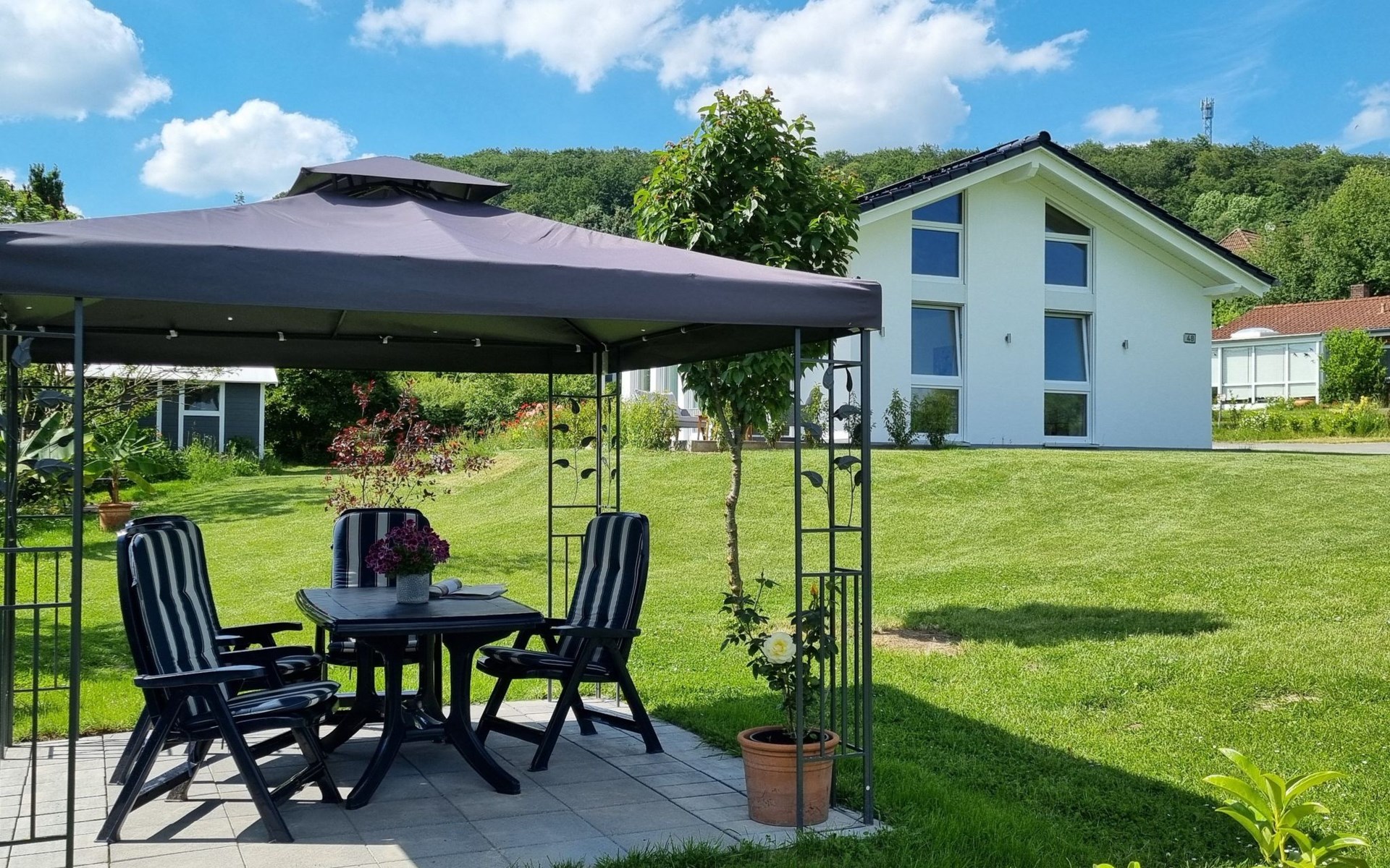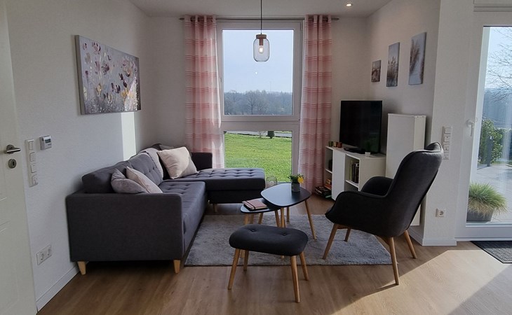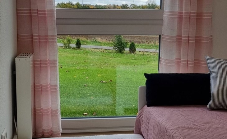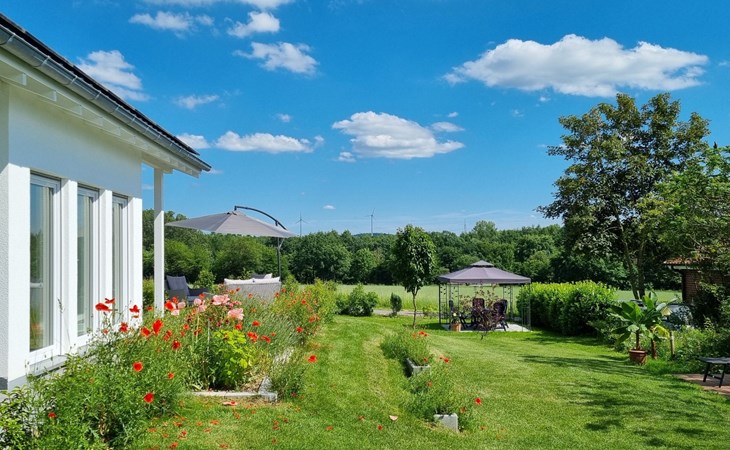The house is located in the climatic health resort of Vörden on the southern slope of the Hungerberg in western Weserbergland, not far from the former Benedictine abbey of Marienmünster. It offers space for three adults plus one child. We are happy to provide an additional travel cot for babies/toddlers.