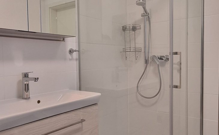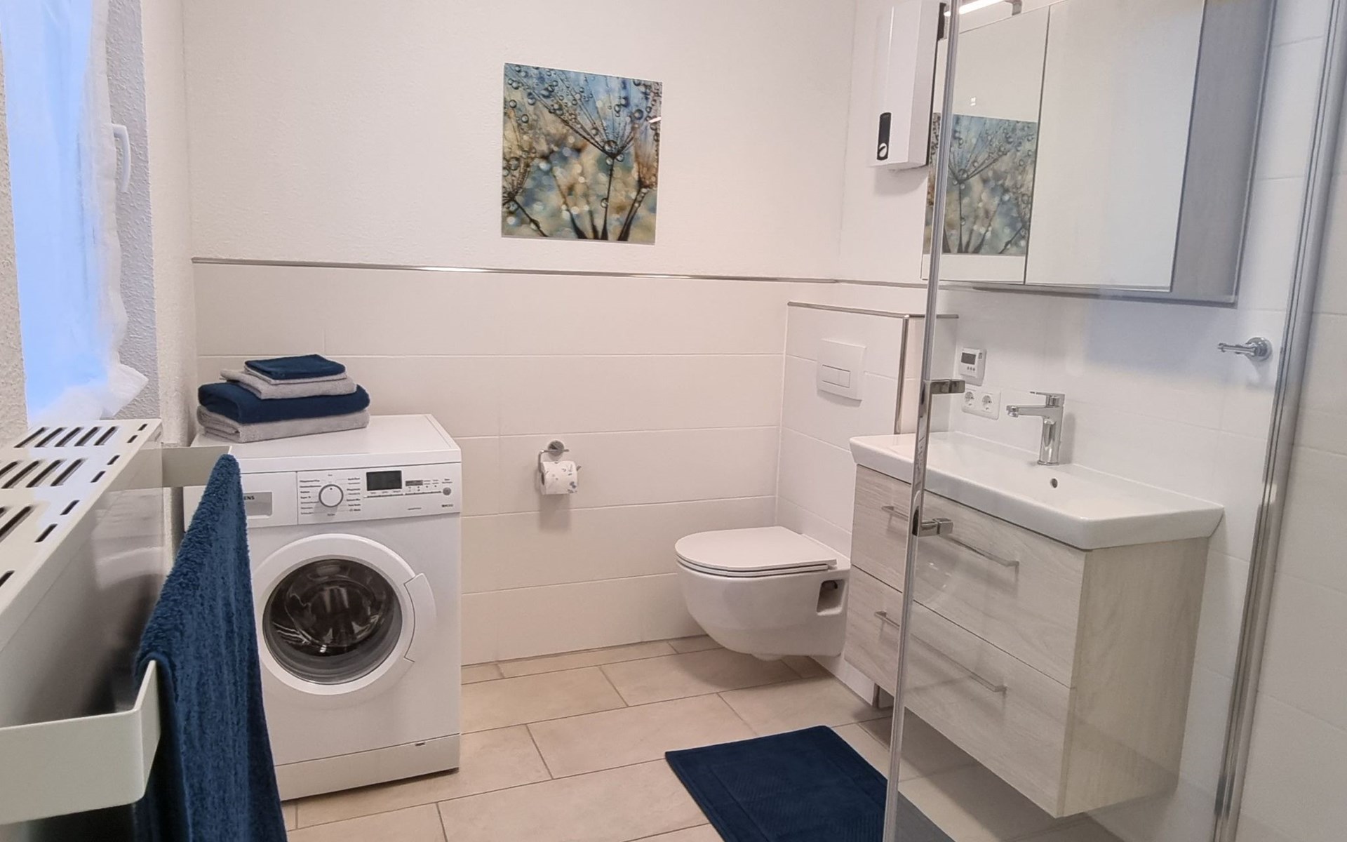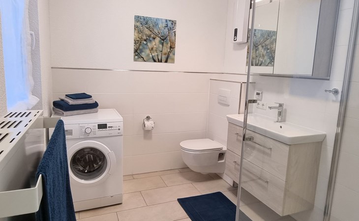 The bathroom is fully equipped with WC, washbasin with mirror cabinet, shower, washing machine, hairdryer.