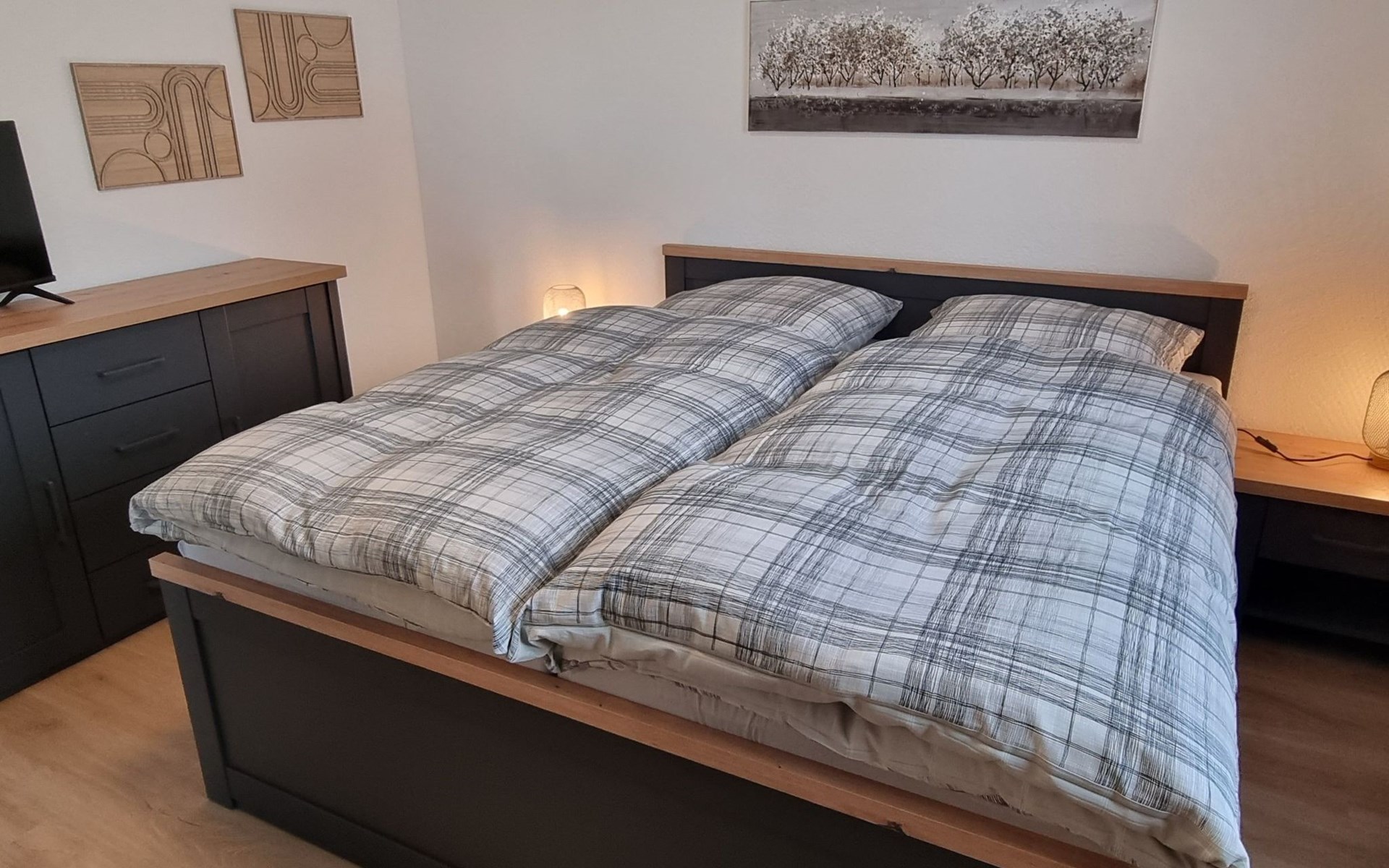 The large bedroom is equipped with: Double bed 1.80m x 2.00m (two mattresses 0.90m x 2.00m, large wardrobe, two bedside tables, chest of drawers, satellite TV.