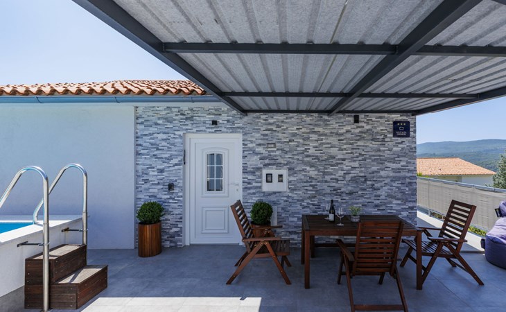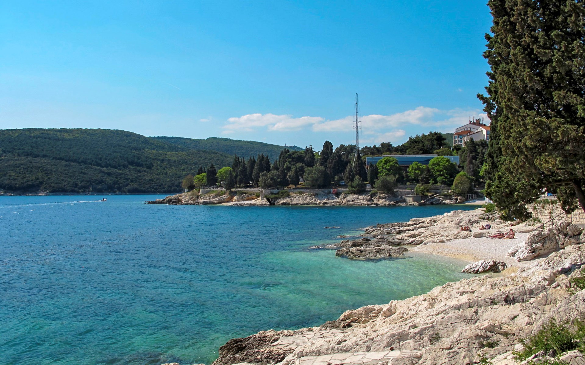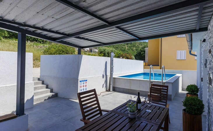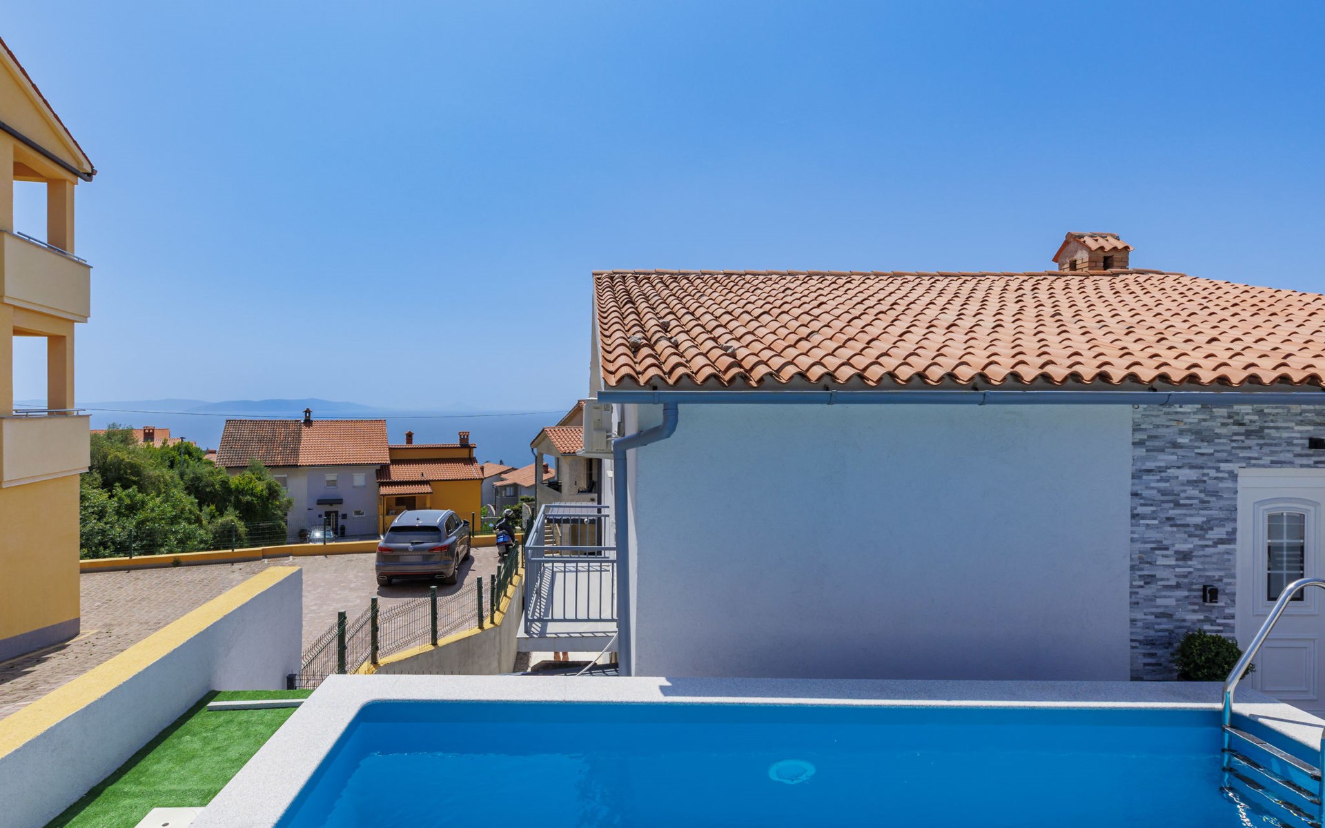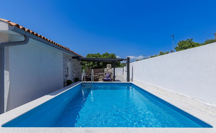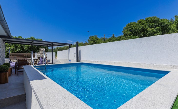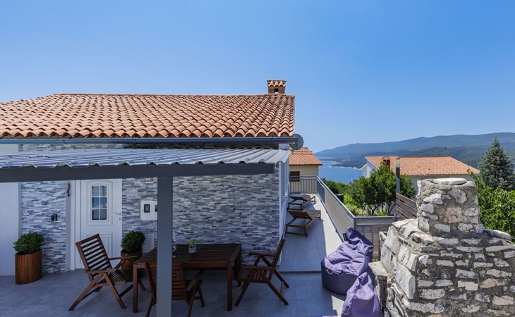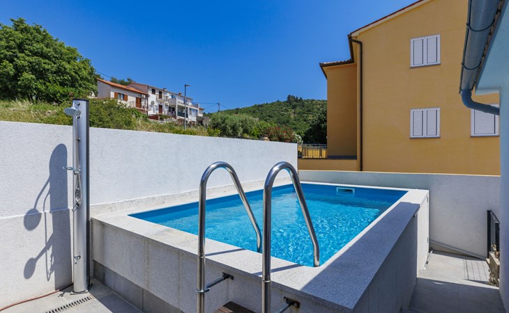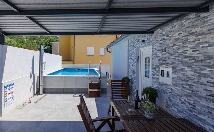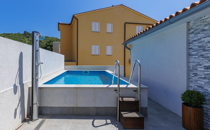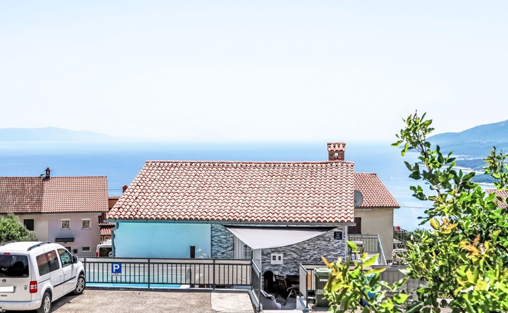 2-family house "Tatiana". 1.7 km from the centre of Rabac, 6 km from the centre of Labin, in a sunny position on a slope, 1.7 km from the sea, 1.7 km from the beach. Private: swimming pool angular (5 x 3 m, depth 140 cm, seasonal availability: 01.Jun. - 12.Oct.) with salt-electrolysis pool-cleaning system. Outdoor shower, terrace (20 m2), garden furniture, barbecue, pool maintenance by the owner/gardener. In the house: internet access. Parking (for 2 cars) at the house on the premises. Shop 1 km, supermarket 7 km, restaurant 1 km, bus stop 1.8 km, pebble beach 1.7 km. Please note: airfield 45 km from the property.