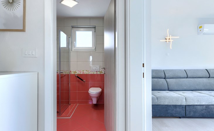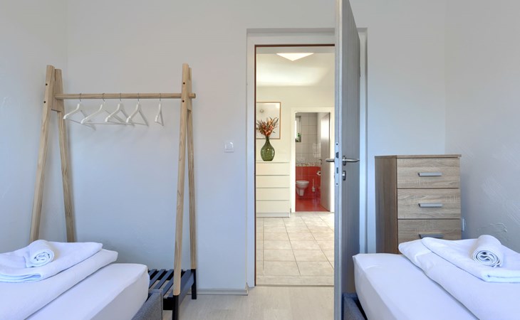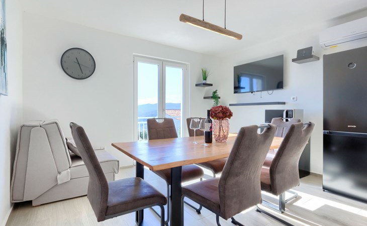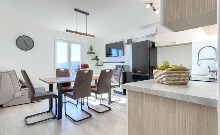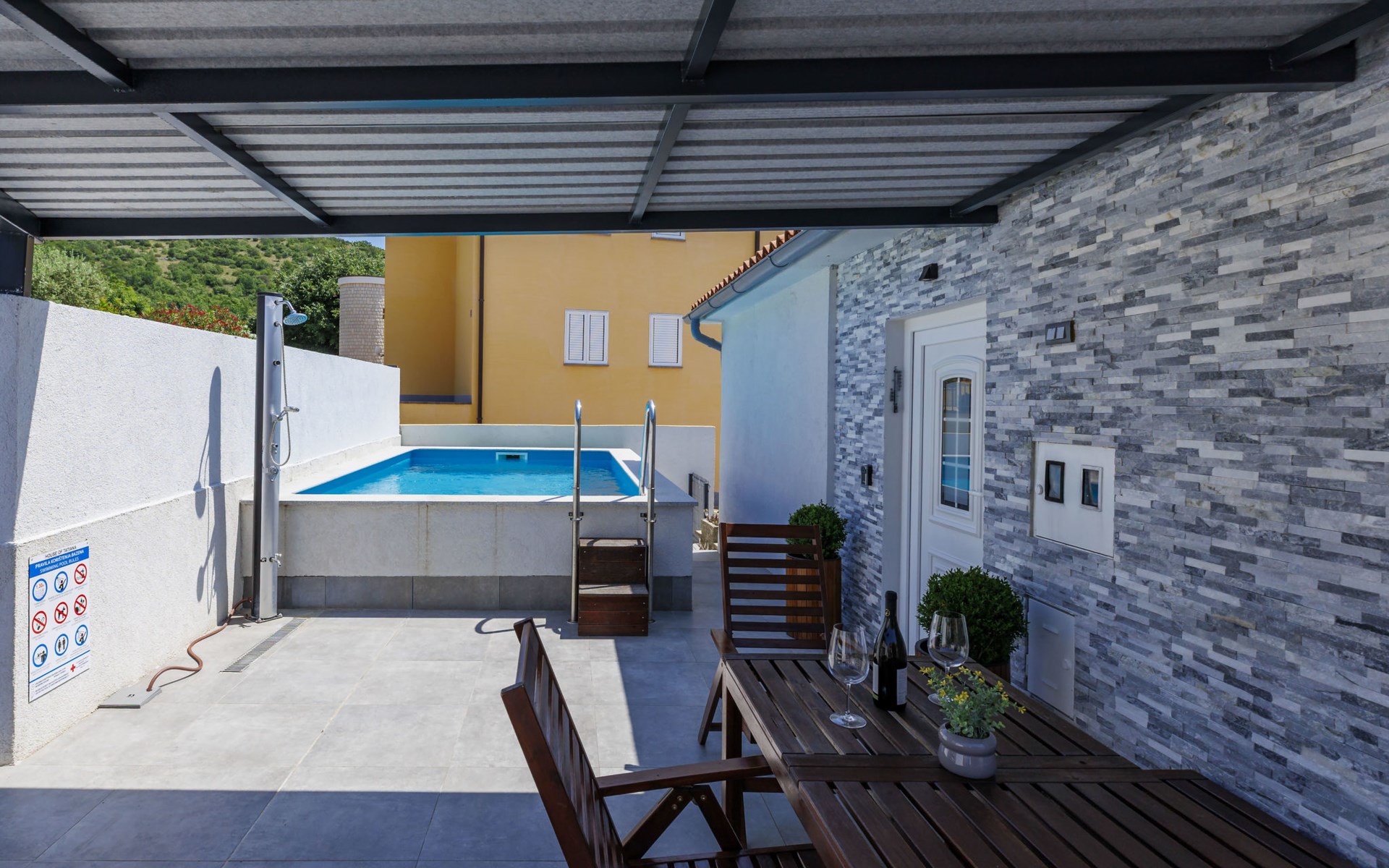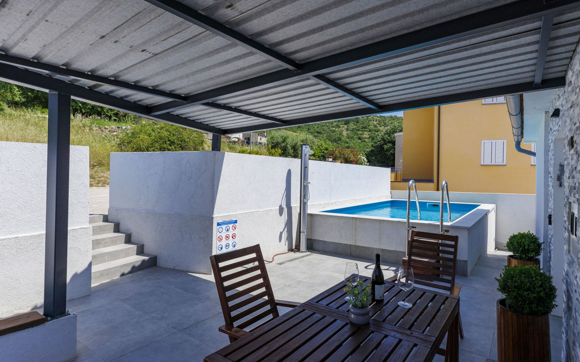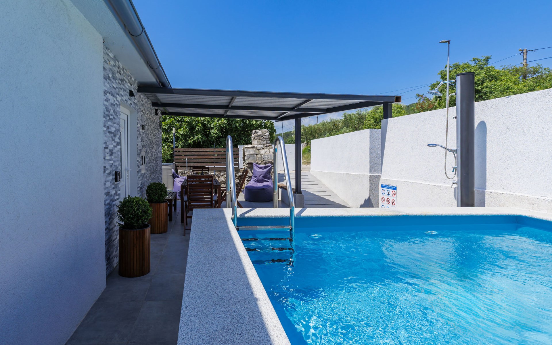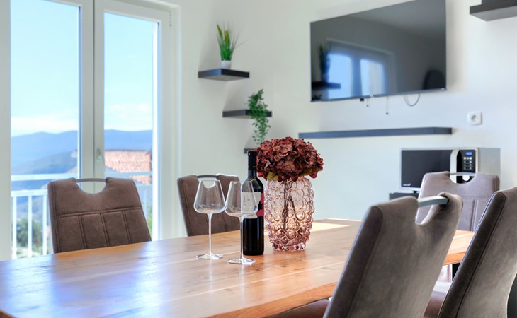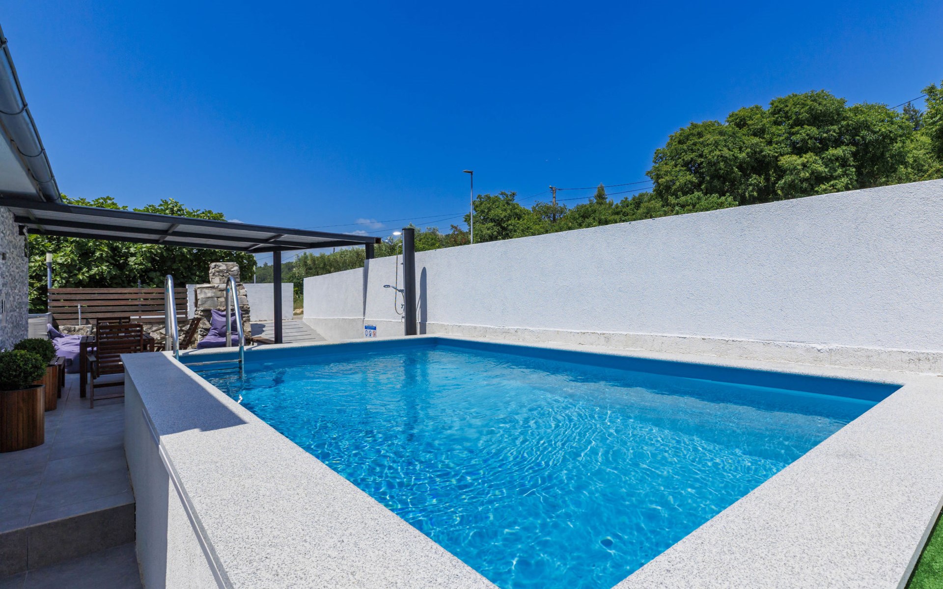 2-family house "Tatiana". 1.7 km from the centre of Rabac, 6 km from the centre of Labin, in a sunny position on a slope, 1.7 km from the sea, 1.7 km from the beach. Private: swimming pool angular (5 x 3 m, depth 140 cm, seasonal availability: 01.Jun. - 12.Oct.) with salt-electrolysis pool-cleaning system. Outdoor shower, terrace (20 m2), garden furniture, barbecue, pool maintenance by the owner/gardener. In the house: internet access. Parking (for 2 cars) at the house on the premises. Shop 1 km, supermarket 7 km, restaurant 1 km, bus stop 1.8 km, pebble beach 1.7 km. Please note: airfield 45 km from the property.