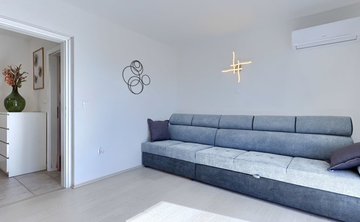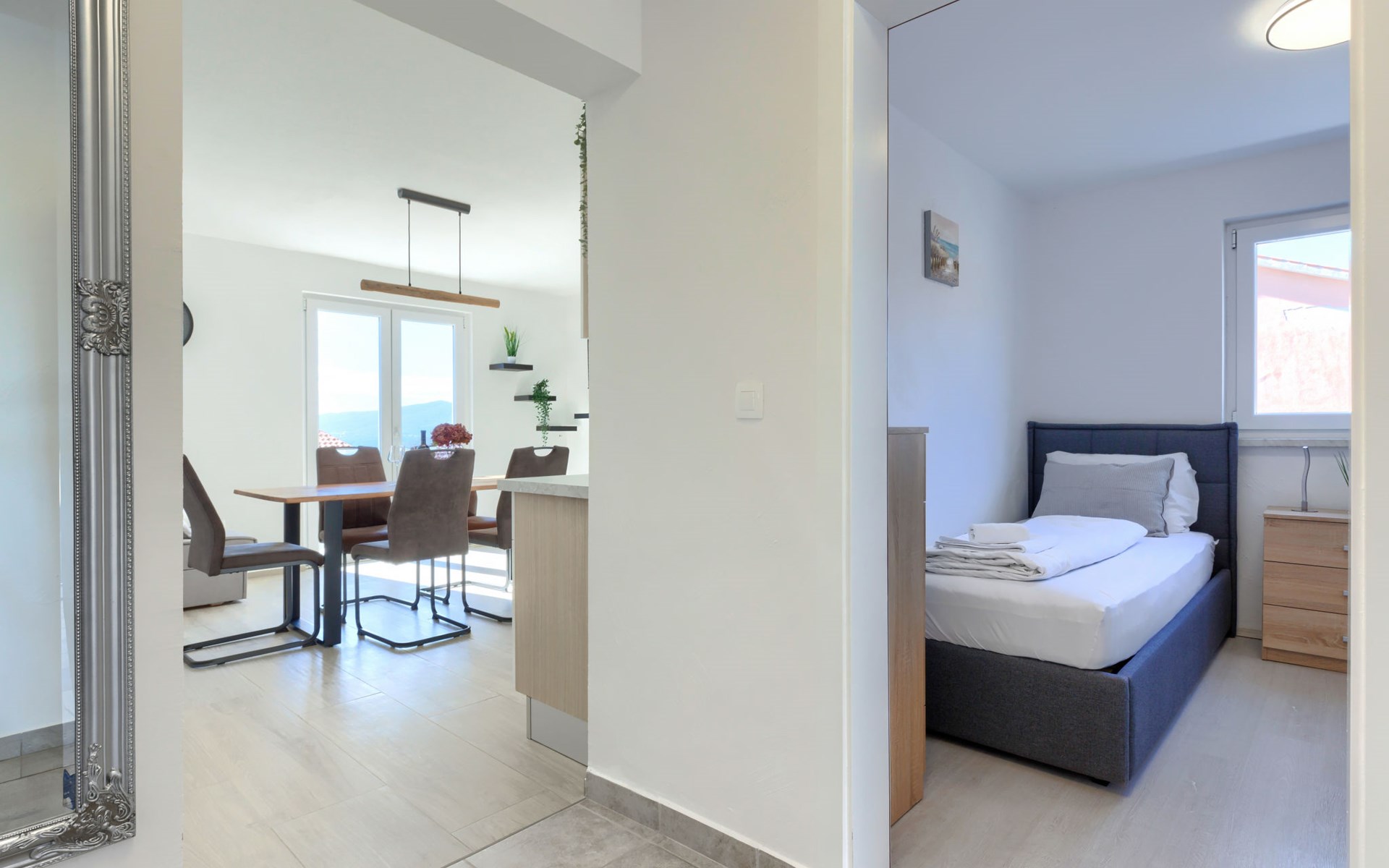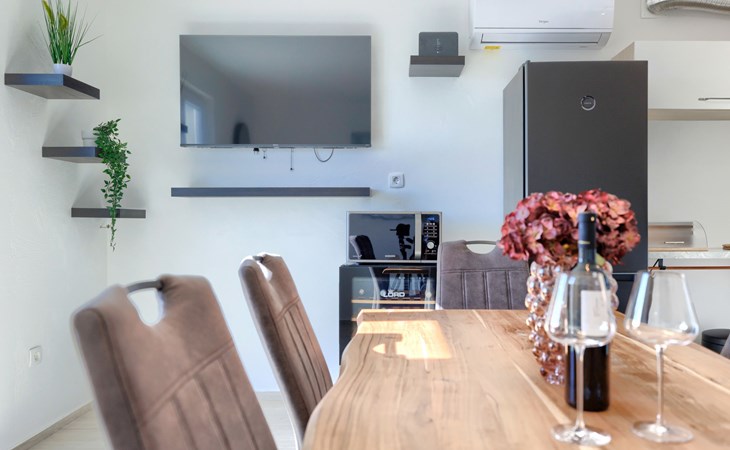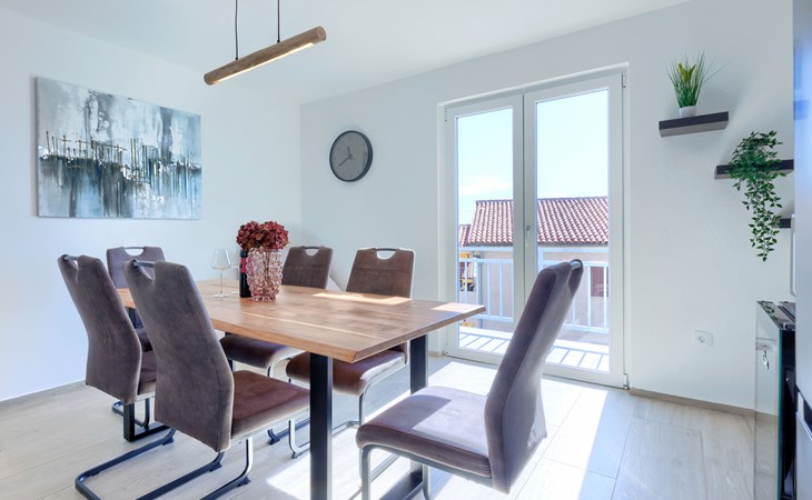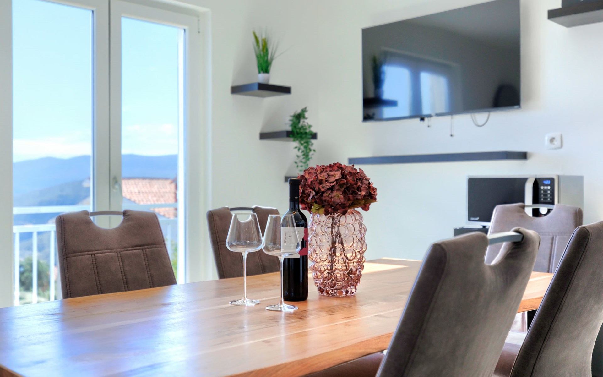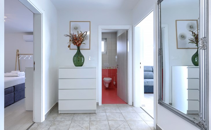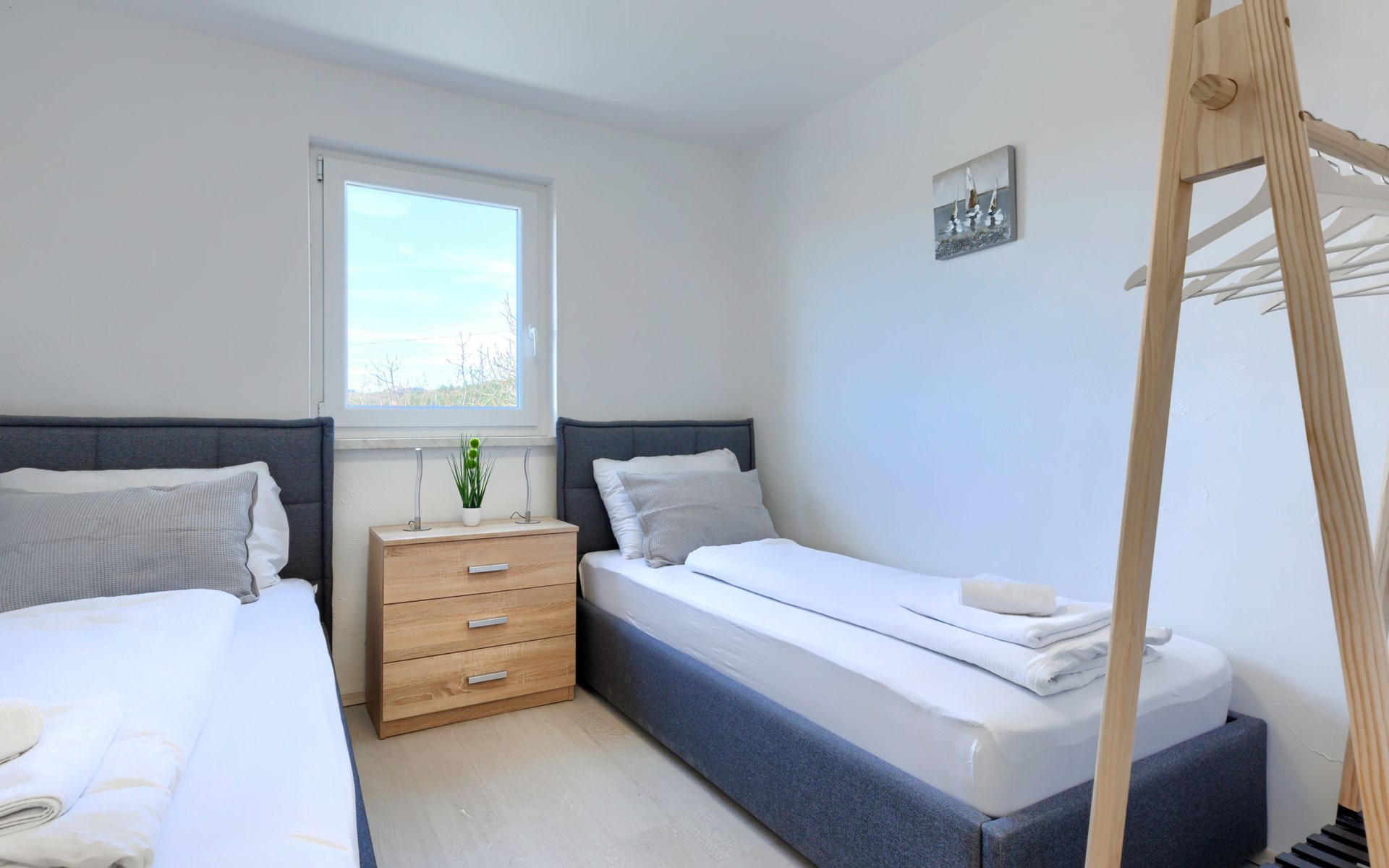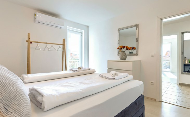 2-family house "Tatiana". 1.7 km from the centre of Rabac, 6 km from the centre of Labin, in a sunny position on a slope, 1.7 km from the sea, 1.7 km from the beach. Private: swimming pool angular (5 x 3 m, depth 140 cm, seasonal availability: 01.Jun. - 12.Oct.) with salt-electrolysis pool-cleaning system. Outdoor shower, terrace (20 m2), garden furniture, barbecue, pool maintenance by the owner/gardener. In the house: internet access. Parking (for 2 cars) at the house on the premises. Shop 1 km, supermarket 7 km, restaurant 1 km, bus stop 1.8 km, pebble beach 1.7 km. Please note: airfield 45 km from the property.