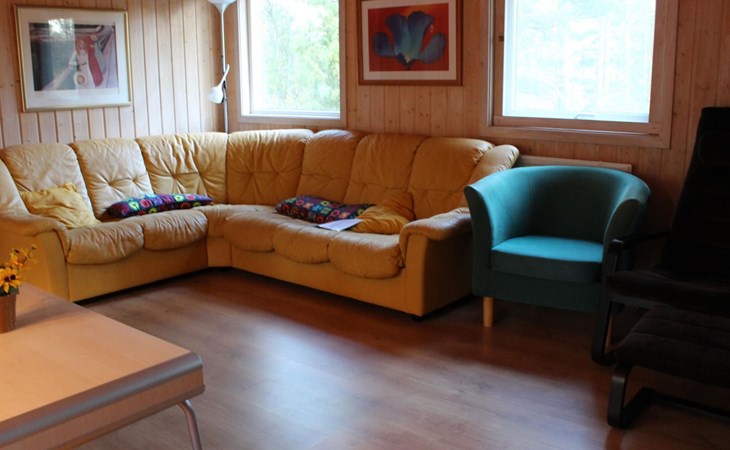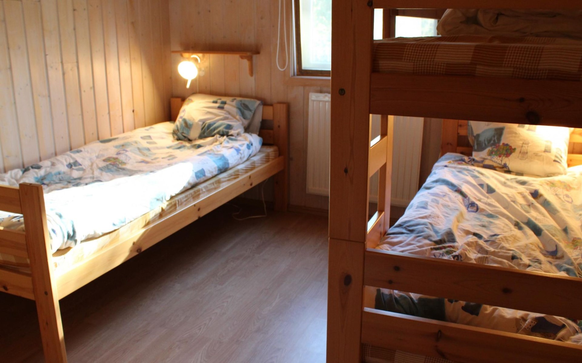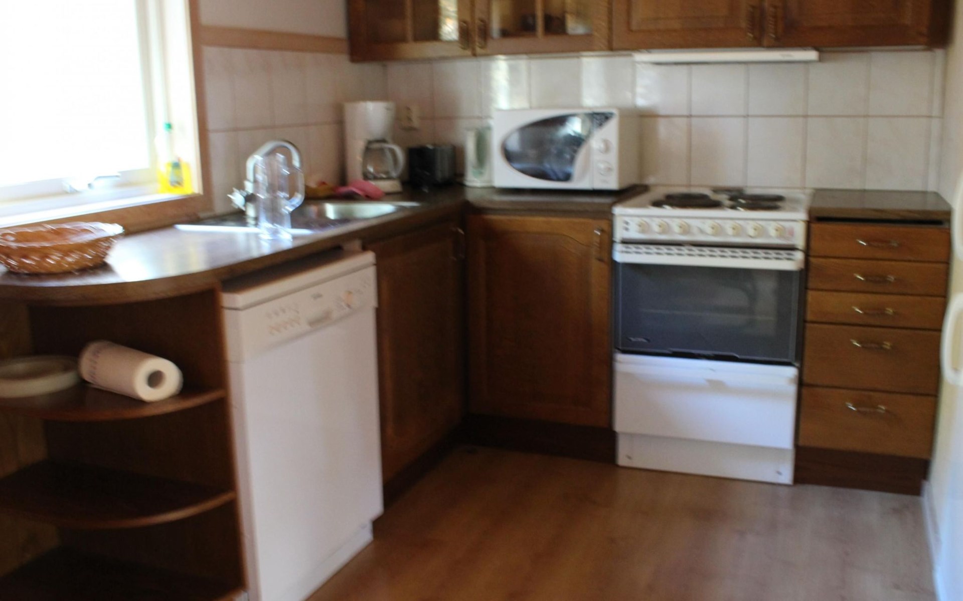 The holiday house can accommodate five people. The master bedroom is furnished with two single beds that can be joined together and a wardrobe. The other bedroom has a single bed and a bunk bed. The open living and dining room with an open kitchen provides a sofa suite with armchairs, satellite TV and a dining table with six chairs. The kitchen is fully-equipped with a stove, oven, fridge-freezer, microwave, toaster, kettle, coffee machine and dishwasher. The bathroom comprises a shower, washbasin and toilet. There is also a washing machine for shared use with guests from a neighbouring house, in a separate building.