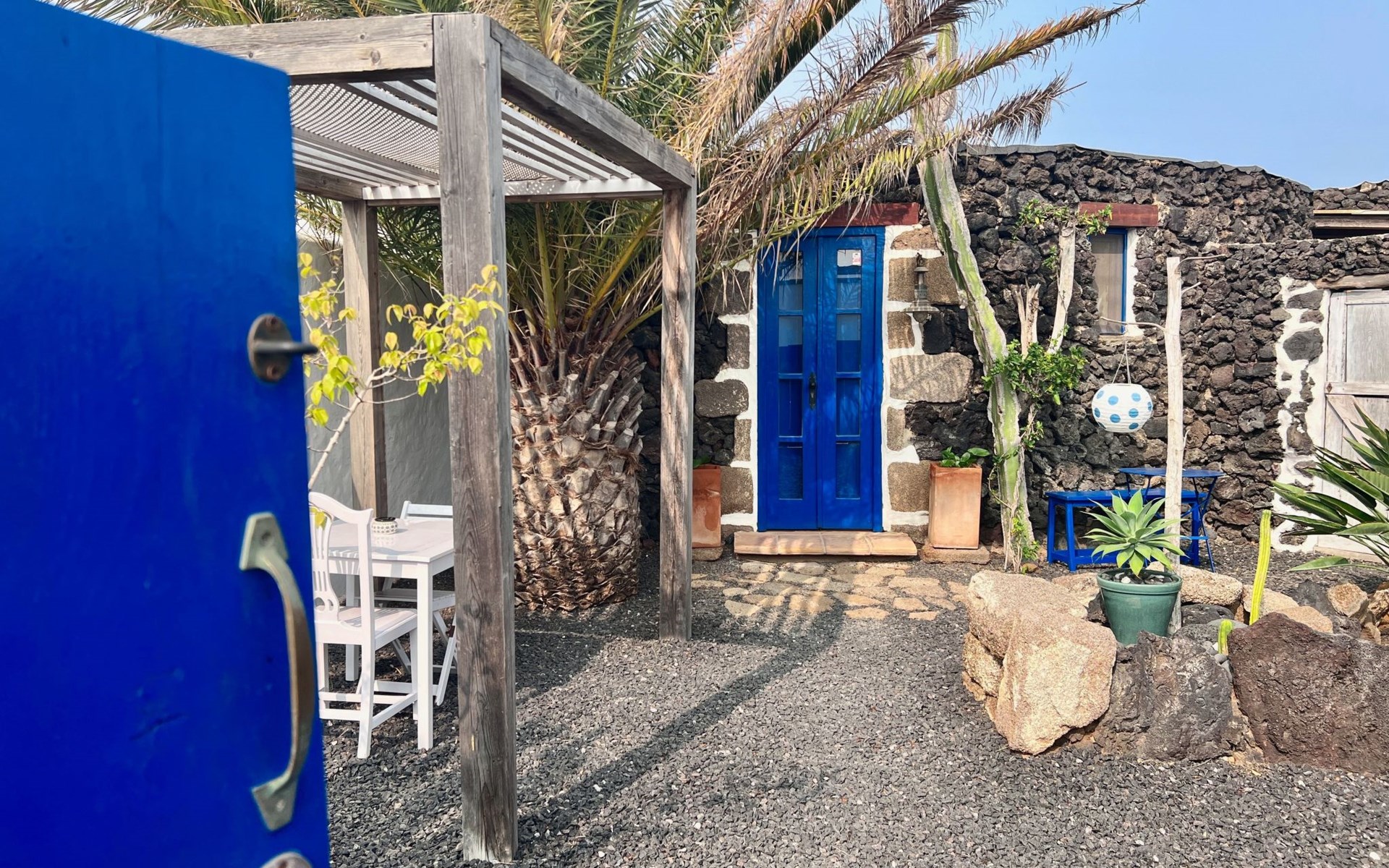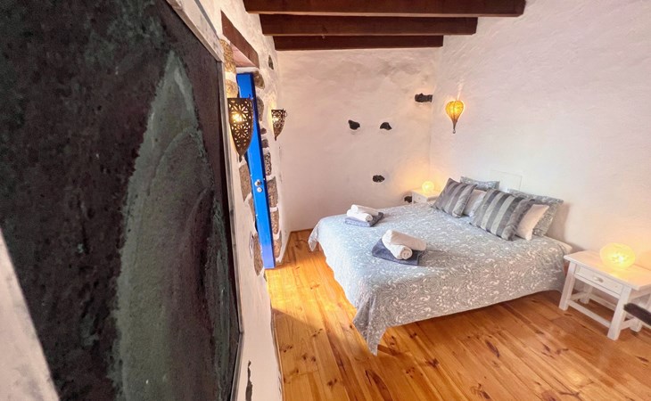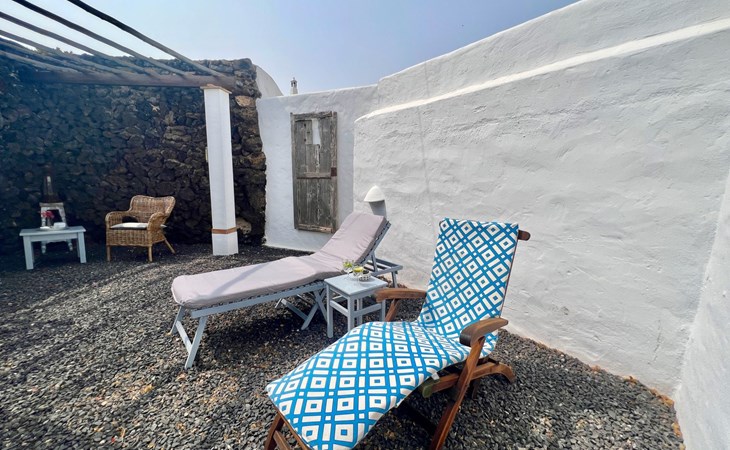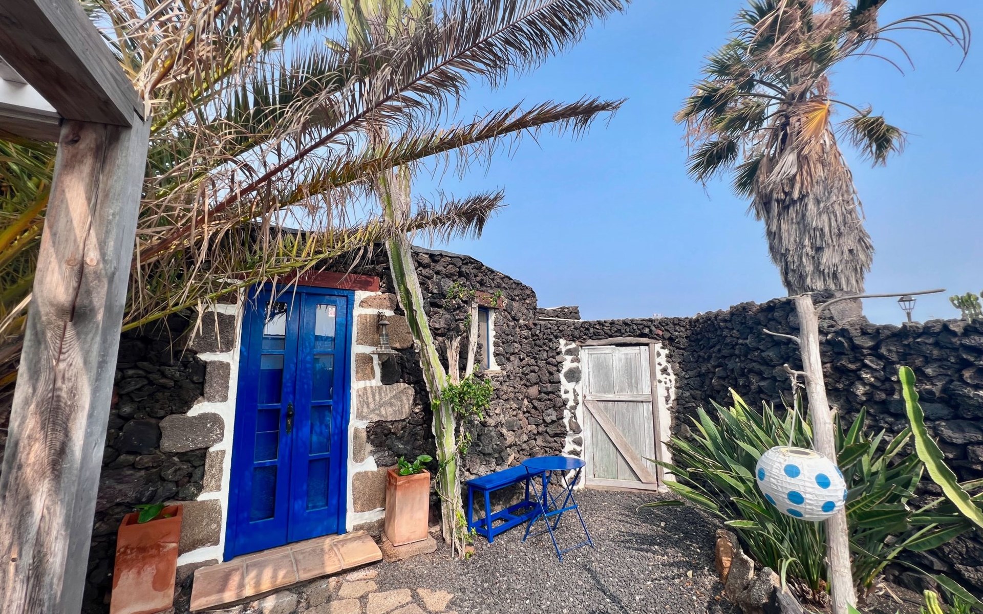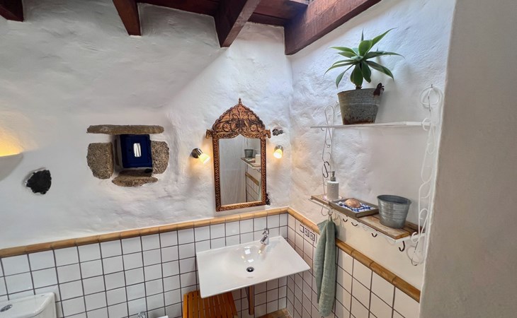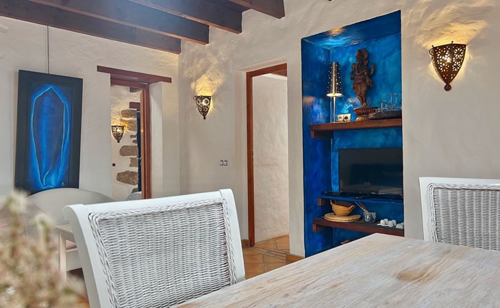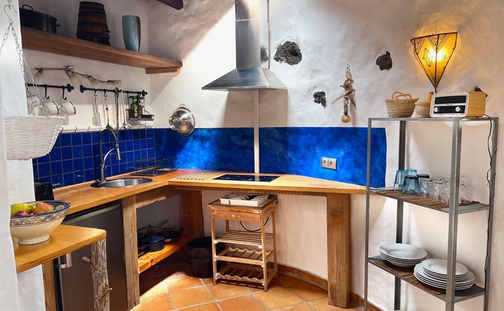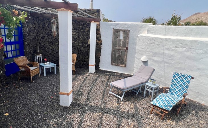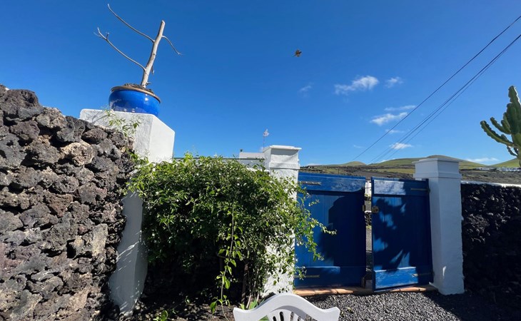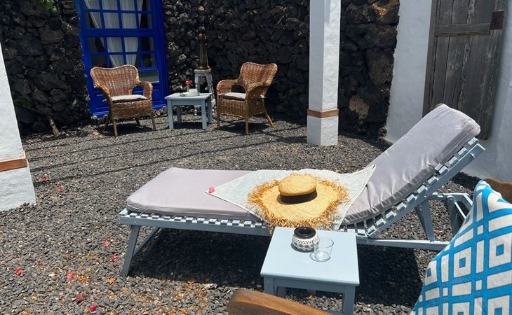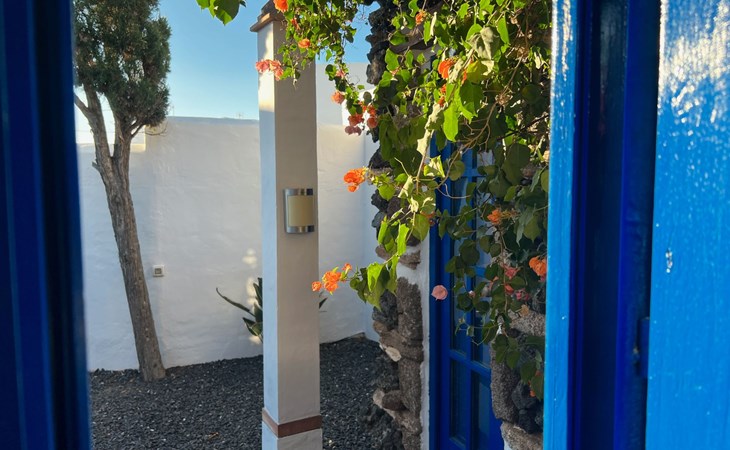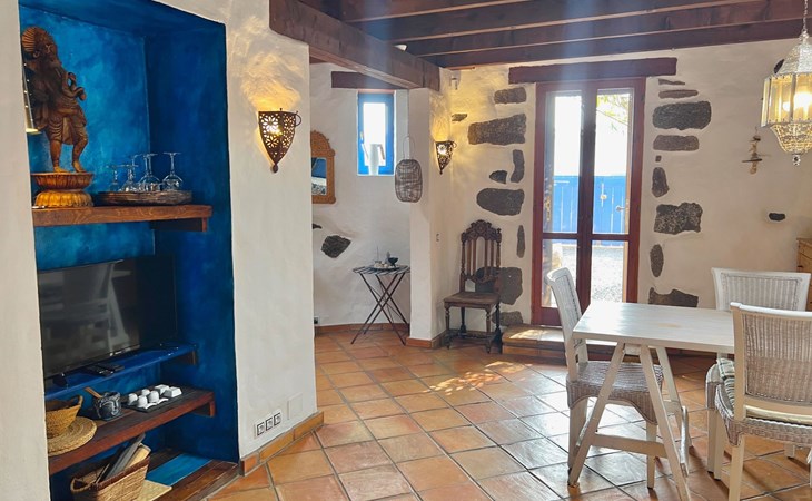 A lot of love and time have transformed the FINCA Yazmina into a small JEWEL among the Casa Rurales. The finca is characterized by its black lava stone facade. Blue, white, the green of the palm trees and plants and the many flowers give her happiness and unique charm.Only natural materials were used. Terracotta, wooden floors, handmade tiles, wooden ceilings, Arabic metal lamps, wooden furniture, hand-painted pictures and many selected details have been lovingly and creatively put together and create a cozy, Mediterranean atmosphere to feel at home. The kitchen is individually designed, well equipped. The kitchen, dining and living areas are openly connected to each other. The TV, with German and Spanish programs, is not only good for watching TV, the Spanish radio programs are also highly recommended.The bathroom is very tastefully designed, with a walk-in shower, a stylish sink, bidet & toilet. Handmade tiles, black volcanic stone pebbles, an Indian mirror are the details that make it a little oasis of well-being. The bedroom with wooden floors is spacious, has a reading corner and an area for yoga exercises. Red and orange bougainvillas frame the blue door that leads into the second, very private and completely secluded garden on the back of the finca. Real Lanzarote wine climbs over the pergola and the evening sun invites you to linger, chill and relax.