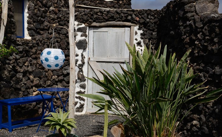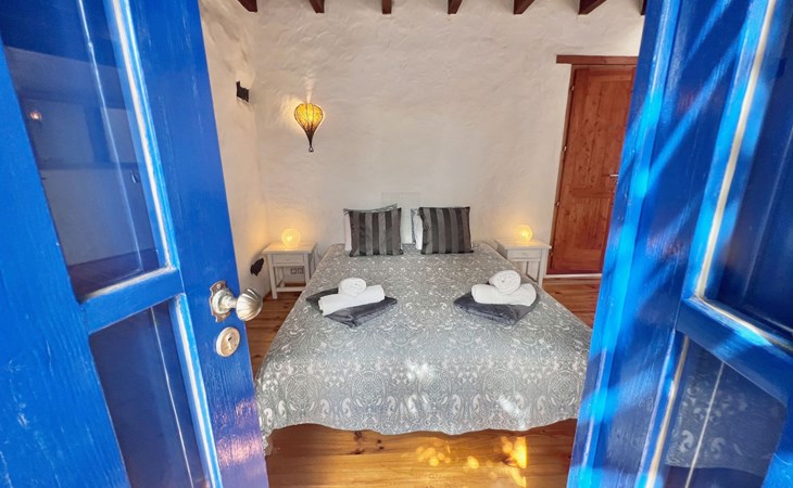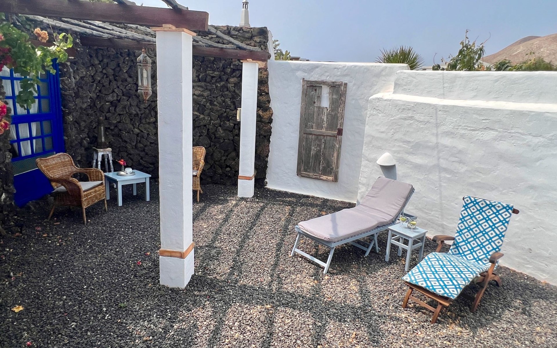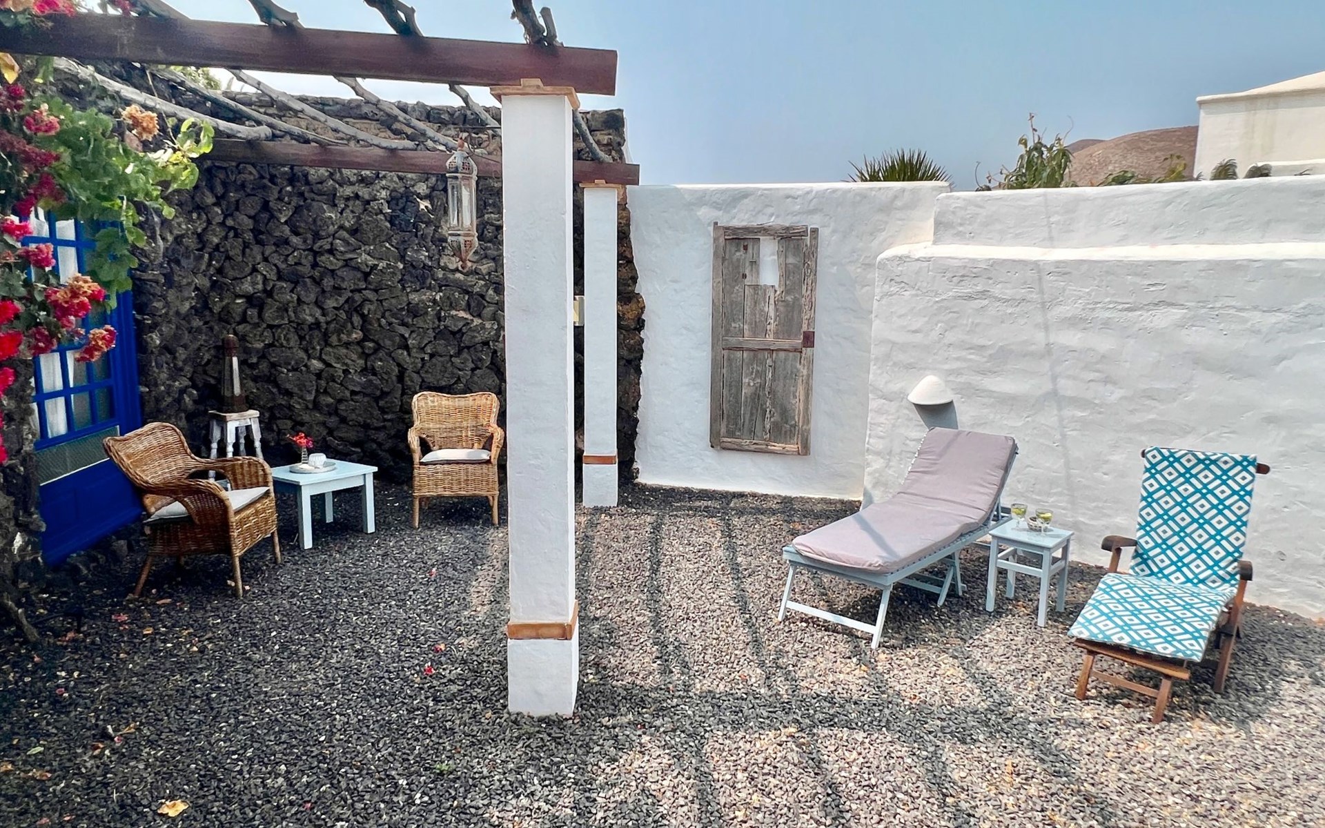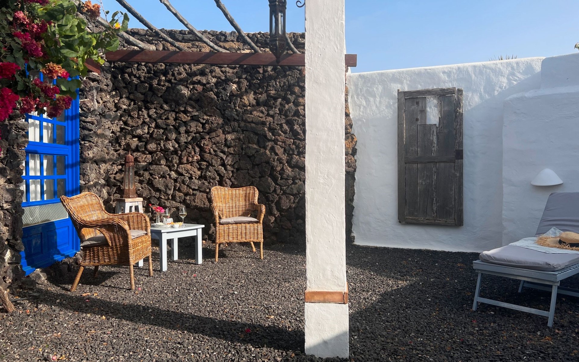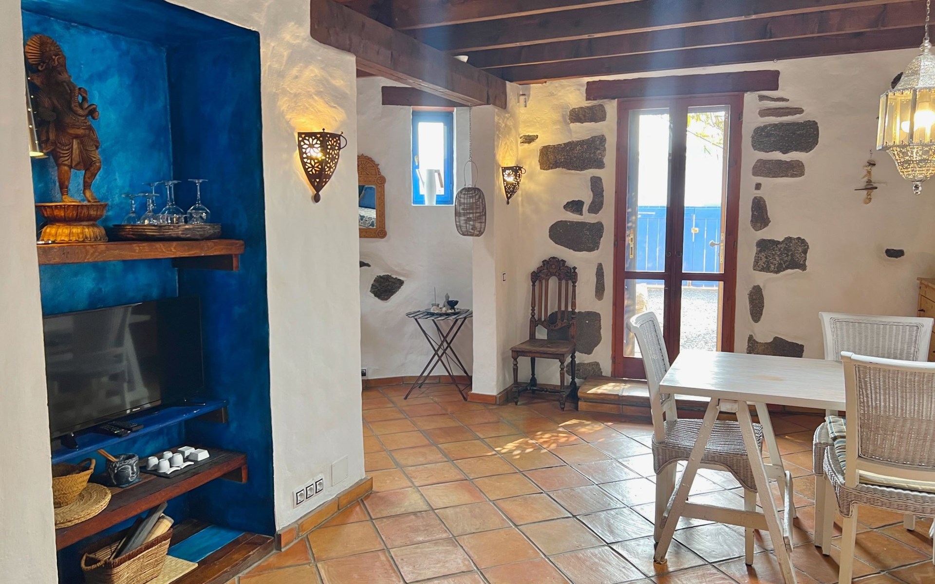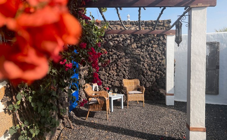 A lot of love and time have transformed the FINCA Yazmina into a small JEWEL among the Casa Rurales. The finca is characterized by its black lava stone facade. Blue, white, the green of the palm trees and plants and the many flowers give her happiness and unique charm.Only natural materials were used. Terracotta, wooden floors, handmade tiles, wooden ceilings, Arabic metal lamps, wooden furniture, hand-painted pictures and many selected details have been lovingly and creatively put together and create a cozy, Mediterranean atmosphere to feel at home. The kitchen is individually designed, well equipped. The kitchen, dining and living areas are openly connected to each other. The TV, with German and Spanish programs, is not only good for watching TV, the Spanish radio programs are also highly recommended.The bathroom is very tastefully designed, with a walk-in shower, a stylish sink, bidet & toilet. Handmade tiles, black volcanic stone pebbles, an Indian mirror are the details that make it a little oasis of well-being. The bedroom with wooden floors is spacious, has a reading corner and an area for yoga exercises. Red and orange bougainvillas frame the blue door that leads into the second, very private and completely secluded garden on the back of the finca. Real Lanzarote wine climbs over the pergola and the evening sun invites you to linger, chill and relax.