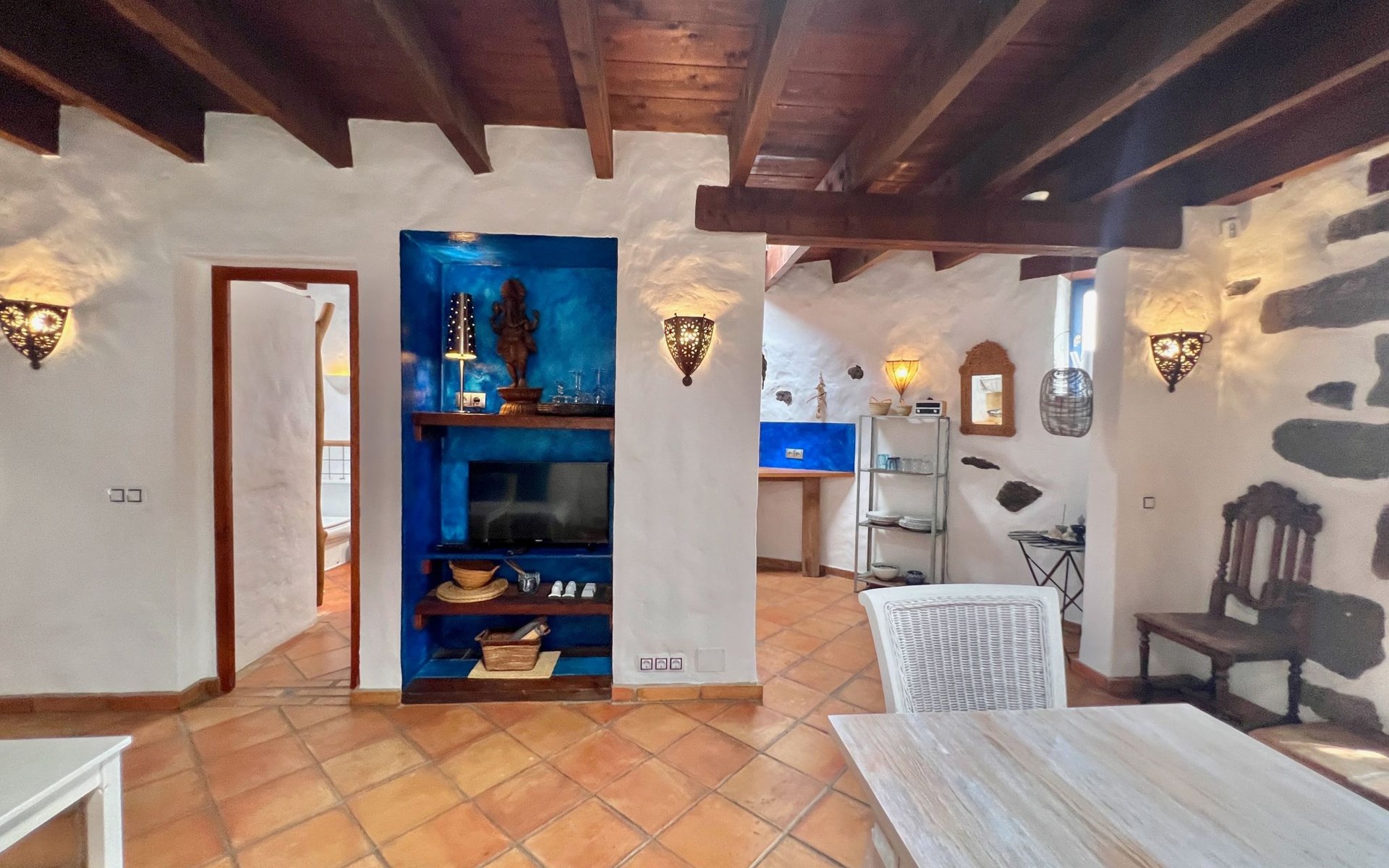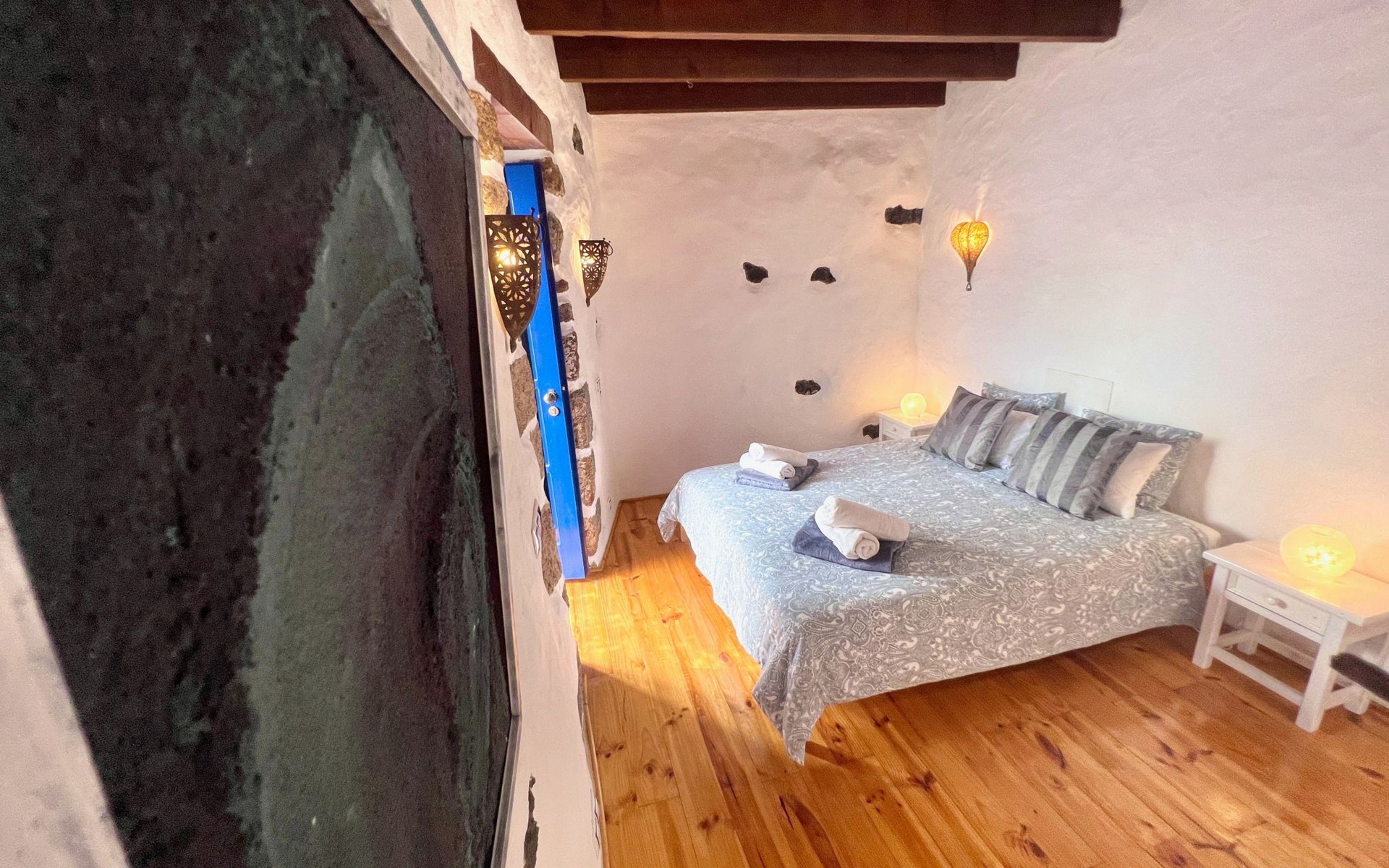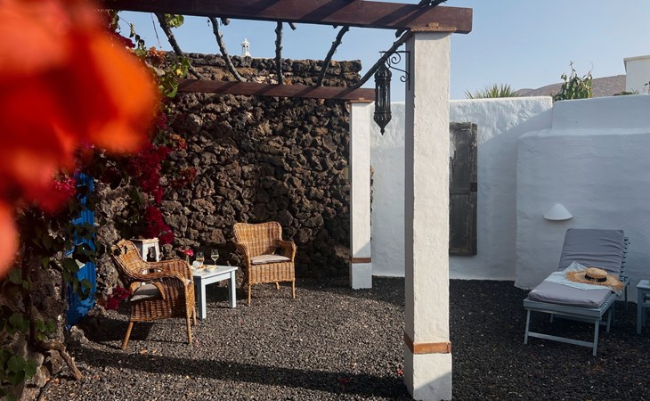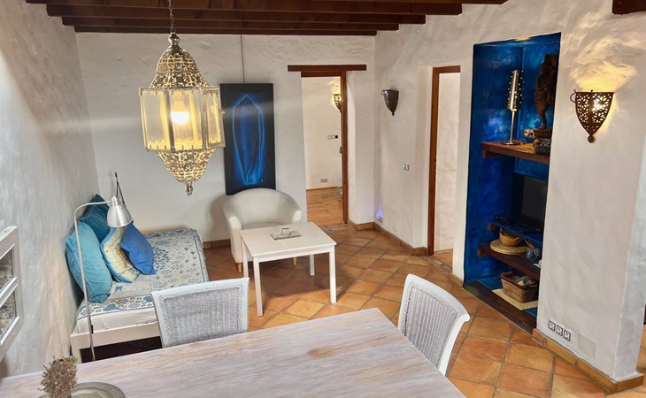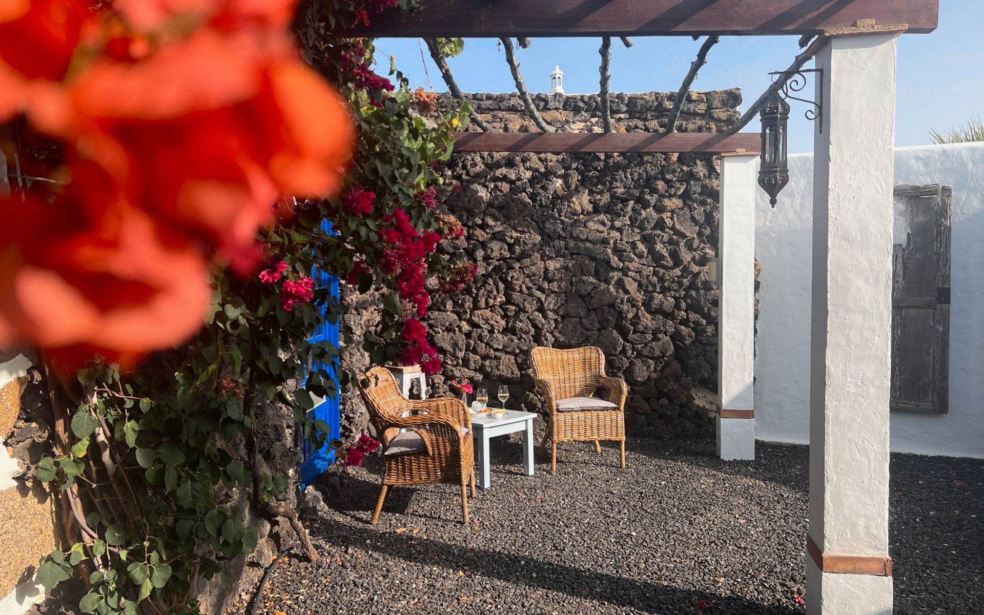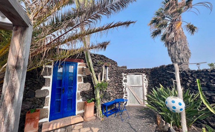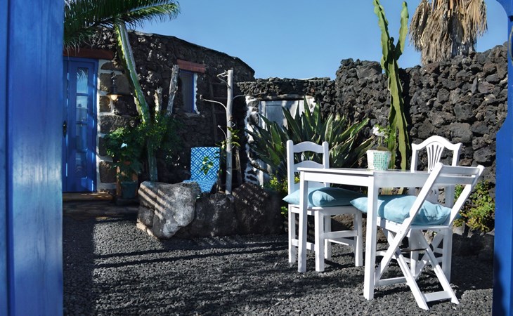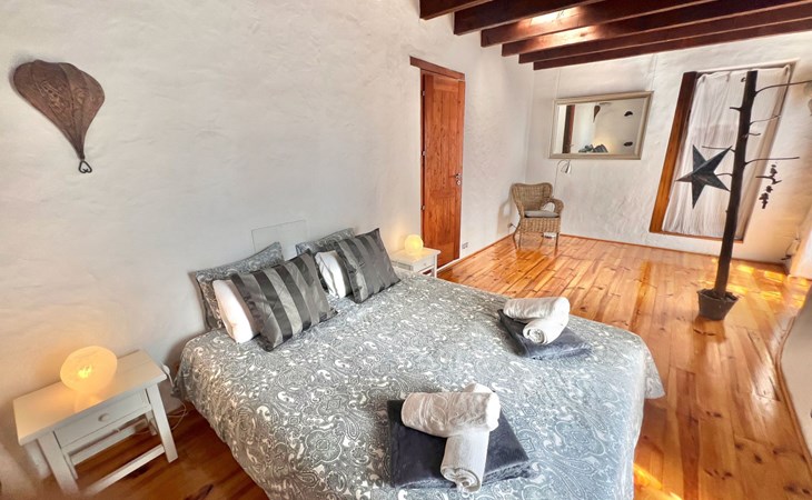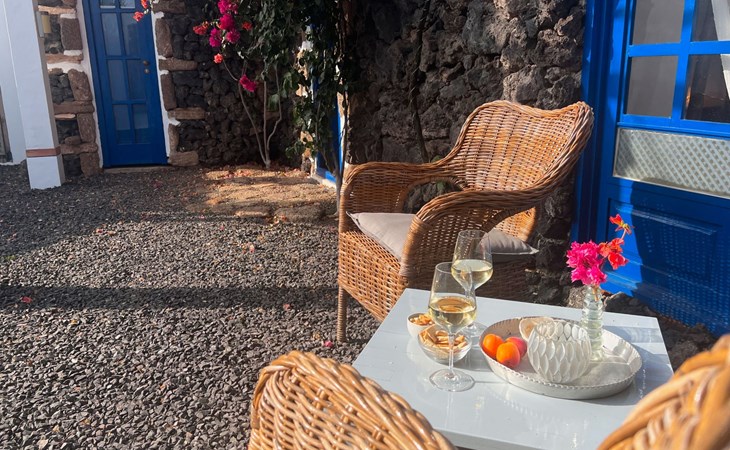 A lot of love and time have transformed the FINCA Yazmina into a small JEWEL among the Casa Rurales. The finca is characterized by its black lava stone facade. Blue, white, the green of the palm trees and plants and the many flowers give her happiness and unique charm.Only natural materials were used. Terracotta, wooden floors, handmade tiles, wooden ceilings, Arabic metal lamps, wooden furniture, hand-painted pictures and many selected details have been lovingly and creatively put together and create a cozy, Mediterranean atmosphere to feel at home. The kitchen is individually designed, well equipped. The kitchen, dining and living areas are openly connected to each other. The TV, with German and Spanish programs, is not only good for watching TV, the Spanish radio programs are also highly recommended.The bathroom is very tastefully designed, with a walk-in shower, a stylish sink, bidet & toilet. Handmade tiles, black volcanic stone pebbles, an Indian mirror are the details that make it a little oasis of well-being. The bedroom with wooden floors is spacious, has a reading corner and an area for yoga exercises. Red and orange bougainvillas frame the blue door that leads into the second, very private and completely secluded garden on the back of the finca. Real Lanzarote wine climbs over the pergola and the evening sun invites you to linger, chill and relax.