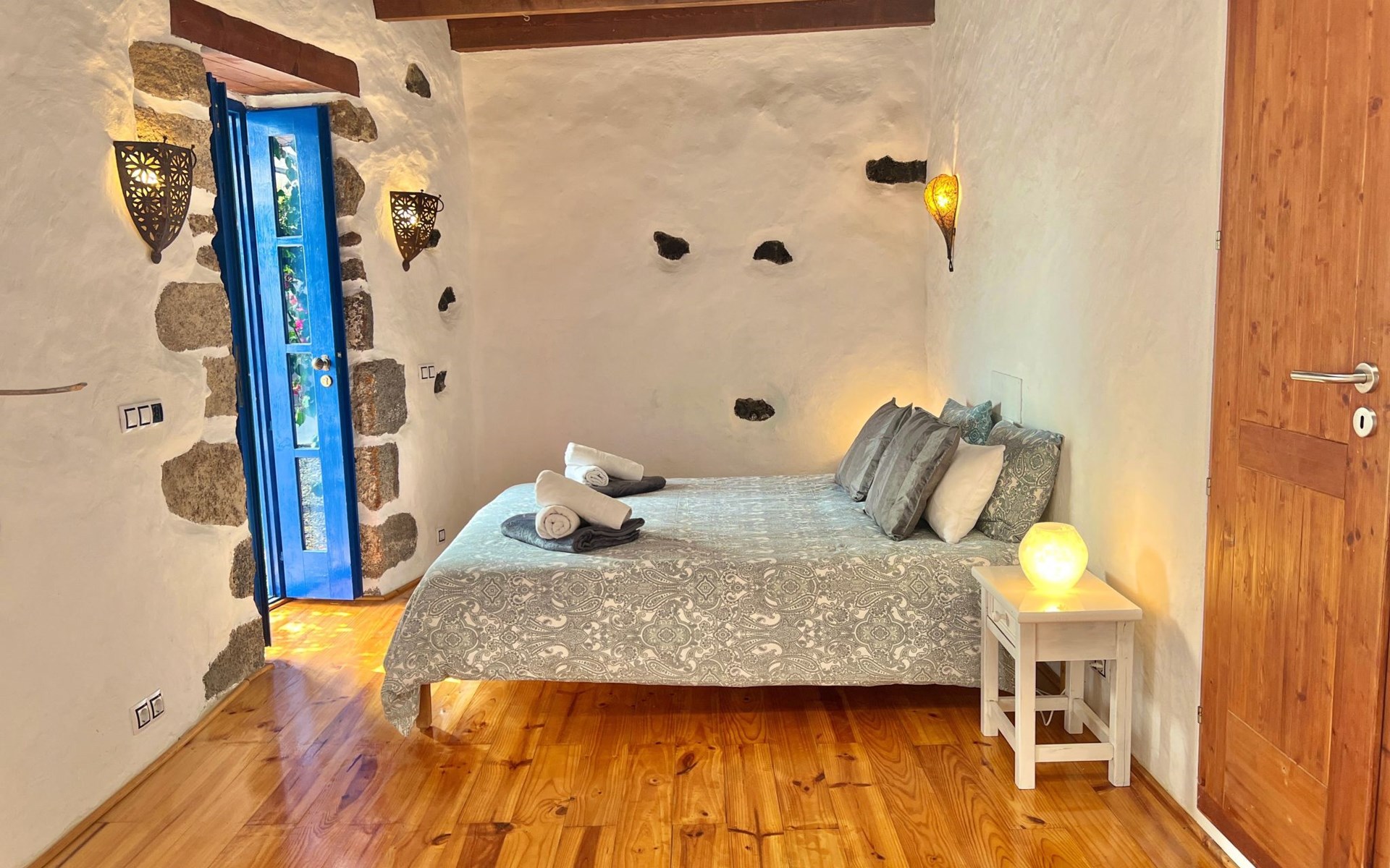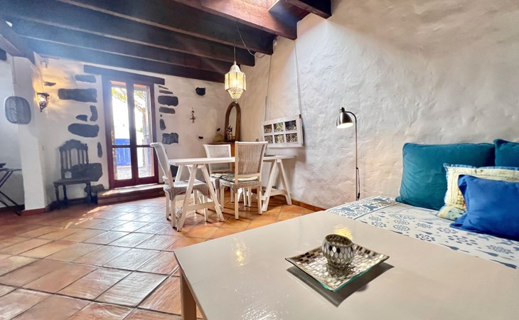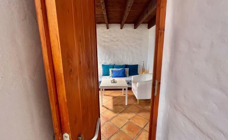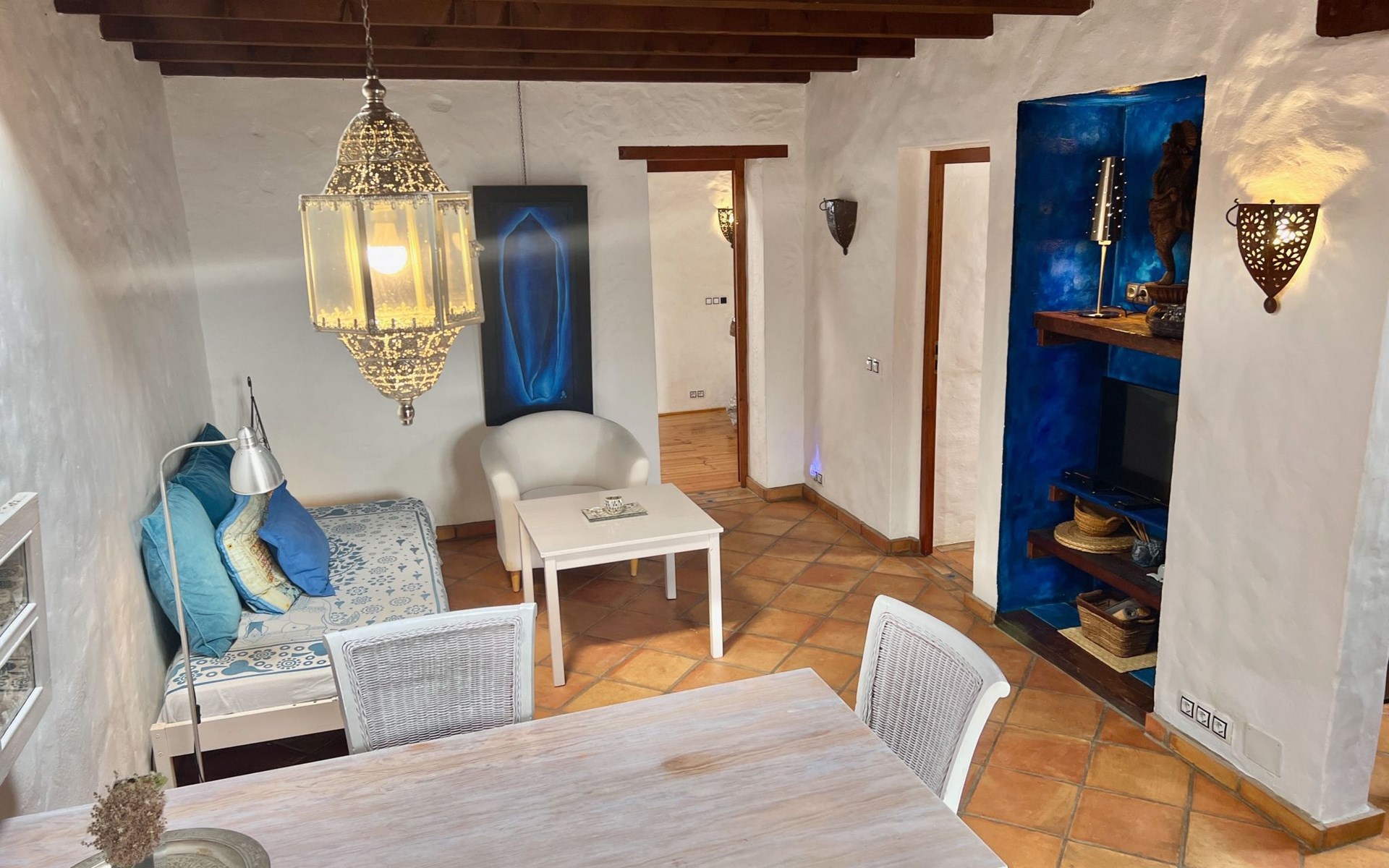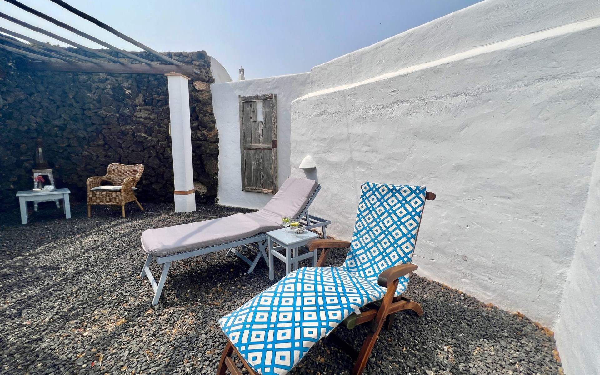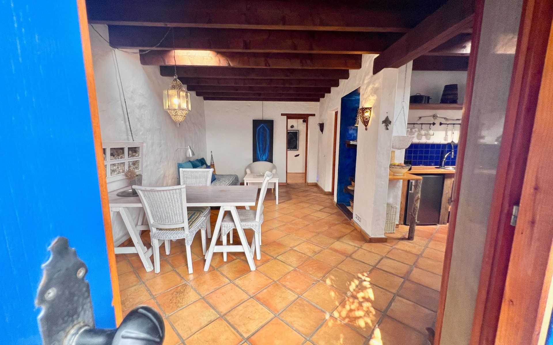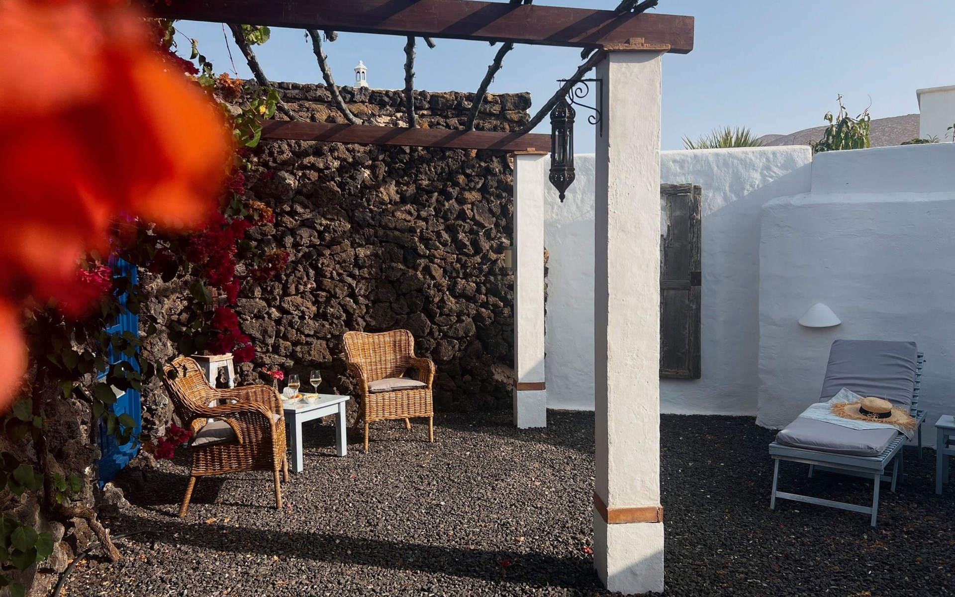 A lot of love and time have transformed the FINCA Yazmina into a small JEWEL among the Casa Rurales. The finca is characterized by its black lava stone facade. Blue, white, the green of the palm trees and plants and the many flowers give her happiness and unique charm.Only natural materials were used. Terracotta, wooden floors, handmade tiles, wooden ceilings, Arabic metal lamps, wooden furniture, hand-painted pictures and many selected details have been lovingly and creatively put together and create a cozy, Mediterranean atmosphere to feel at home. The kitchen is individually designed, well equipped. The kitchen, dining and living areas are openly connected to each other. The TV, with German and Spanish programs, is not only good for watching TV, the Spanish radio programs are also highly recommended.The bathroom is very tastefully designed, with a walk-in shower, a stylish sink, bidet & toilet. Handmade tiles, black volcanic stone pebbles, an Indian mirror are the details that make it a little oasis of well-being. The bedroom with wooden floors is spacious, has a reading corner and an area for yoga exercises. Red and orange bougainvillas frame the blue door that leads into the second, very private and completely secluded garden on the back of the finca. Real Lanzarote wine climbs over the pergola and the evening sun invites you to linger, chill and relax.