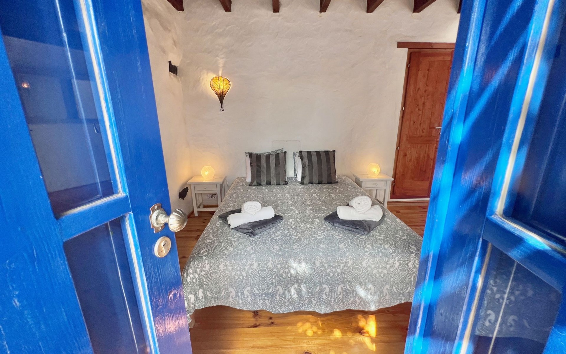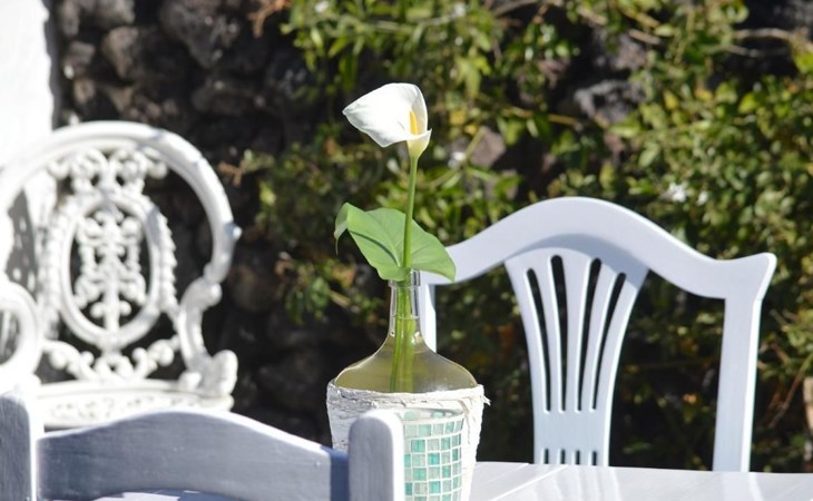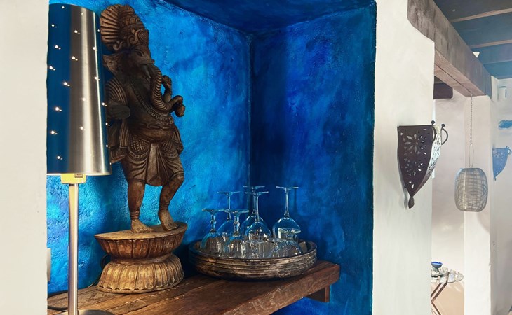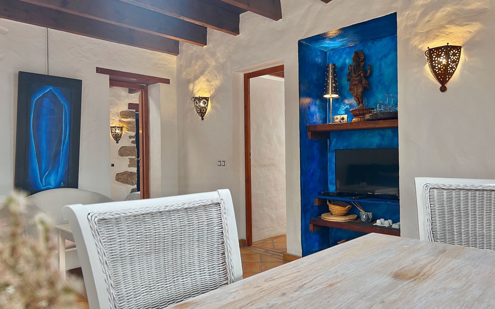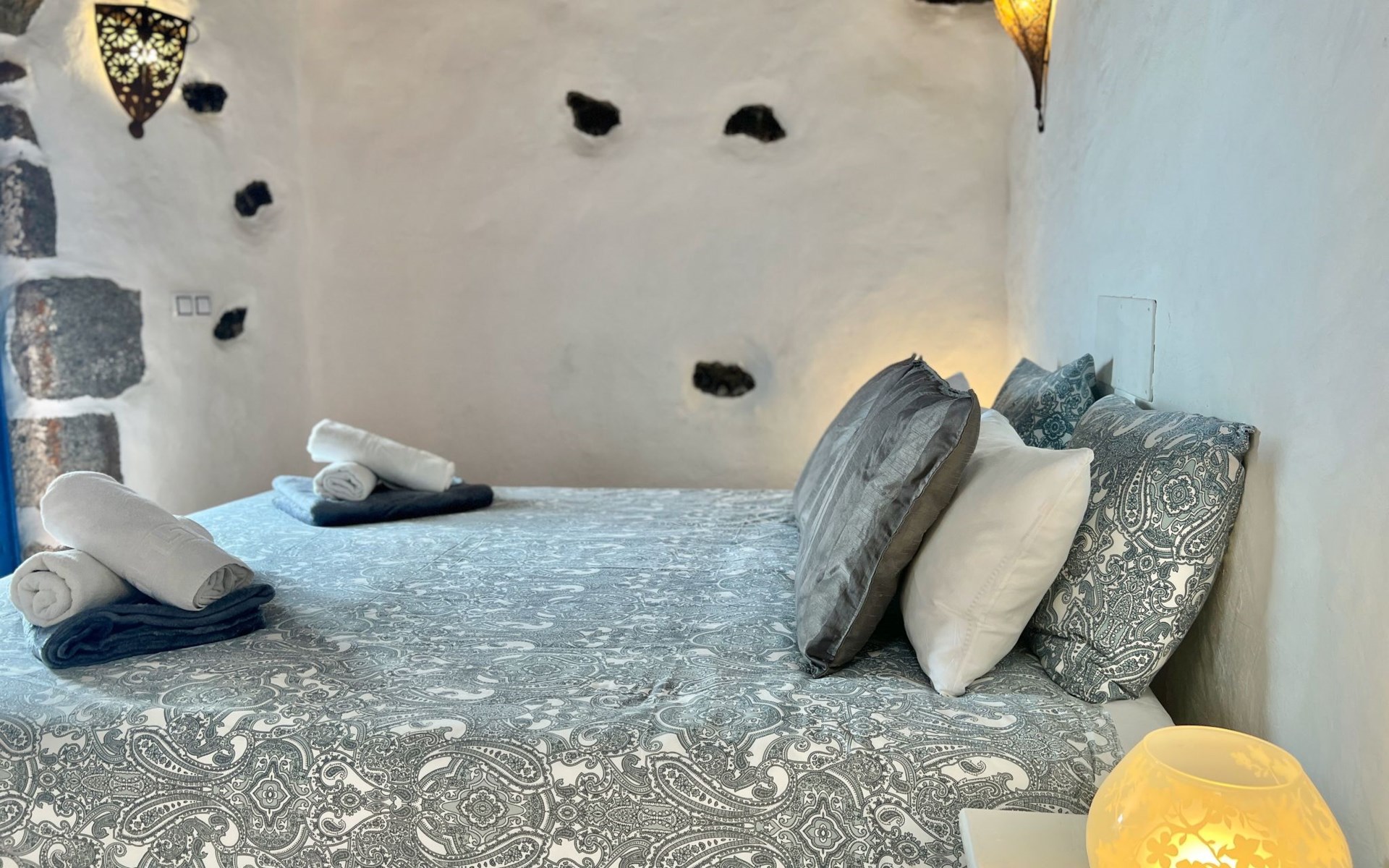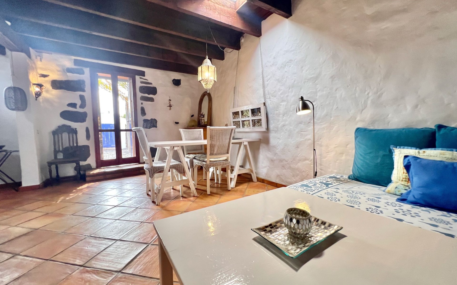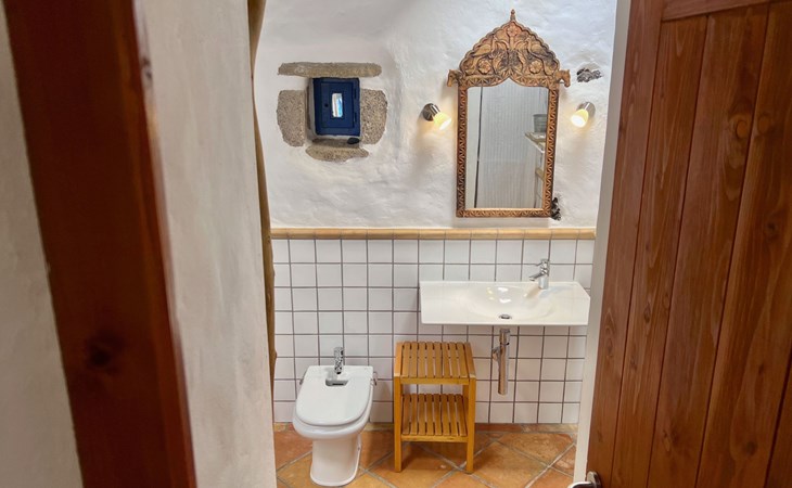 A lot of love and time have transformed the FINCA Yazmina into a small JEWEL among the Casa Rurales. The finca is characterized by its black lava stone facade. Blue, white, the green of the palm trees and plants and the many flowers give her happiness and unique charm.Only natural materials were used. Terracotta, wooden floors, handmade tiles, wooden ceilings, Arabic metal lamps, wooden furniture, hand-painted pictures and many selected details have been lovingly and creatively put together and create a cozy, Mediterranean atmosphere to feel at home. The kitchen is individually designed, well equipped. The kitchen, dining and living areas are openly connected to each other. The TV, with German and Spanish programs, is not only good for watching TV, the Spanish radio programs are also highly recommended.The bathroom is very tastefully designed, with a walk-in shower, a stylish sink, bidet & toilet. Handmade tiles, black volcanic stone pebbles, an Indian mirror are the details that make it a little oasis of well-being. The bedroom with wooden floors is spacious, has a reading corner and an area for yoga exercises. Red and orange bougainvillas frame the blue door that leads into the second, very private and completely secluded garden on the back of the finca. Real Lanzarote wine climbs over the pergola and the evening sun invites you to linger, chill and relax.