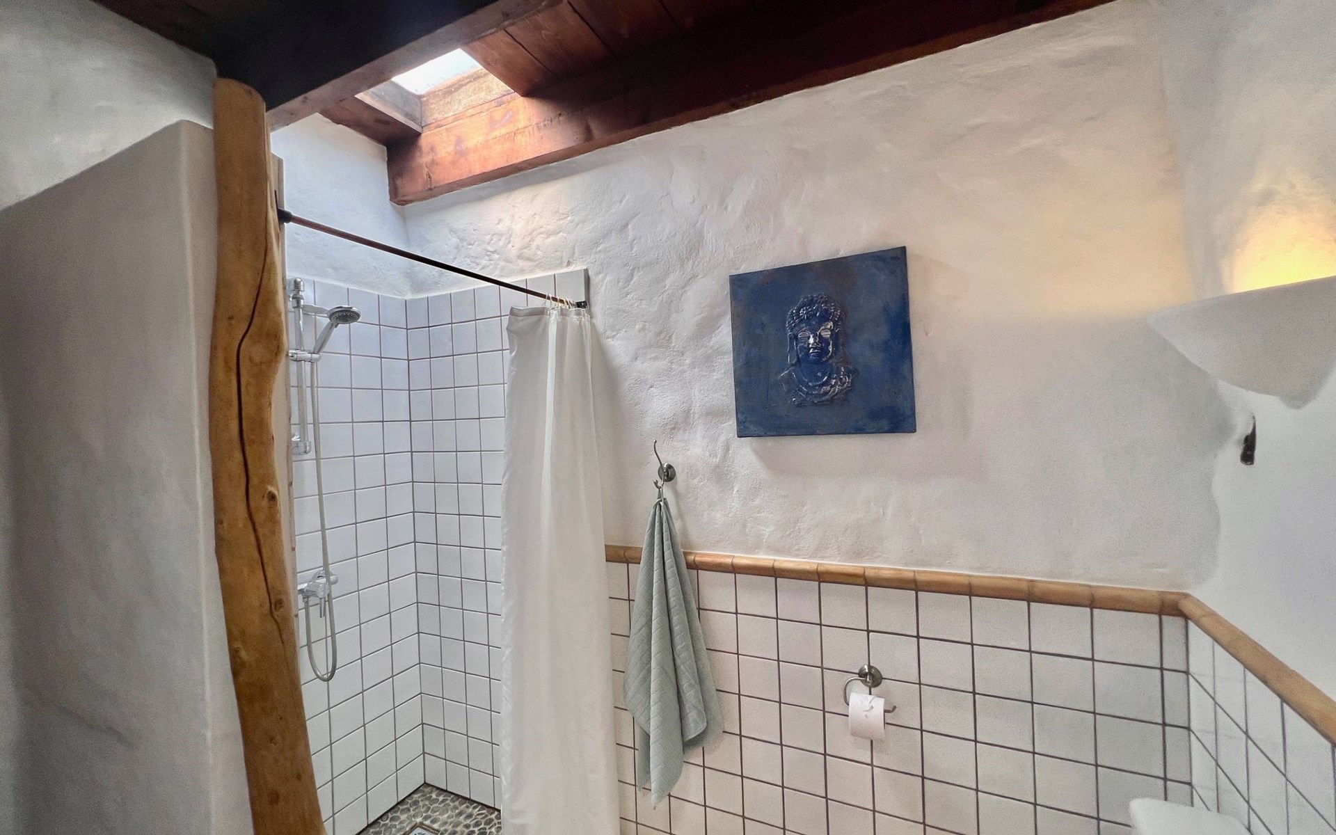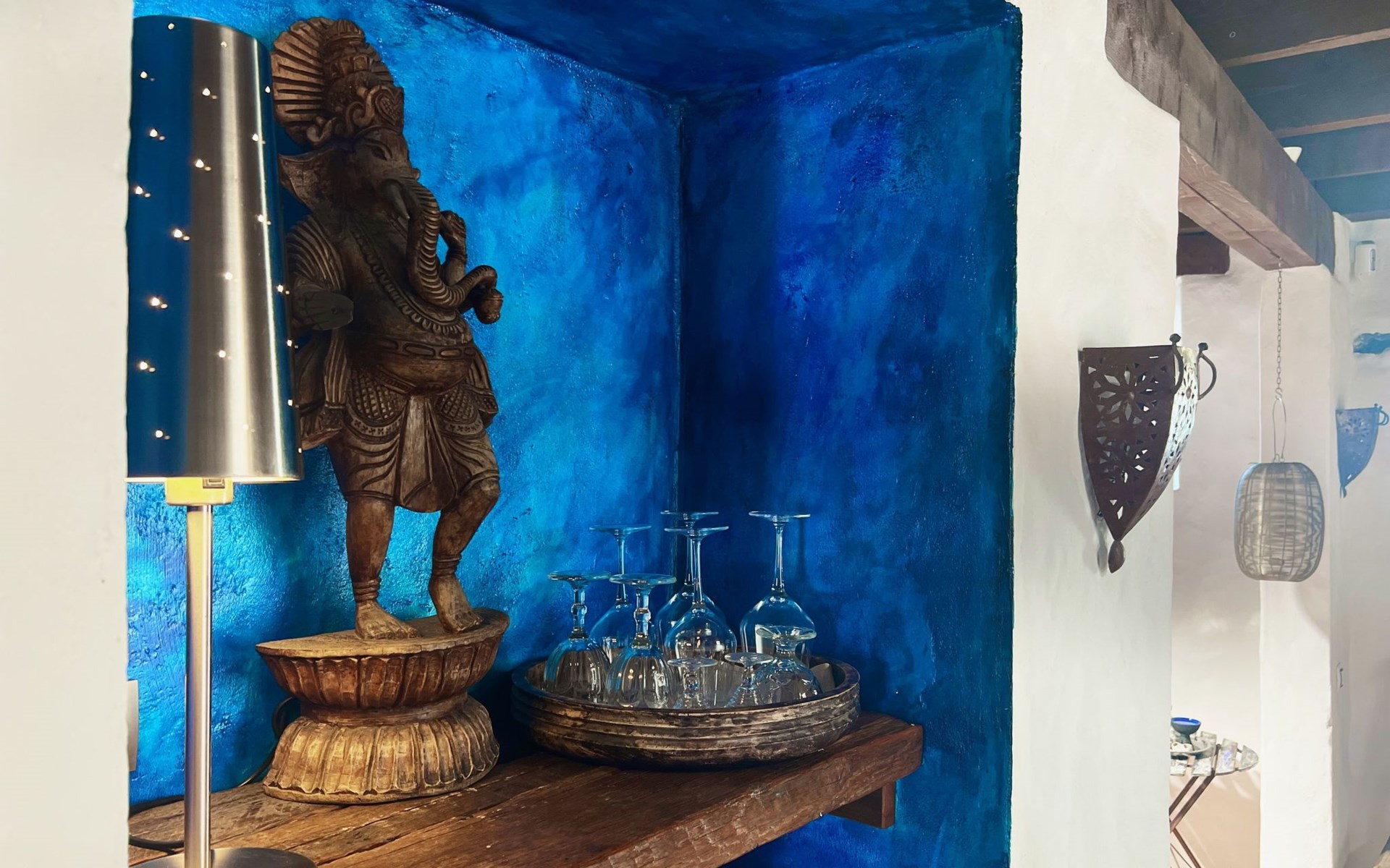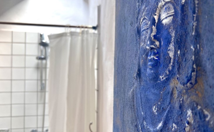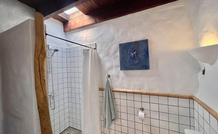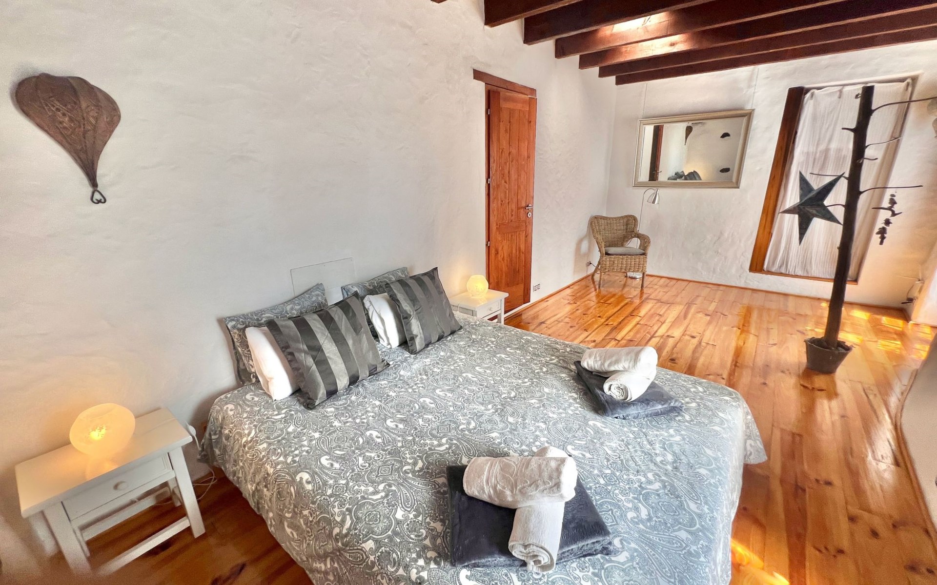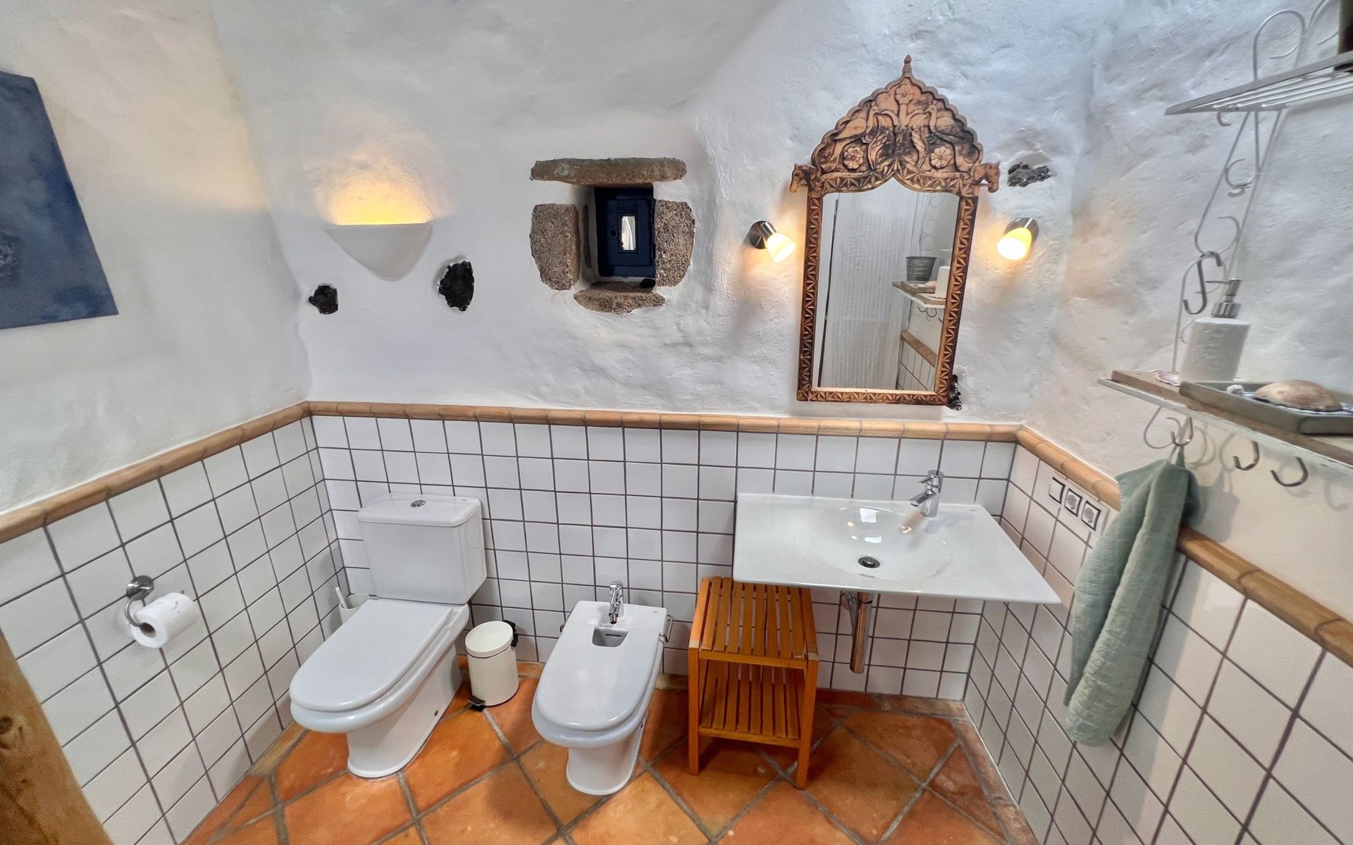A lot of love and time have transformed the FINCA Yazmina into a small JEWEL among the Casa Rurales. The finca is characterized by its black lava stone facade. Blue, white, the green of the palm trees and plants and the many flowers give her happiness and unique charm.Only natural materials were used. Terracotta, wooden floors, handmade tiles, wooden ceilings, Arabic metal lamps, wooden furniture, hand-painted pictures and many selected details have been lovingly and creatively put together and create a cozy, Mediterranean atmosphere to feel at home. The kitchen is individually designed, well equipped. The kitchen, dining and living areas are openly connected to each other. The TV, with German and Spanish programs, is not only good for watching TV, the Spanish radio programs are also highly recommended.The bathroom is very tastefully designed, with a walk-in shower, a stylish sink, bidet & toilet. Handmade tiles, black volcanic stone pebbles, an Indian mirror are the details that make it a little oasis of well-being. The bedroom with wooden floors is spacious, has a reading corner and an area for yoga exercises. Red and orange bougainvillas frame the blue door that leads into the second, very private and completely secluded garden on the back of the finca. Real Lanzarote wine climbs over the pergola and the evening sun invites you to linger, chill and relax.
