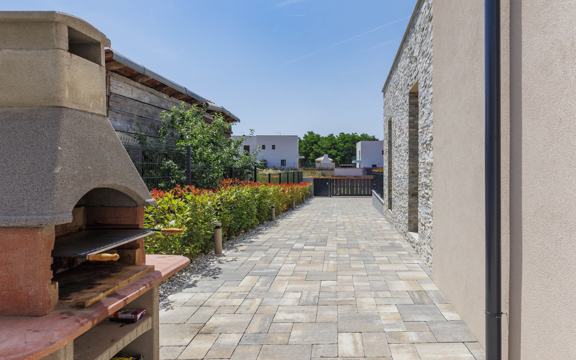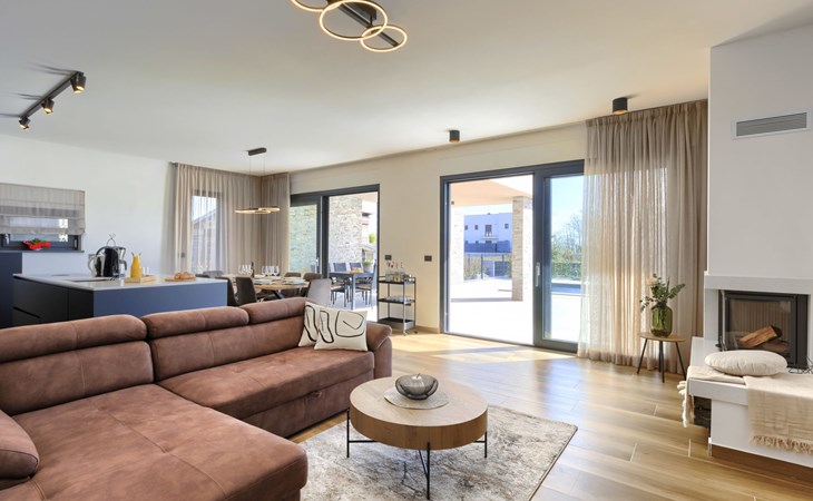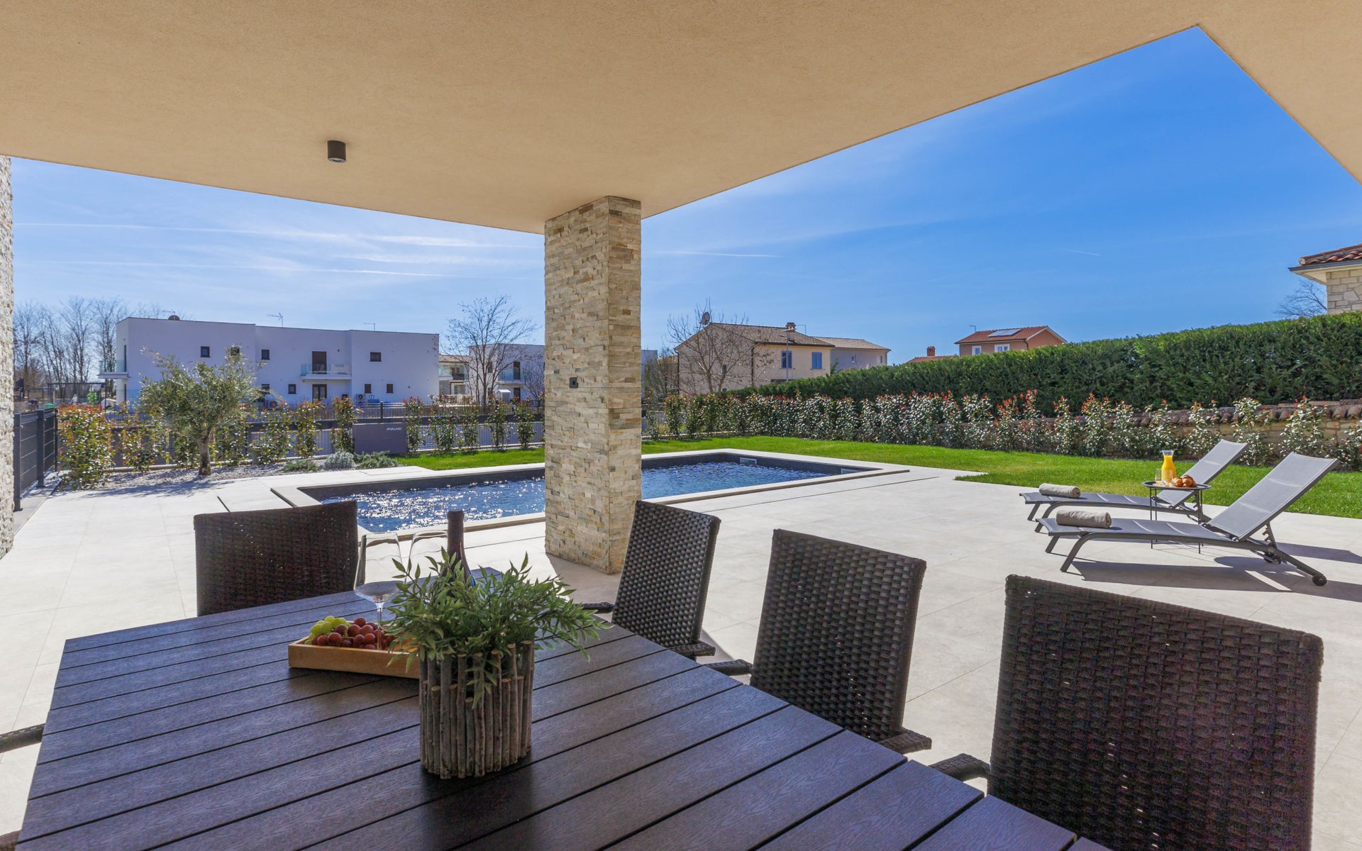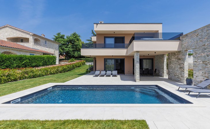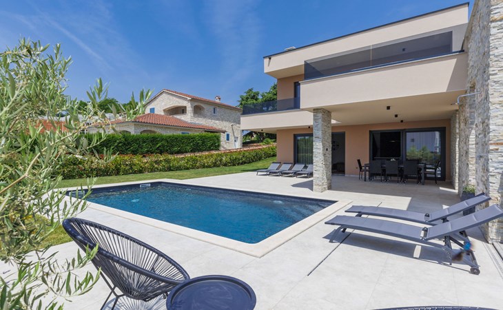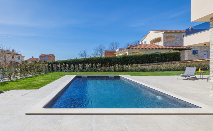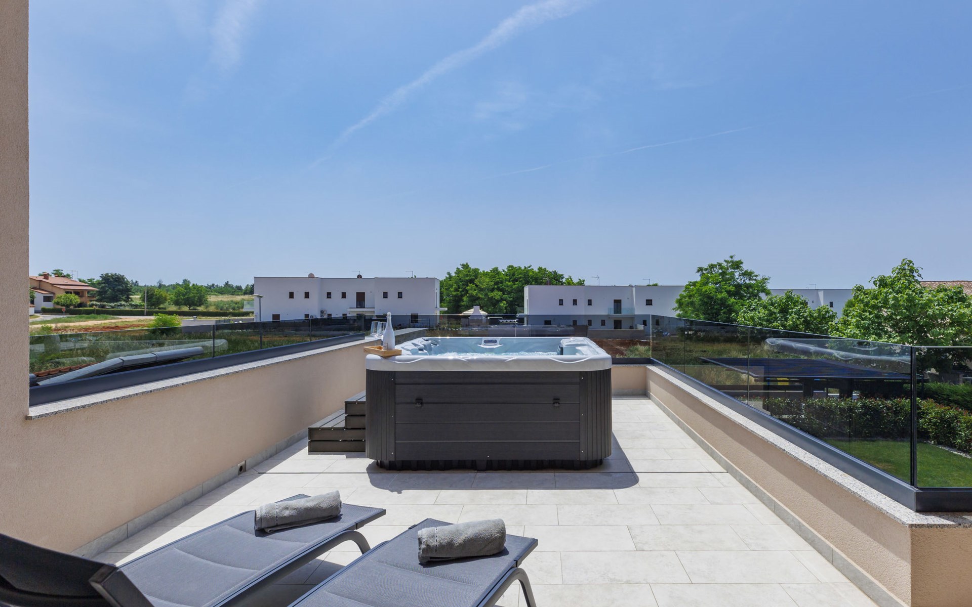 Kaštelir: Modern, luxurious villa "Prudensia", 2 storeys, built in 2022. In the hamlet Krančići 500 m from the centre of Kaštelir, 15 km from the centre of Poreč, in a sunny position, 10 km from the sea. Private: property 800 m2 (fenced), lawn, swimming pool angular, heated (10 x 4 m, depth 150 cm, seasonal availability: 01.Apr. - 30.Oct.) with internal staircase. Outdoor shower, hot tub, barbecue, pool maintenance by the owner/gardener. In the house: internet access, storage room for bicycles, washing machine, tumble dryer. Parking (for 3 cars) at the house on the premises. Shop 500 m, restaurant 2 km, bus stop 6 km, pebble beach 10 km, rocky beach 10 km. Walking paths from the house 100 m, cycle lane 150 m. Please note: suitable for families. The owner does not accept any youth groups. Neighbourhood highly sensitive to noise. Quietness and good behaviour expected. Video surveillance of the driveway and parking.