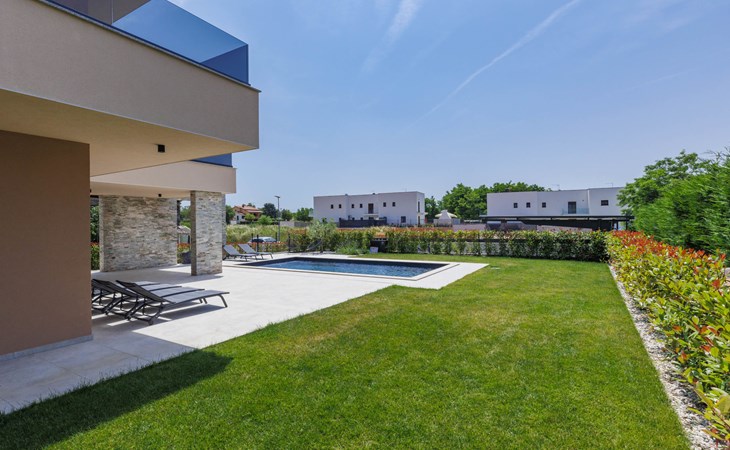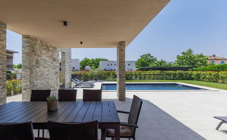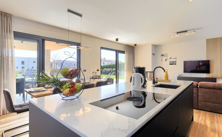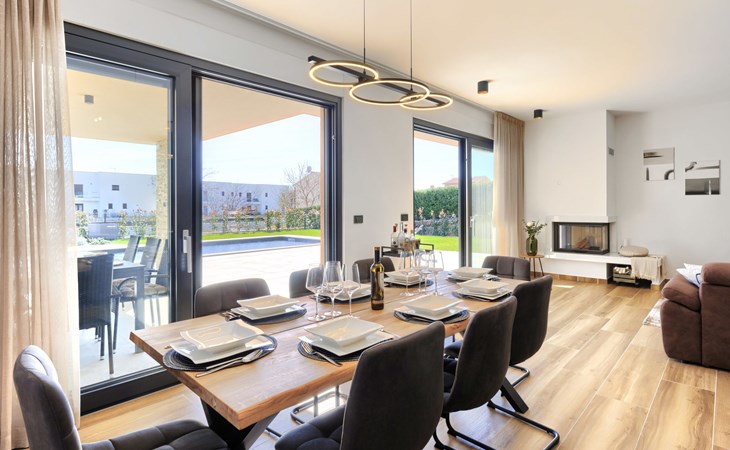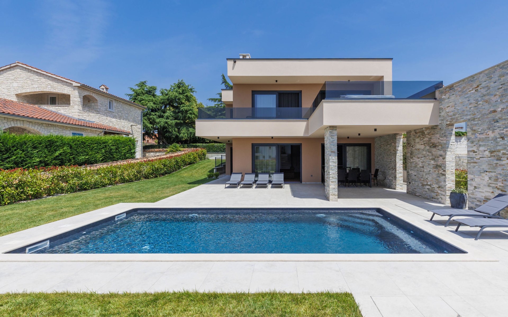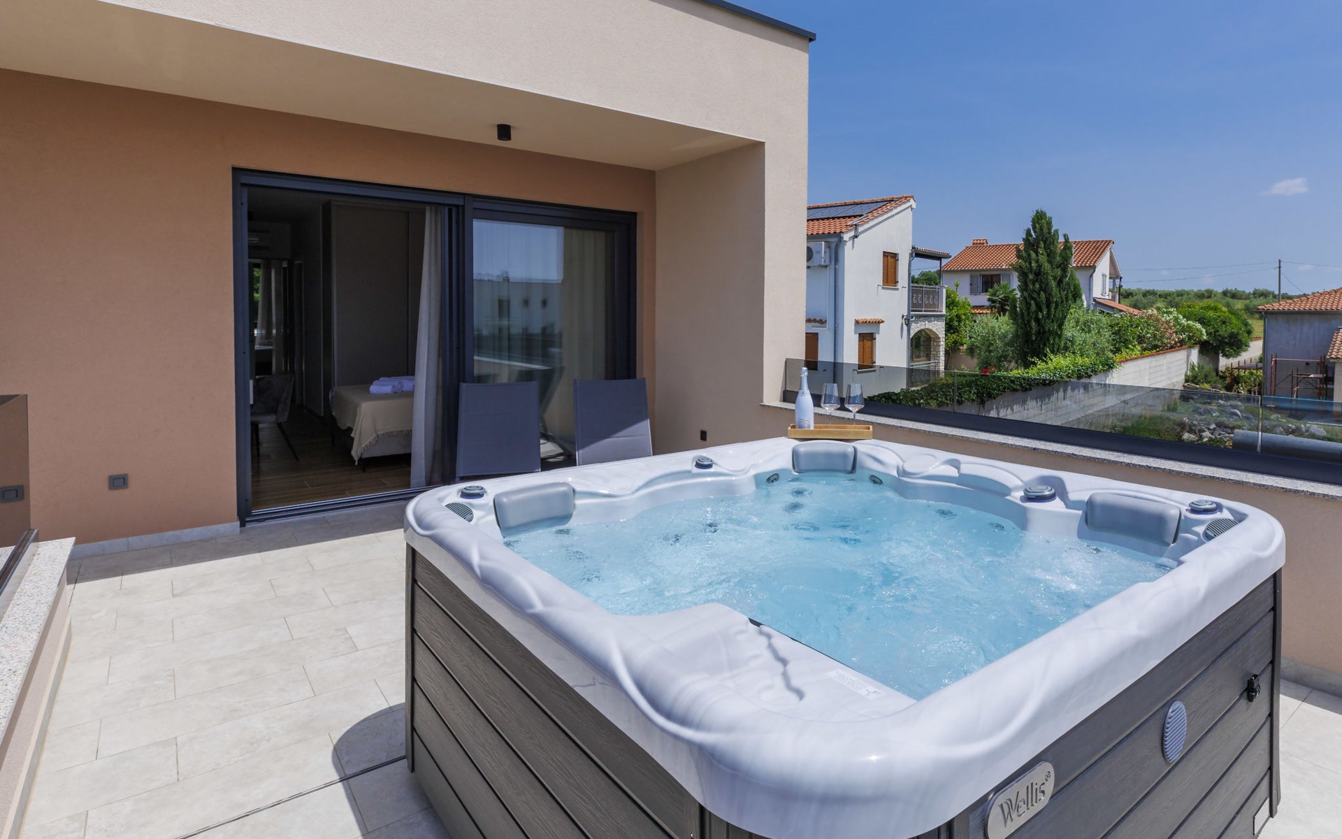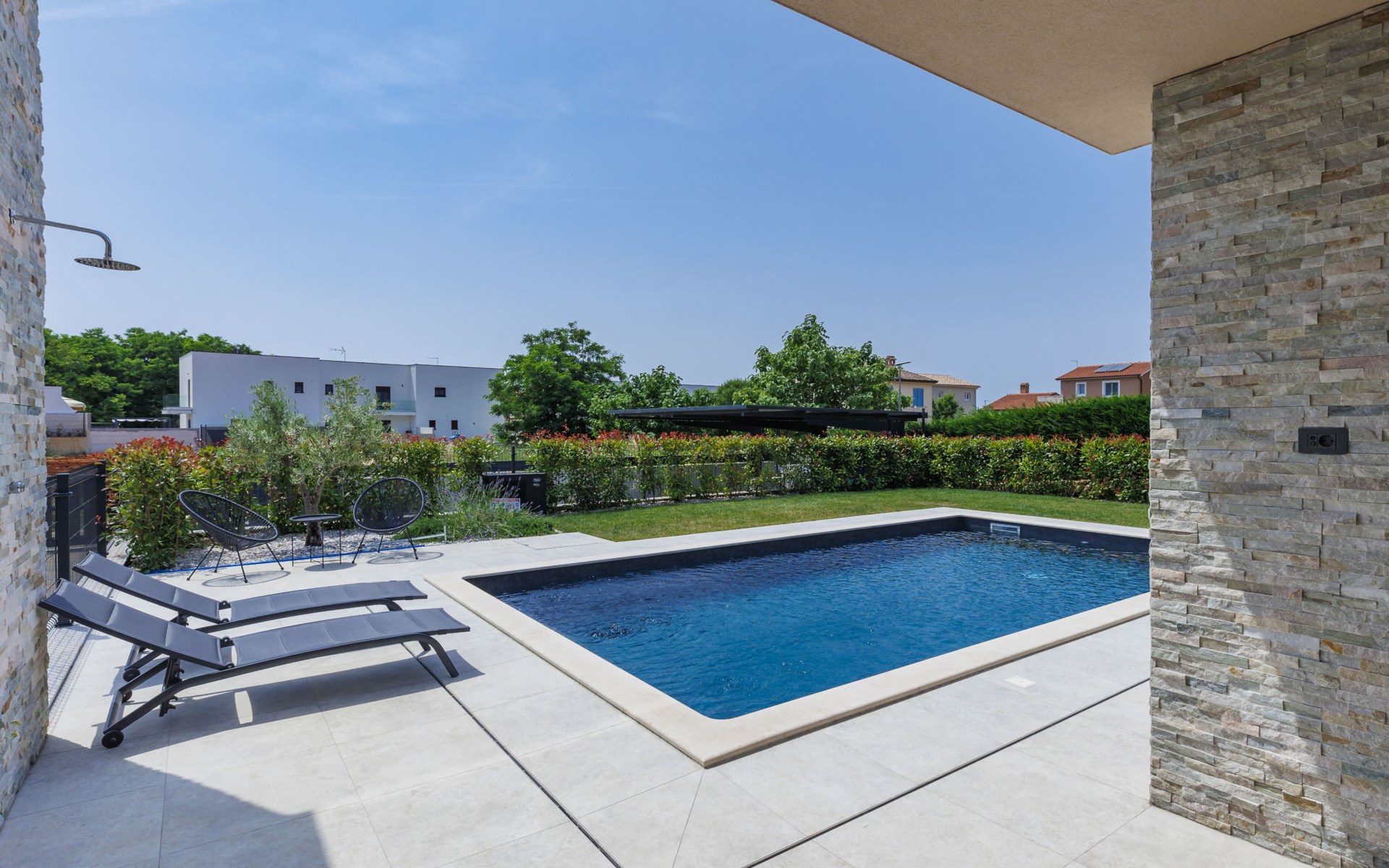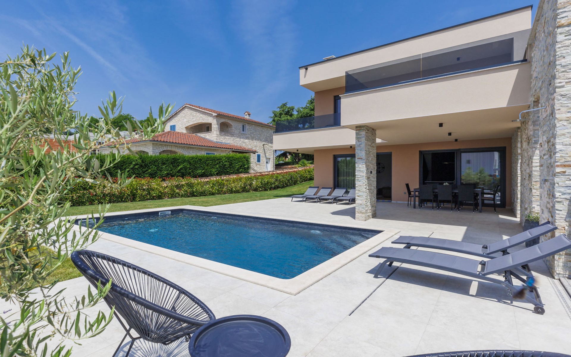 Kaštelir: Modern, luxurious villa "Prudensia", 2 storeys, built in 2022. In the hamlet Krančići 500 m from the centre of Kaštelir, 15 km from the centre of Poreč, in a sunny position, 10 km from the sea. Private: property 800 m2 (fenced), lawn, swimming pool angular, heated (10 x 4 m, depth 150 cm, seasonal availability: 01.Apr. - 30.Oct.) with internal staircase. Outdoor shower, hot tub, barbecue, pool maintenance by the owner/gardener. In the house: internet access, storage room for bicycles, washing machine, tumble dryer. Parking (for 3 cars) at the house on the premises. Shop 500 m, restaurant 2 km, bus stop 6 km, pebble beach 10 km, rocky beach 10 km. Walking paths from the house 100 m, cycle lane 150 m. Please note: suitable for families. The owner does not accept any youth groups. Neighbourhood highly sensitive to noise. Quietness and good behaviour expected. Video surveillance of the driveway and parking.