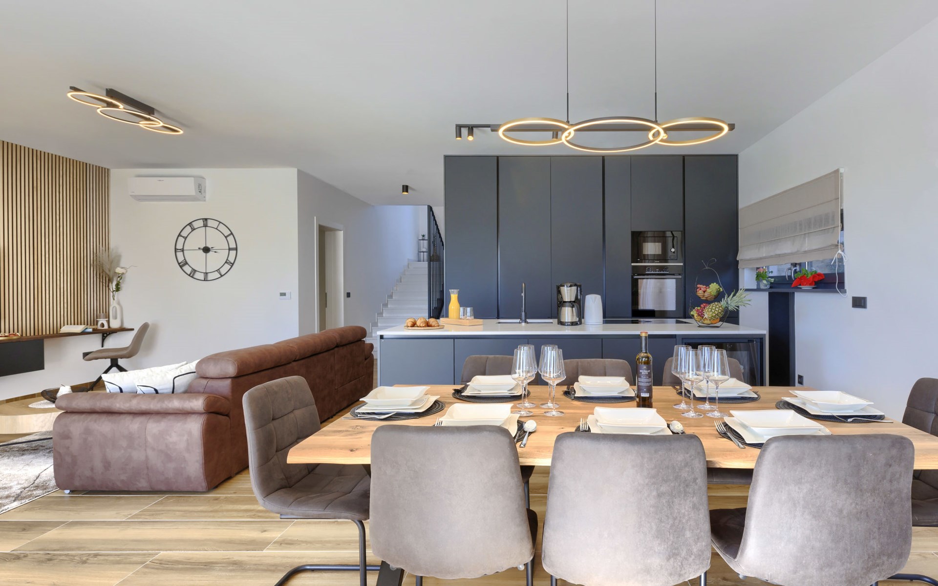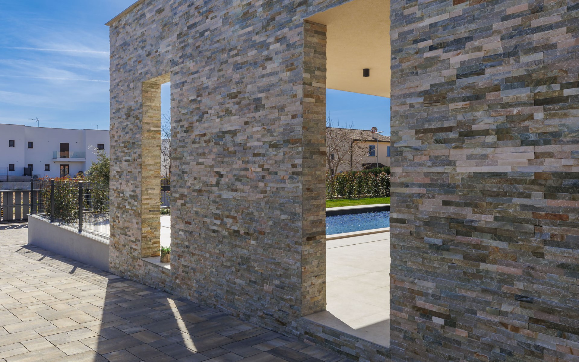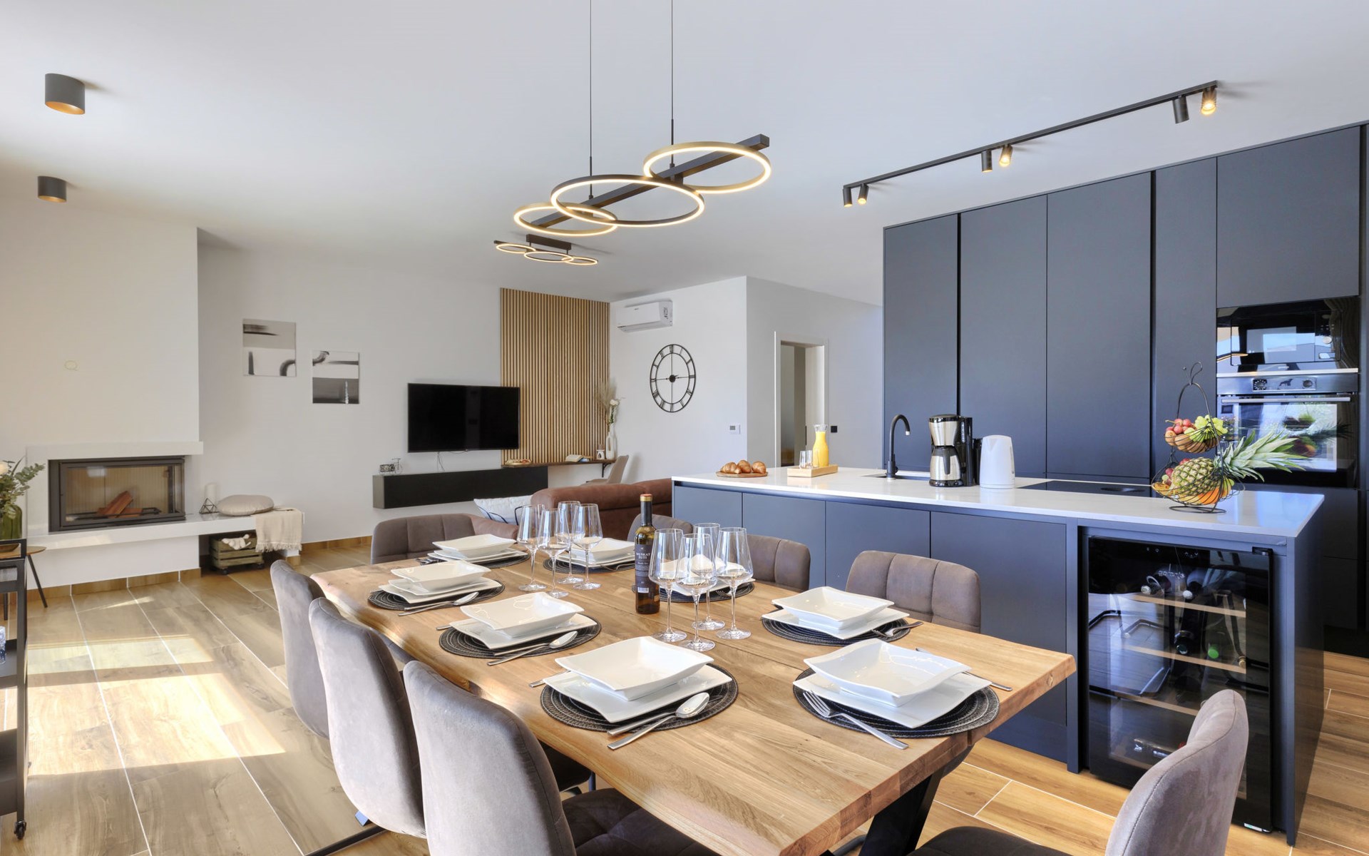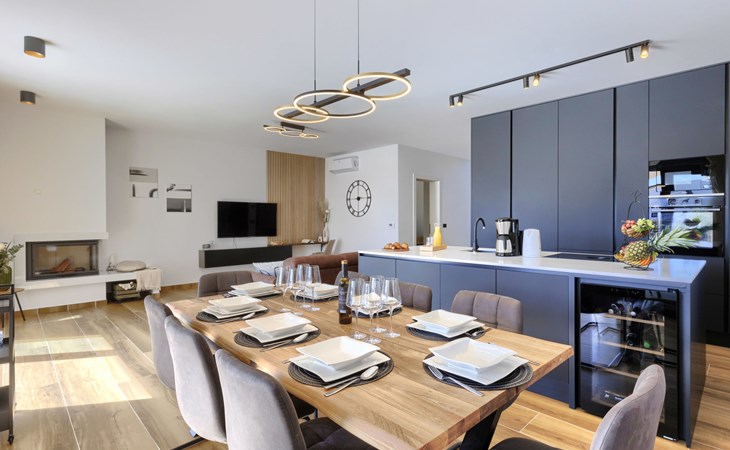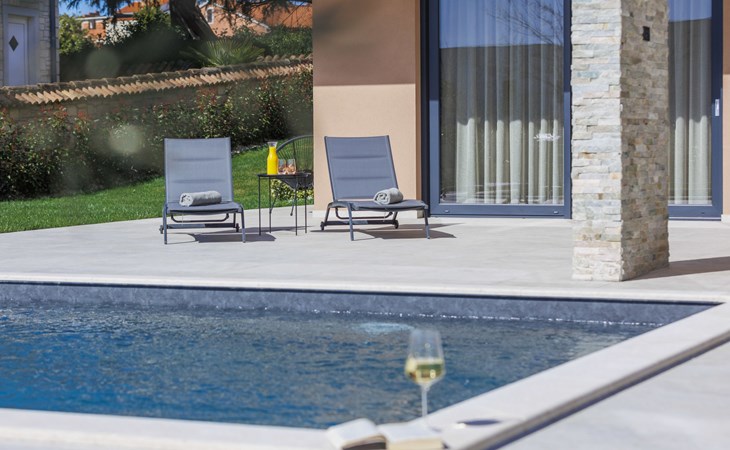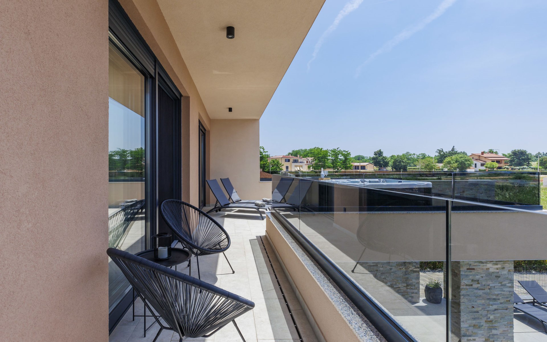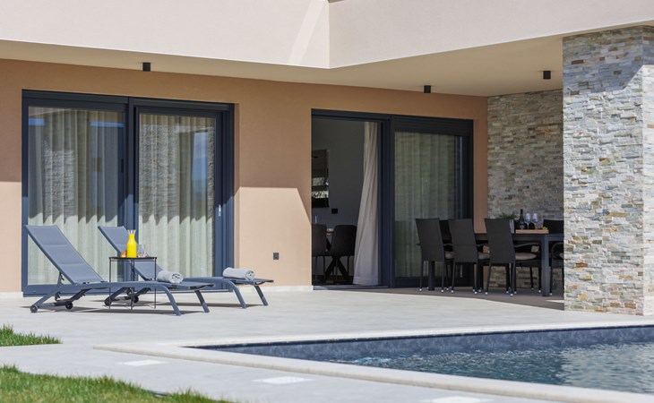 Kaštelir: Modern, luxurious villa "Prudensia", 2 storeys, built in 2022. In the hamlet Krančići 500 m from the centre of Kaštelir, 15 km from the centre of Poreč, in a sunny position, 10 km from the sea. Private: property 800 m2 (fenced), lawn, swimming pool angular, heated (10 x 4 m, depth 150 cm, seasonal availability: 01.Apr. - 30.Oct.) with internal staircase. Outdoor shower, hot tub, barbecue, pool maintenance by the owner/gardener. In the house: internet access, storage room for bicycles, washing machine, tumble dryer. Parking (for 3 cars) at the house on the premises. Shop 500 m, restaurant 2 km, bus stop 6 km, pebble beach 10 km, rocky beach 10 km. Walking paths from the house 100 m, cycle lane 150 m. Please note: suitable for families. The owner does not accept any youth groups. Neighbourhood highly sensitive to noise. Quietness and good behaviour expected. Video surveillance of the driveway and parking.