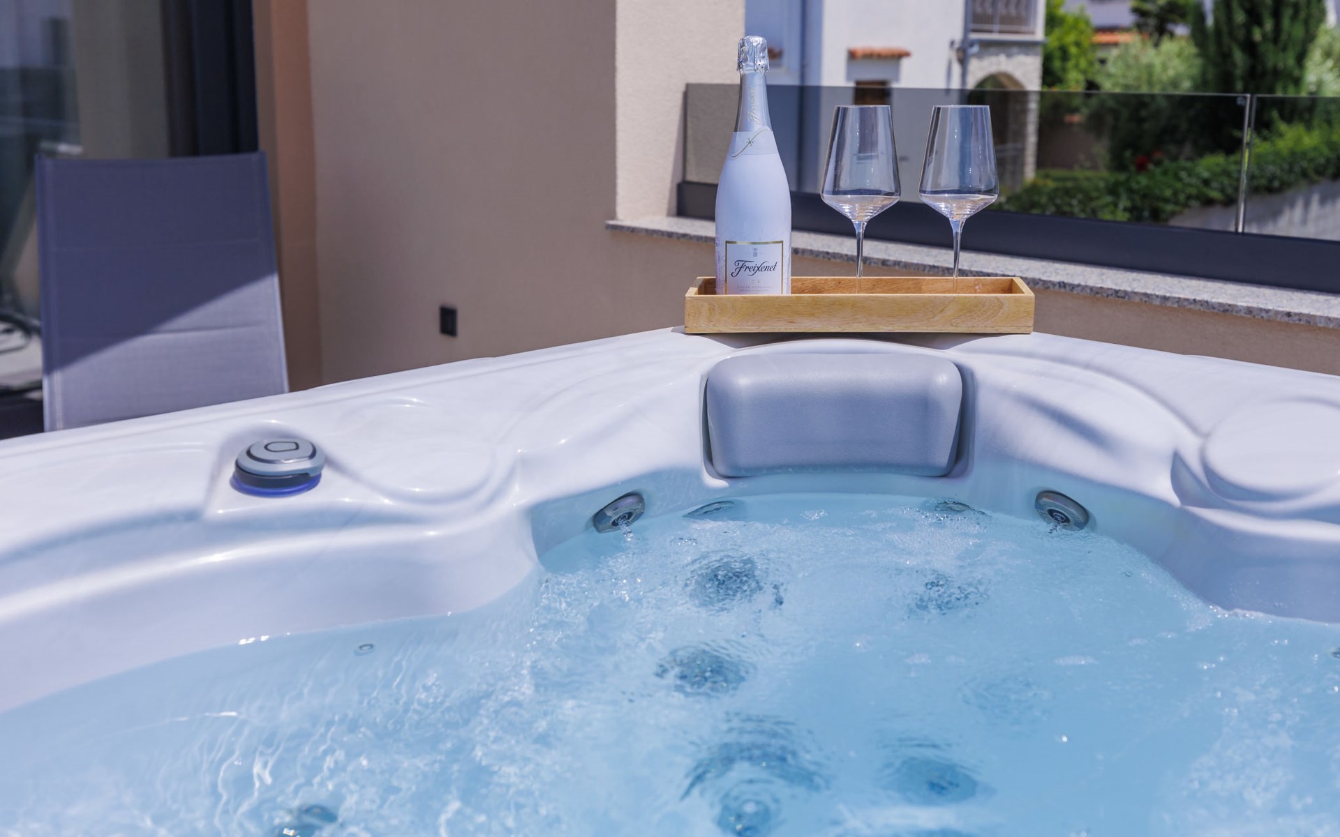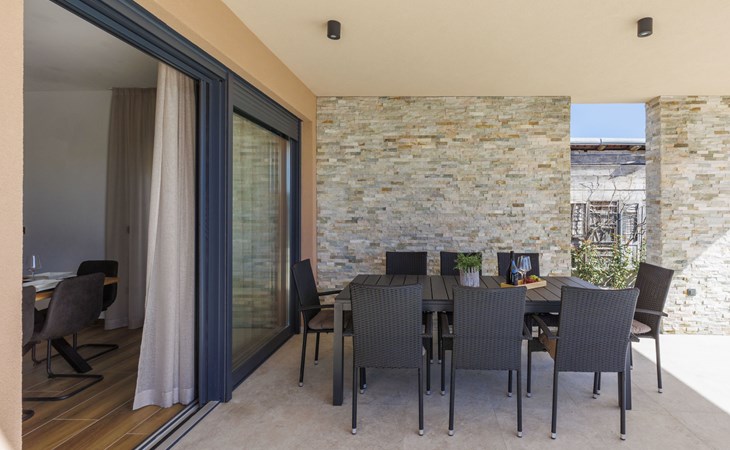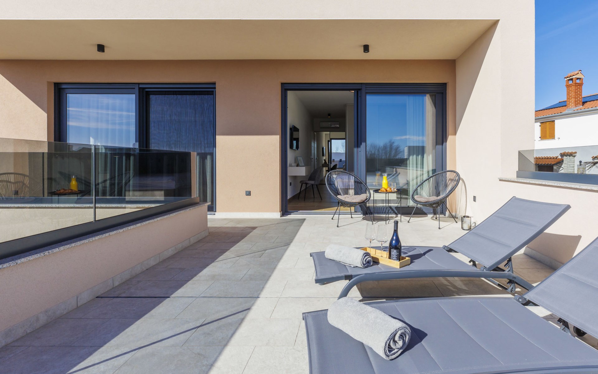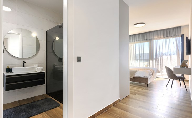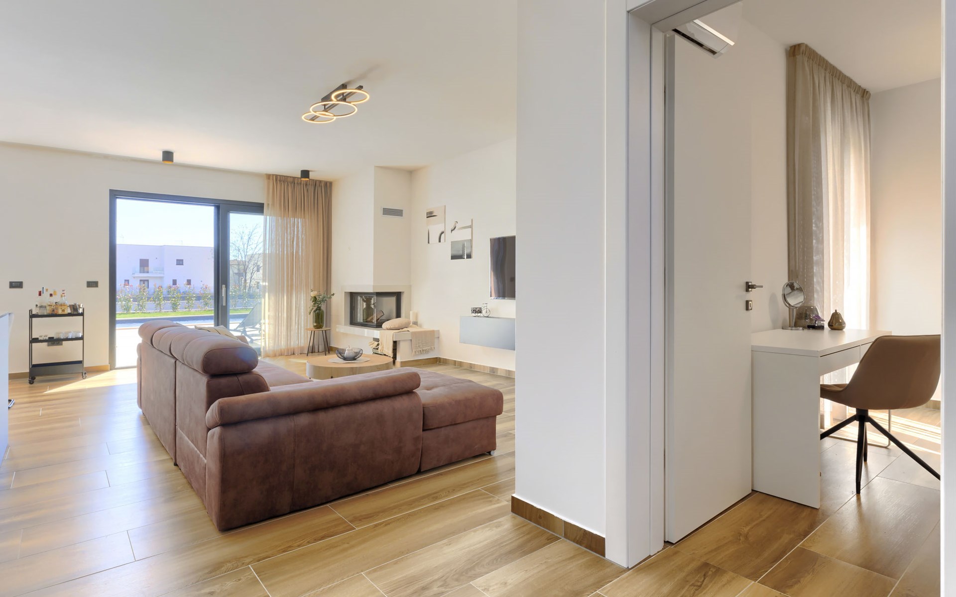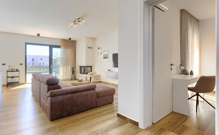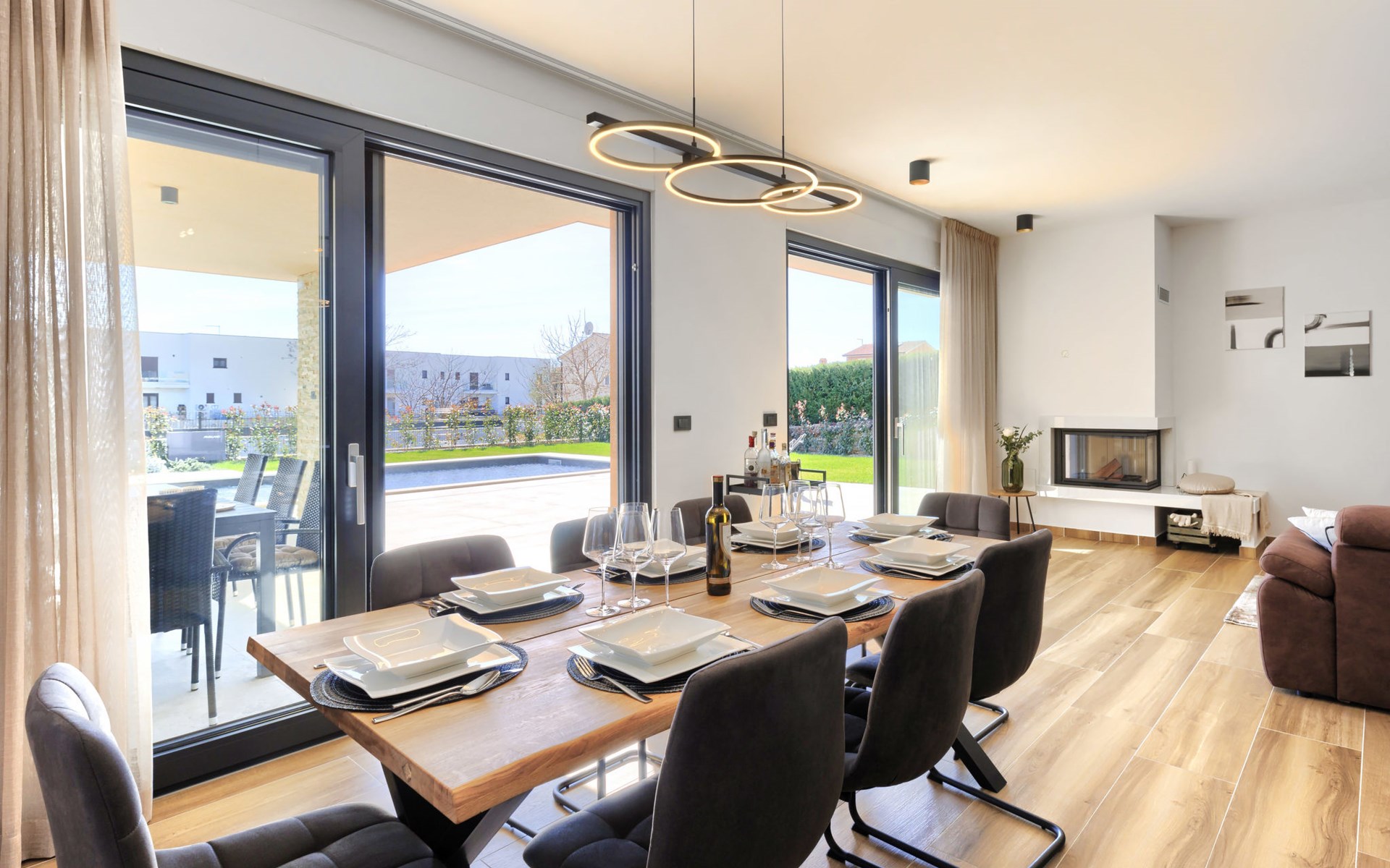 Kaštelir: Modern, luxurious villa "Prudensia", 2 storeys, built in 2022. In the hamlet Krančići 500 m from the centre of Kaštelir, 15 km from the centre of Poreč, in a sunny position, 10 km from the sea. Private: property 800 m2 (fenced), lawn, swimming pool angular, heated (10 x 4 m, depth 150 cm, seasonal availability: 01.Apr. - 30.Oct.) with internal staircase. Outdoor shower, hot tub, barbecue, pool maintenance by the owner/gardener. In the house: internet access, storage room for bicycles, washing machine, tumble dryer. Parking (for 3 cars) at the house on the premises. Shop 500 m, restaurant 2 km, bus stop 6 km, pebble beach 10 km, rocky beach 10 km. Walking paths from the house 100 m, cycle lane 150 m. Please note: suitable for families. The owner does not accept any youth groups. Neighbourhood highly sensitive to noise. Quietness and good behaviour expected. Video surveillance of the driveway and parking.
