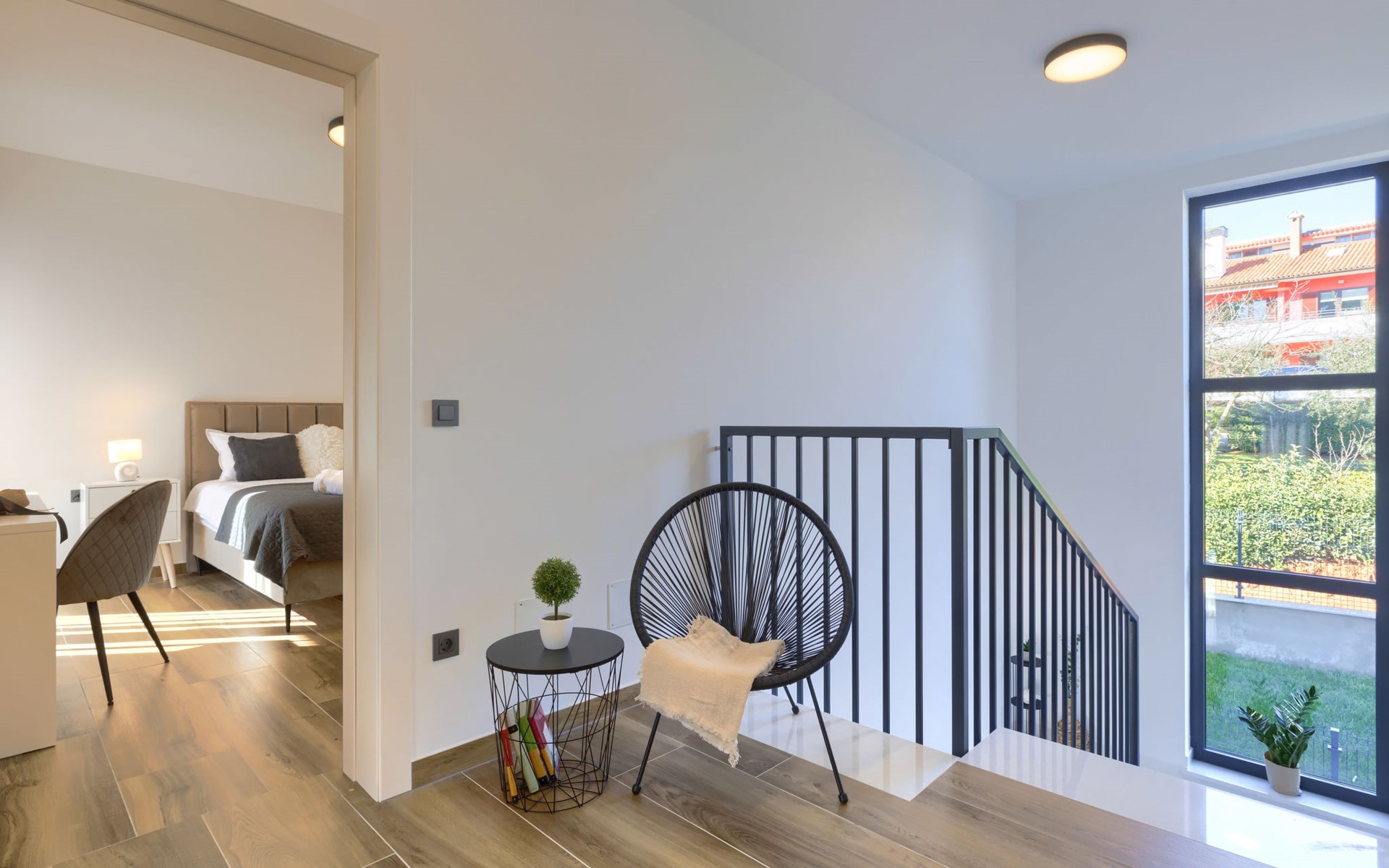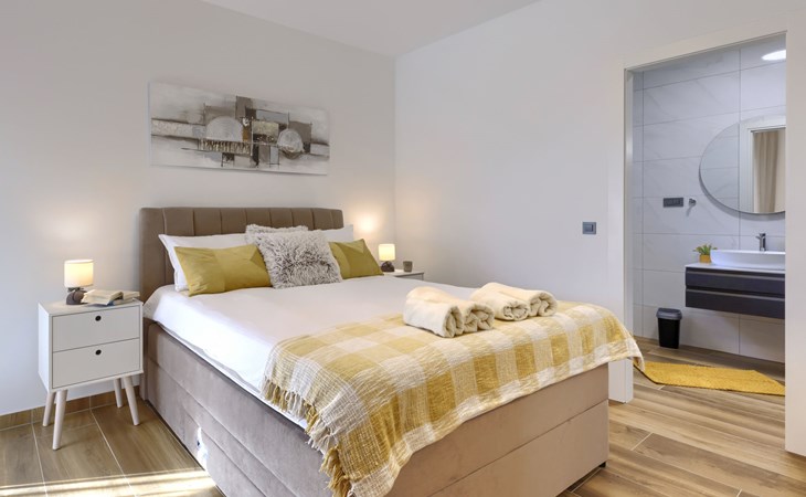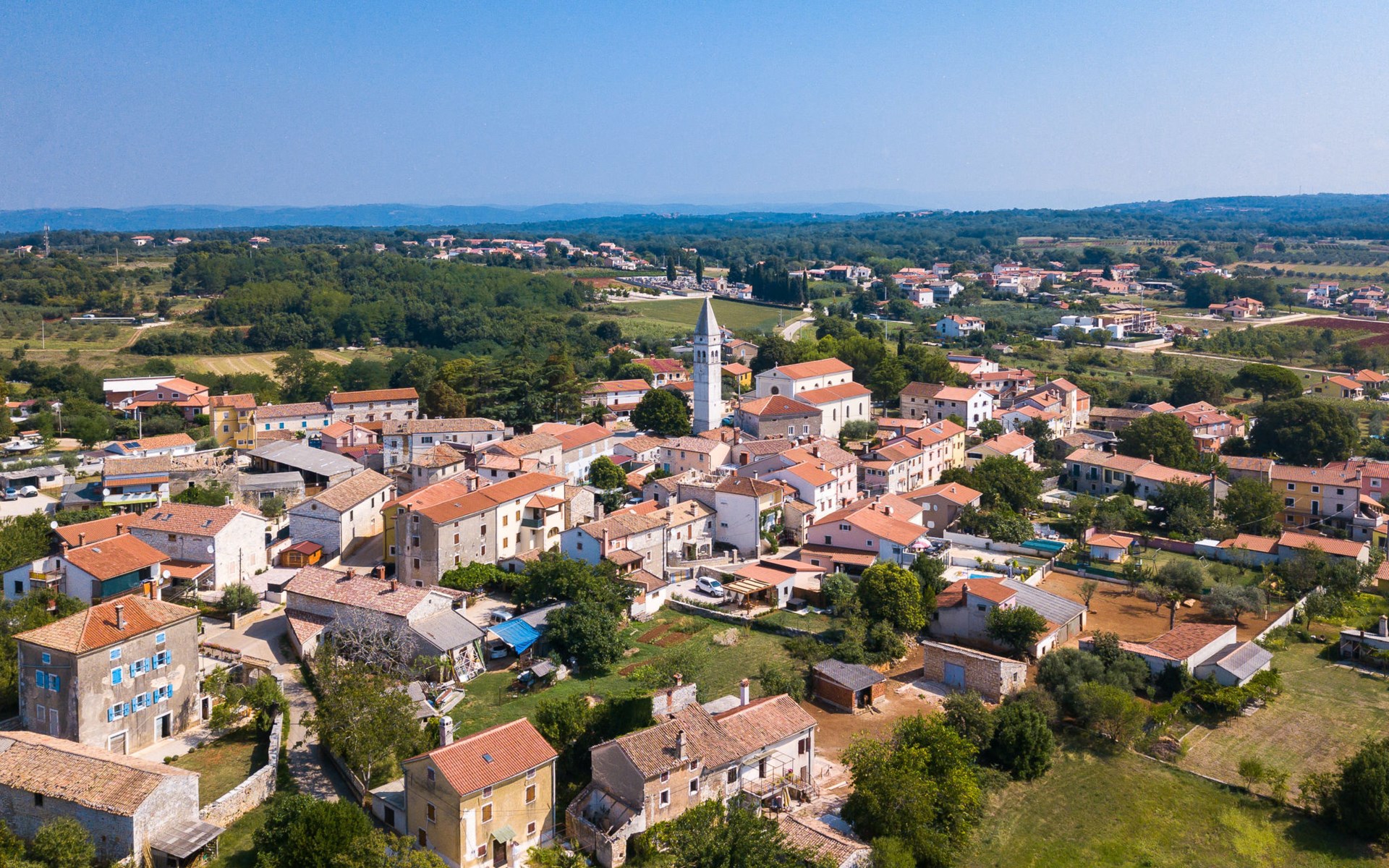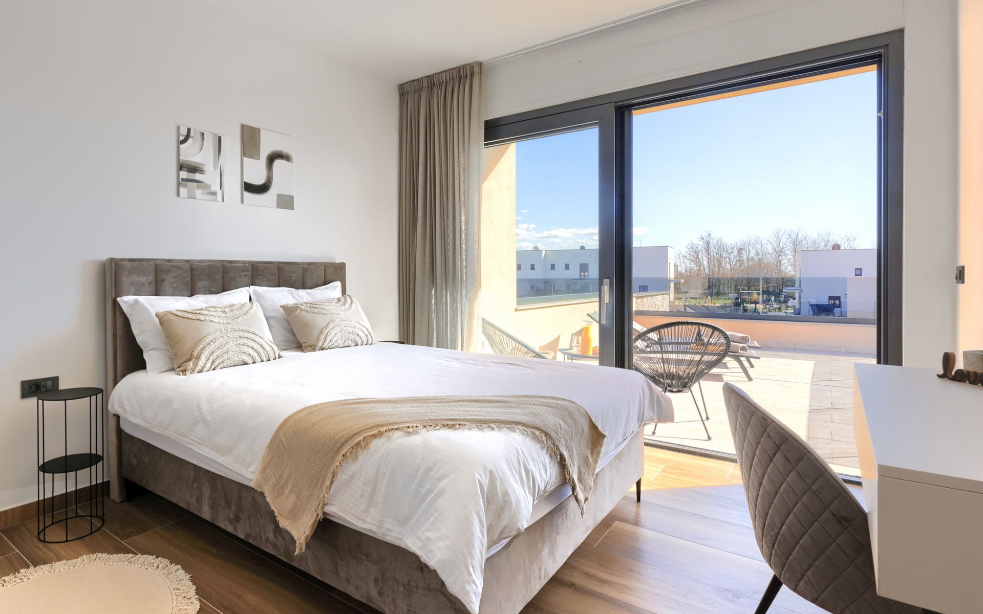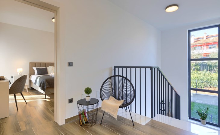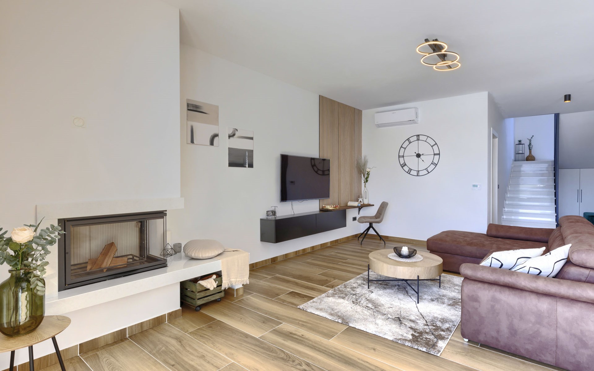 Kaštelir: Modern, luxurious villa "Prudensia", 2 storeys, built in 2022. In the hamlet Krančići 500 m from the centre of Kaštelir, 15 km from the centre of Poreč, in a sunny position, 10 km from the sea. Private: property 800 m2 (fenced), lawn, swimming pool angular, heated (10 x 4 m, depth 150 cm, seasonal availability: 01.Apr. - 30.Oct.) with internal staircase. Outdoor shower, hot tub, barbecue, pool maintenance by the owner/gardener. In the house: internet access, storage room for bicycles, washing machine, tumble dryer. Parking (for 3 cars) at the house on the premises. Shop 500 m, restaurant 2 km, bus stop 6 km, pebble beach 10 km, rocky beach 10 km. Walking paths from the house 100 m, cycle lane 150 m. Please note: suitable for families. The owner does not accept any youth groups. Neighbourhood highly sensitive to noise. Quietness and good behaviour expected. Video surveillance of the driveway and parking.