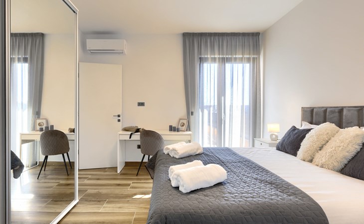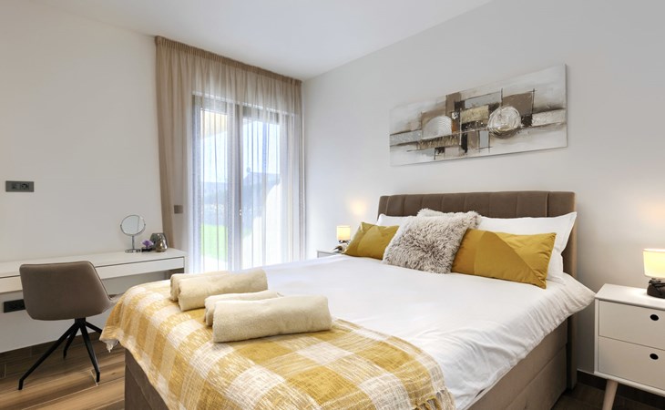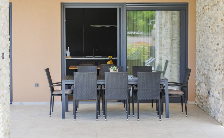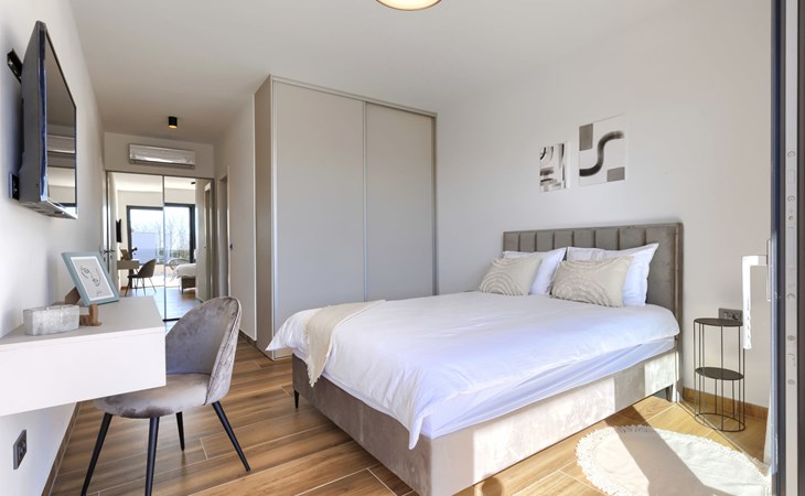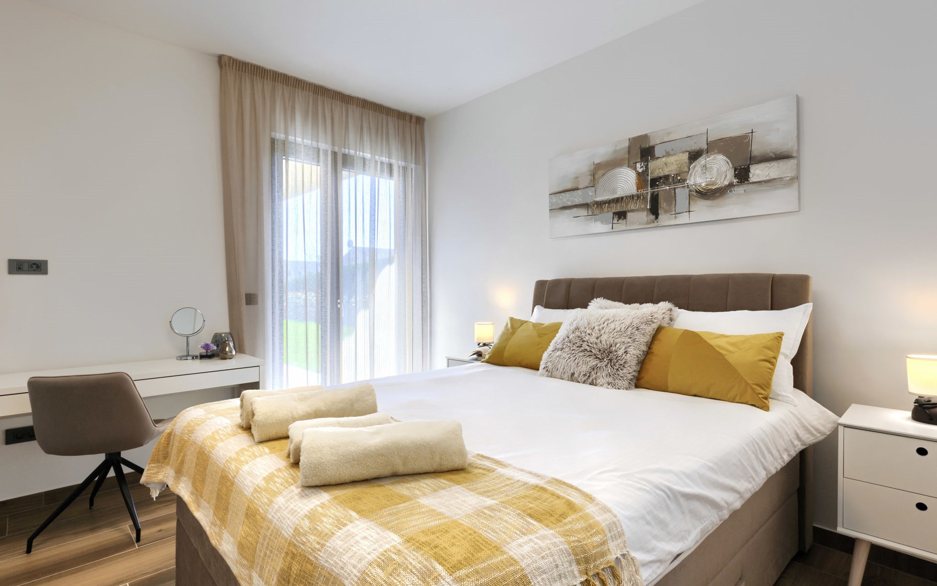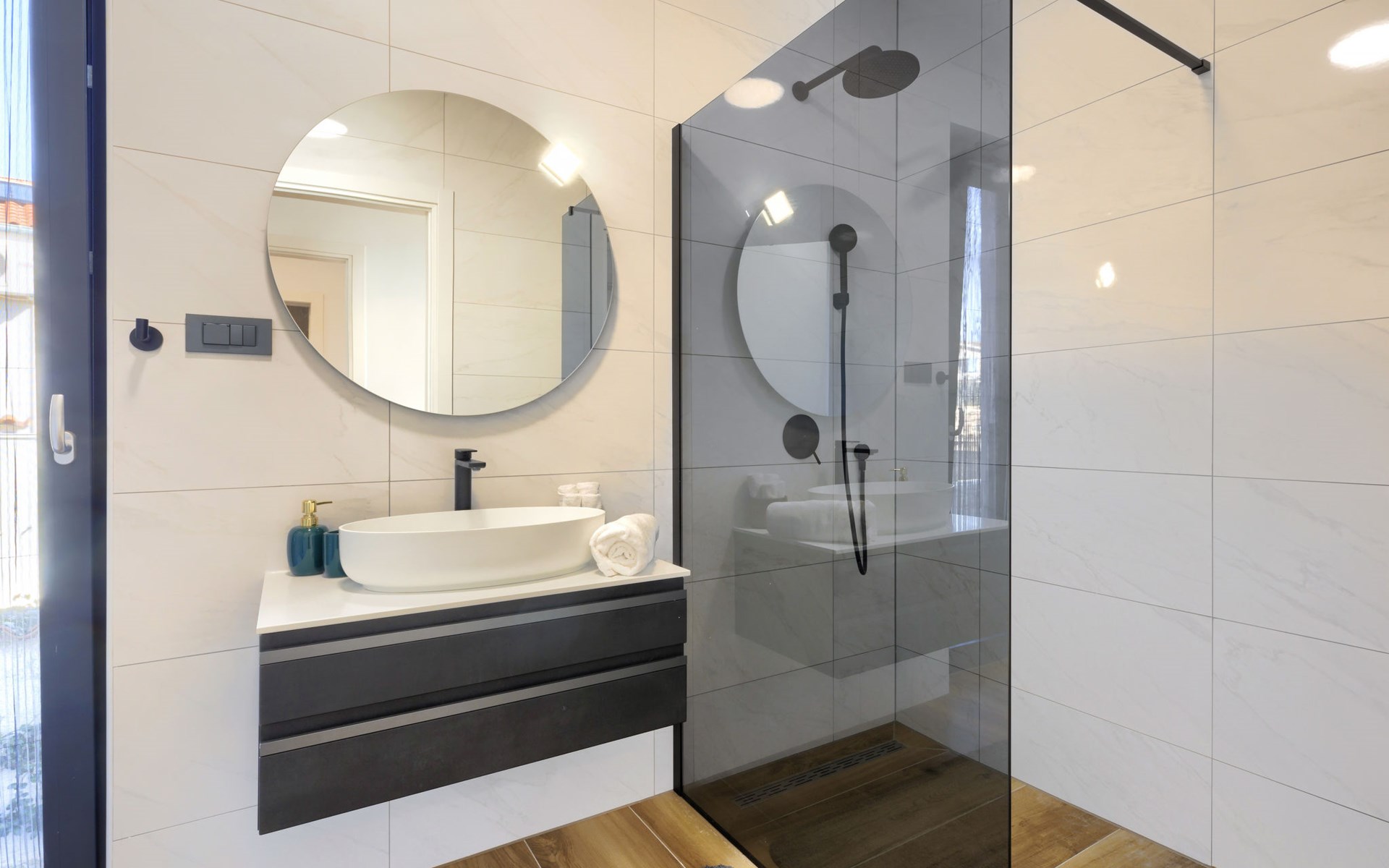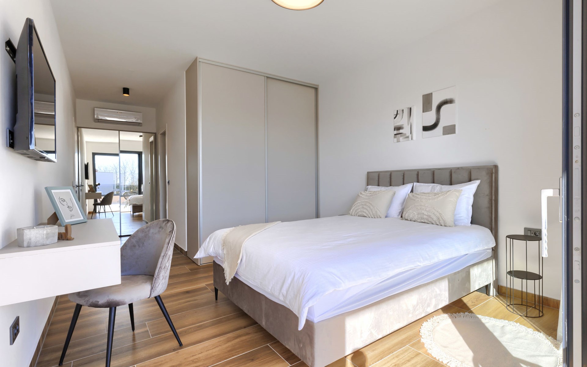 Kaštelir: Modern, luxurious villa "Prudensia", 2 storeys, built in 2022. In the hamlet Krančići 500 m from the centre of Kaštelir, 15 km from the centre of Poreč, in a sunny position, 10 km from the sea. Private: property 800 m2 (fenced), lawn, swimming pool angular, heated (10 x 4 m, depth 150 cm, seasonal availability: 01.Apr. - 30.Oct.) with internal staircase. Outdoor shower, hot tub, barbecue, pool maintenance by the owner/gardener. In the house: internet access, storage room for bicycles, washing machine, tumble dryer. Parking (for 3 cars) at the house on the premises. Shop 500 m, restaurant 2 km, bus stop 6 km, pebble beach 10 km, rocky beach 10 km. Walking paths from the house 100 m, cycle lane 150 m. Please note: suitable for families. The owner does not accept any youth groups. Neighbourhood highly sensitive to noise. Quietness and good behaviour expected. Video surveillance of the driveway and parking.