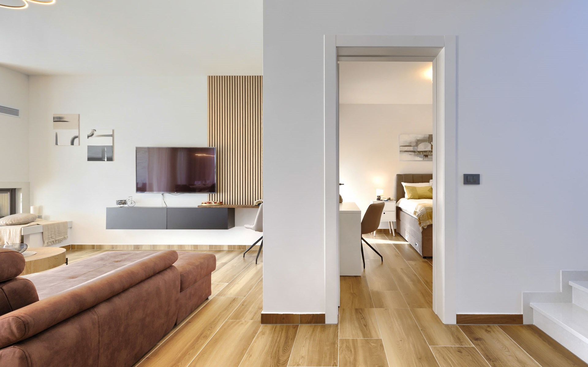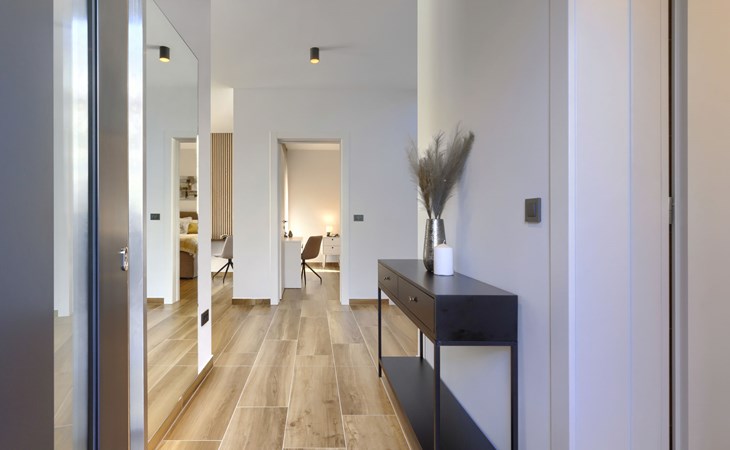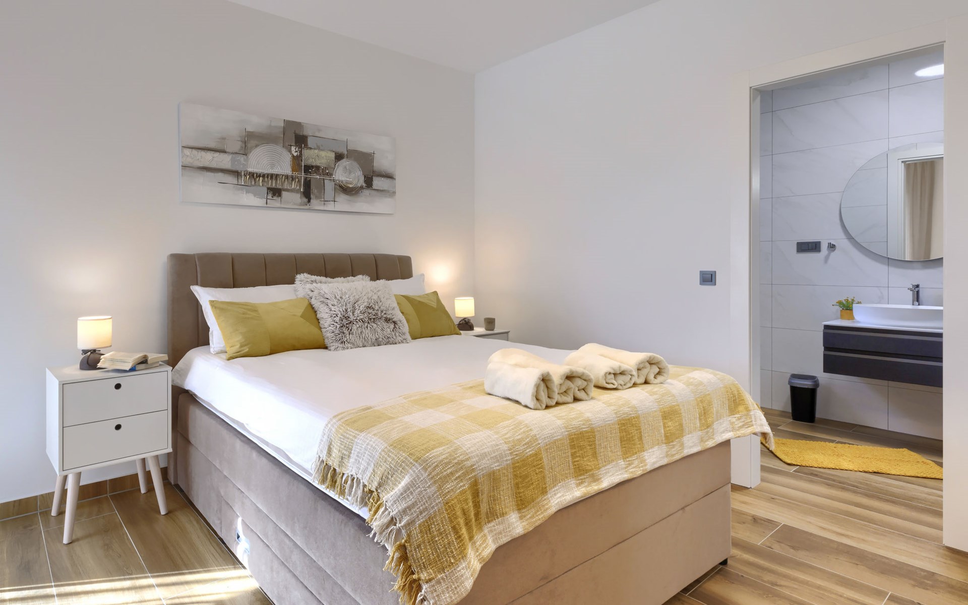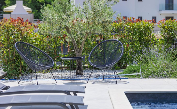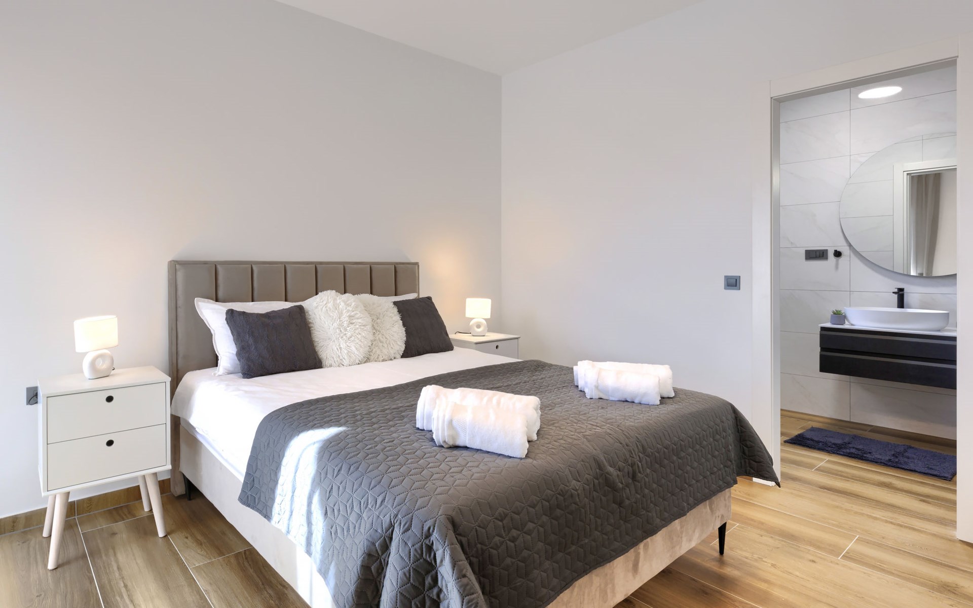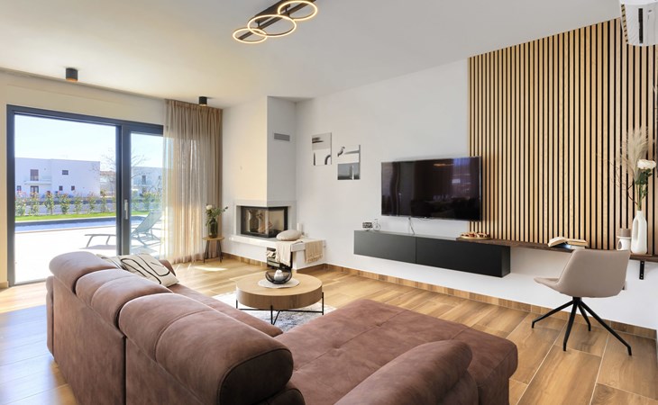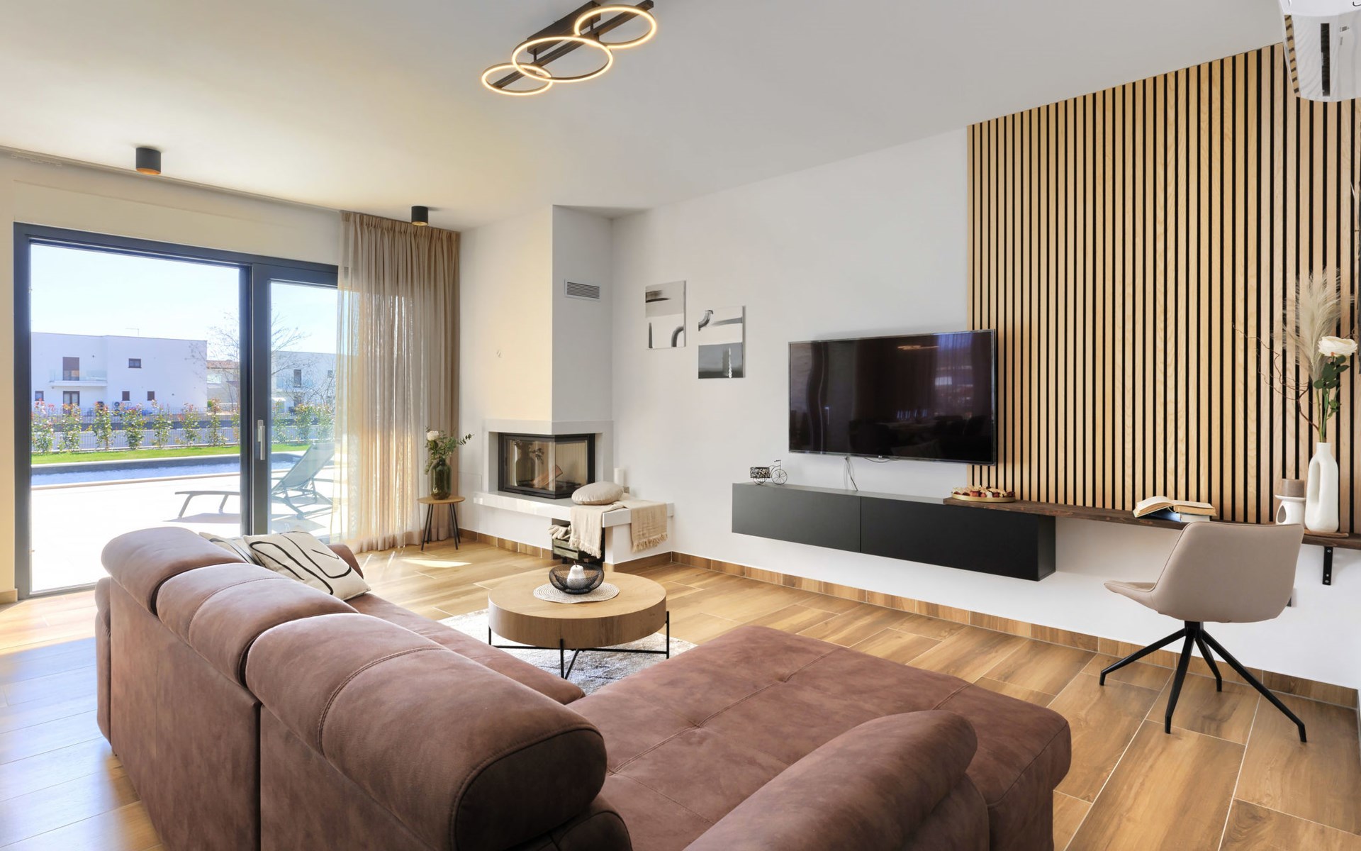 Kaštelir: Modern, luxurious villa "Prudensia", 2 storeys, built in 2022. In the hamlet Krančići 500 m from the centre of Kaštelir, 15 km from the centre of Poreč, in a sunny position, 10 km from the sea. Private: property 800 m2 (fenced), lawn, swimming pool angular, heated (10 x 4 m, depth 150 cm, seasonal availability: 01.Apr. - 30.Oct.) with internal staircase. Outdoor shower, hot tub, barbecue, pool maintenance by the owner/gardener. In the house: internet access, storage room for bicycles, washing machine, tumble dryer. Parking (for 3 cars) at the house on the premises. Shop 500 m, restaurant 2 km, bus stop 6 km, pebble beach 10 km, rocky beach 10 km. Walking paths from the house 100 m, cycle lane 150 m. Please note: suitable for families. The owner does not accept any youth groups. Neighbourhood highly sensitive to noise. Quietness and good behaviour expected. Video surveillance of the driveway and parking.