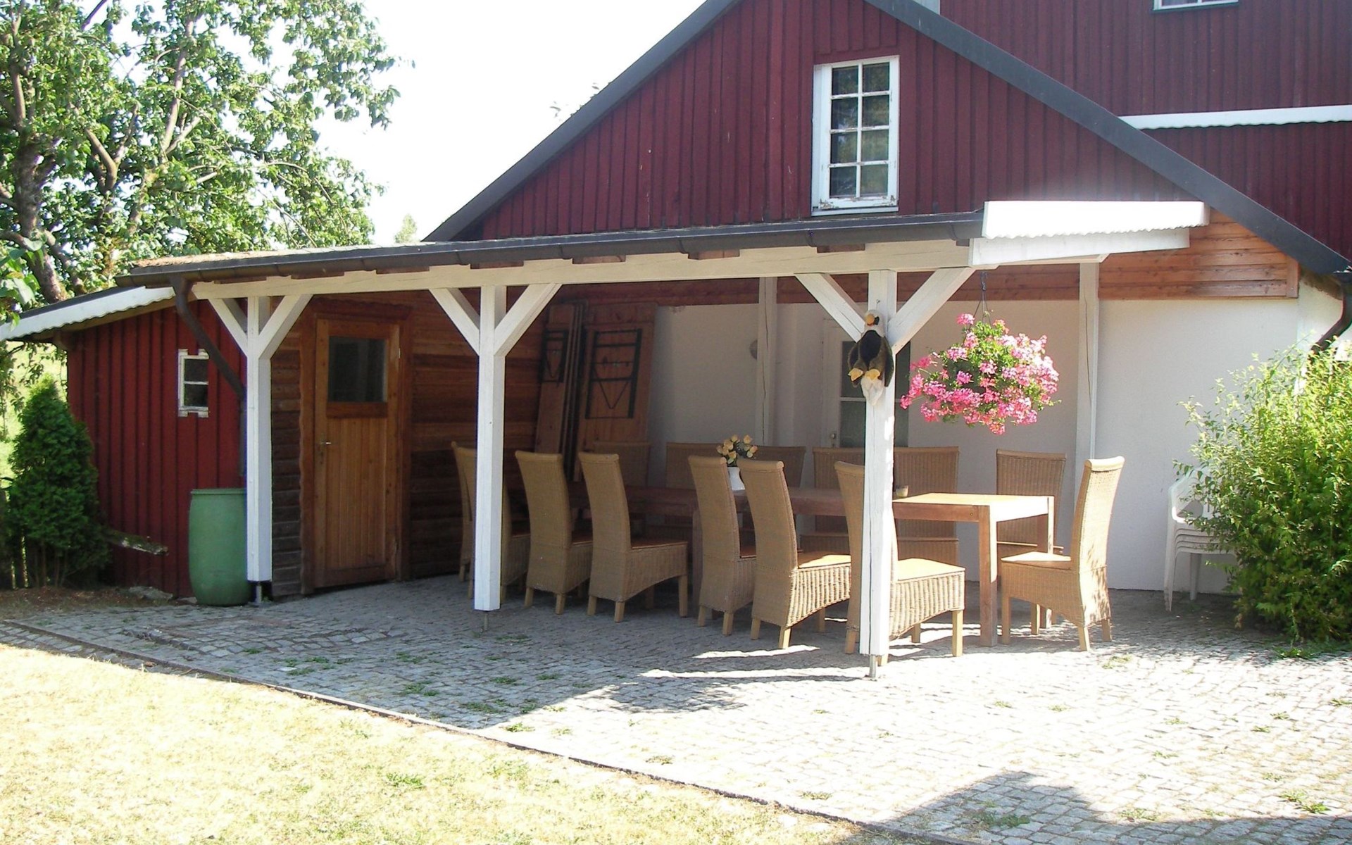 COVERED SEATING TERRACE WITH WOODEN TABLE AND WICKER CHAIRS + BARBECUE FIREPLACE