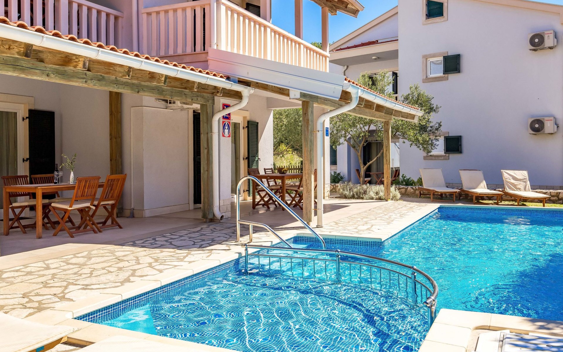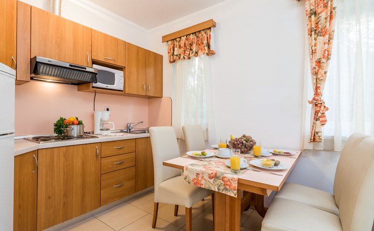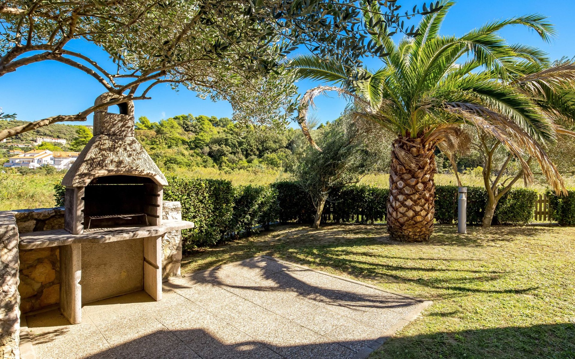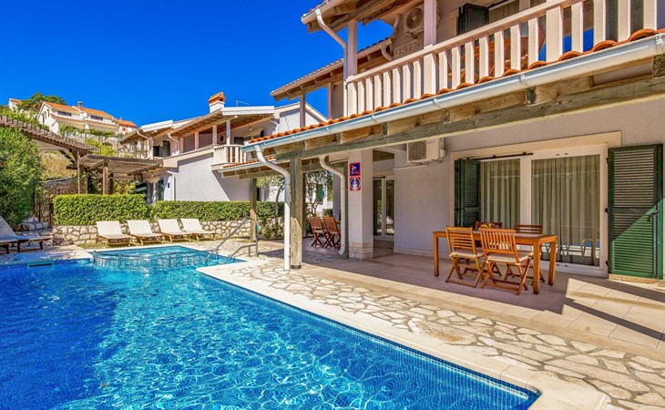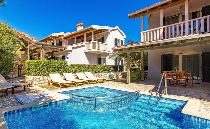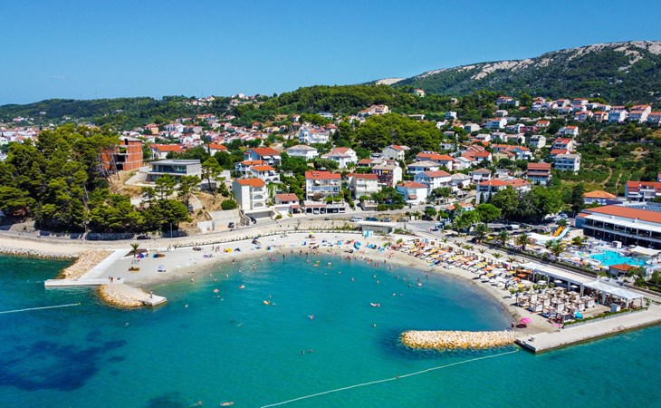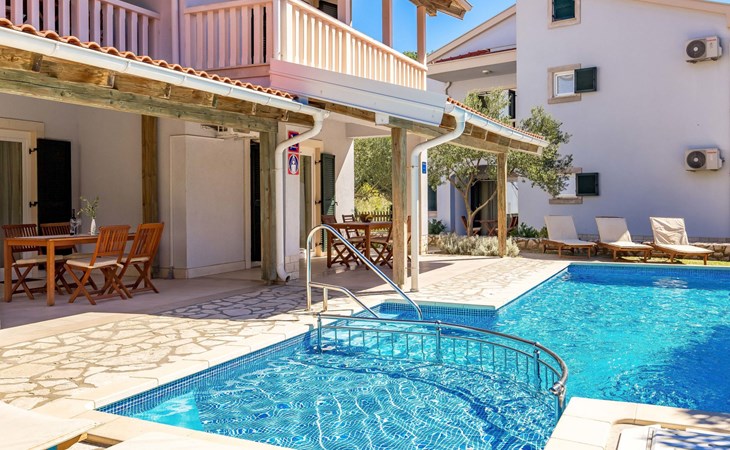 Beautiful apartment block. In the district of Palit 2 km from the centre of Rab, outside the resort, in a sunny, elevated position, 100 m from the sea, 250 m from the beach. For shared use: property (fenced), well-kept garden with lawn, swimming pool angular heated (9 x 4 m, depth 120 - 160 cm, seasonal availability: 13.May. - 30.Sep.) with internal staircase. Children's pool, outdoor shower, garden furniture, barbecue. In the house: internet access. Roofed, parking at the house. Shop 900 m, restaurant 1 km, bus stop 1.9 km, sandy beach, pebble beach 250 m, public bathing area 900 m. Tennis 2.5 km. Please note: the photograph shows a typical example. Additional accommodations can be booked. Property ref. HR3700.301, 304 is situated on the same property. The apartment house "Mihaela" is situated on the same grounds (1600 m2) with apartment houses "Ivan" and "Pavica", with swimming pool for shared use, with counterflow. One part of the pool is a paddling pool, depth 30 - 60cm. Deck chairs at disposal. The old town of Rab can be reached by a coastal promenade (20 minutes walk).
