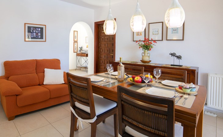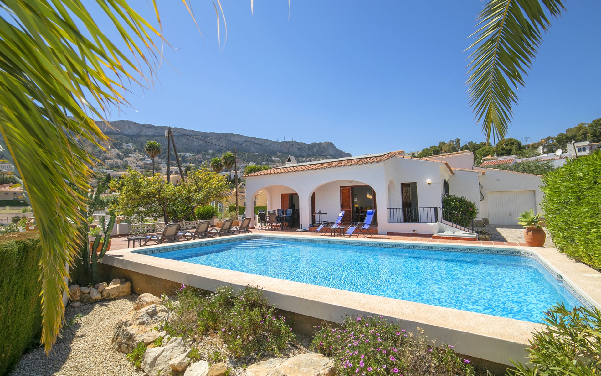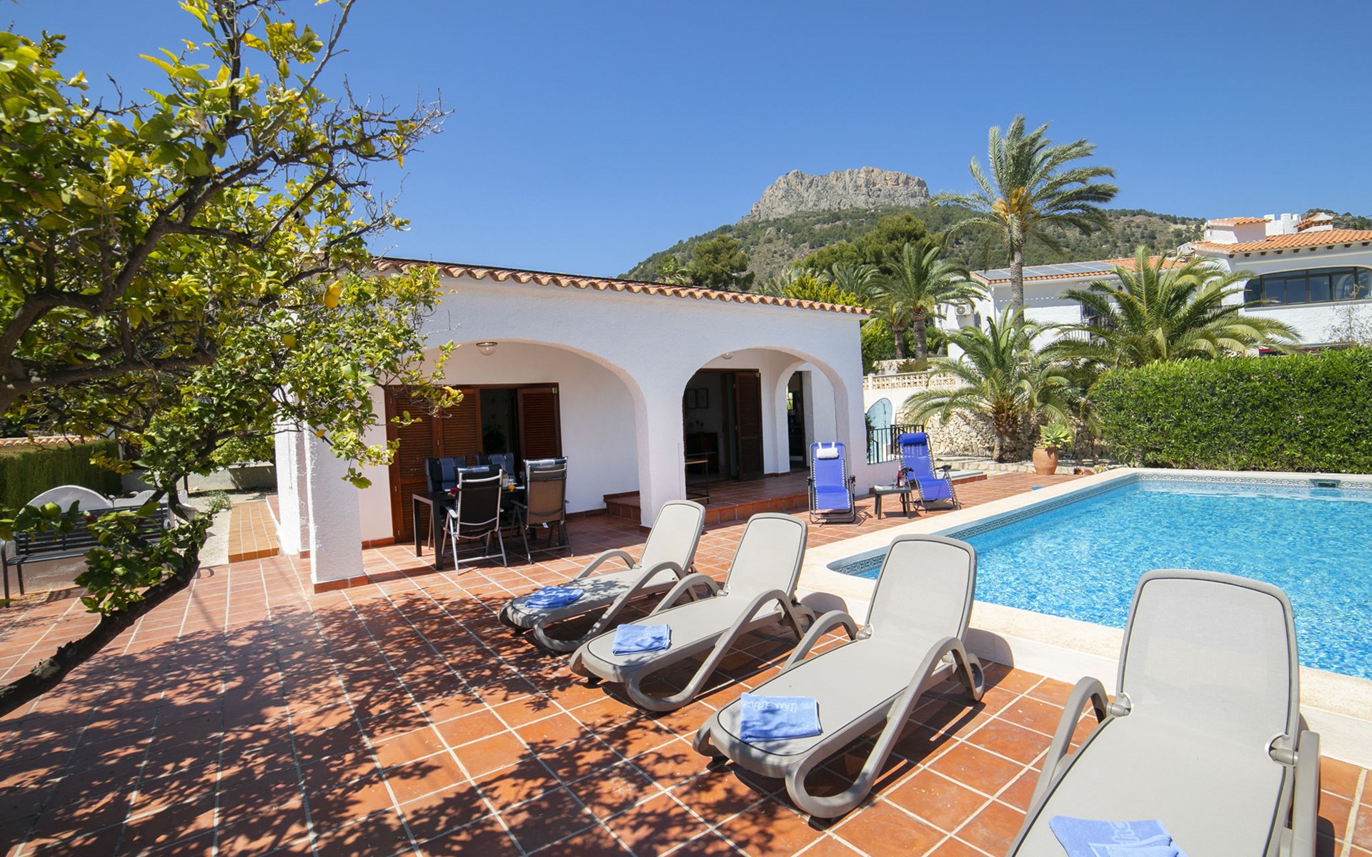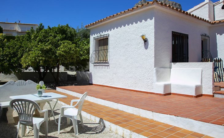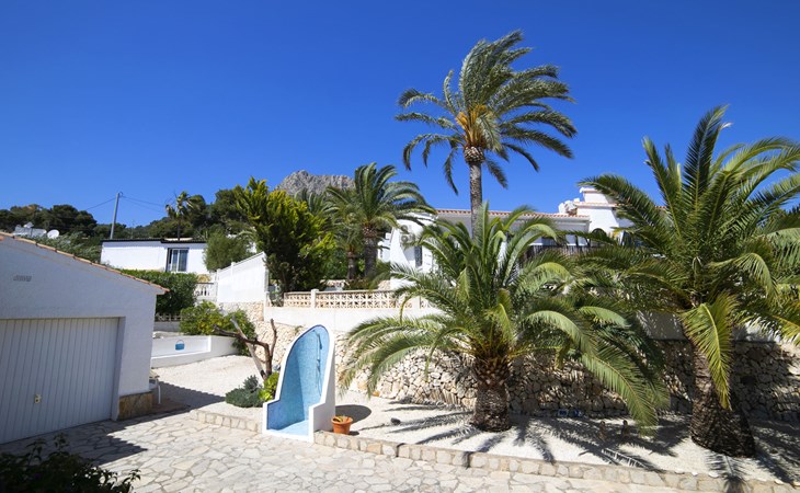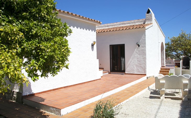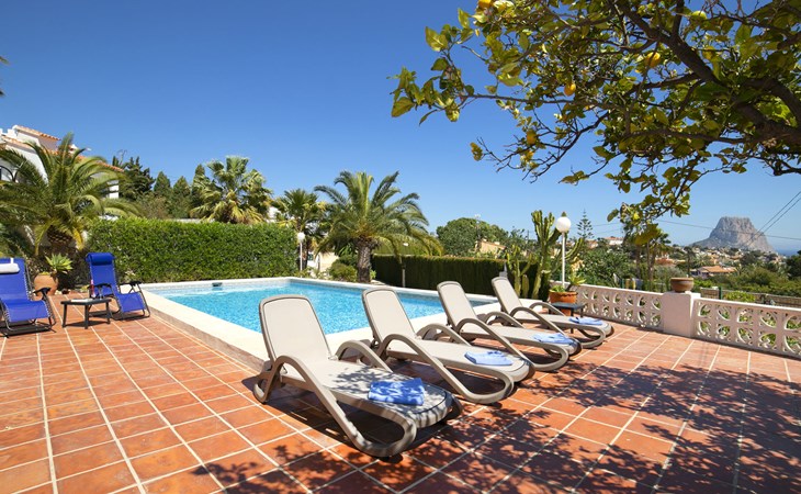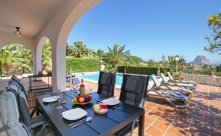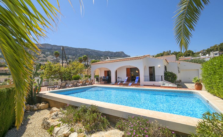 Canuta Ifach: Beautiful single-family house "Cecile". 2.2 km from the centre of Calpe, in a quiet position, 1.3 km from the sea, in a cul-de-sac. Private: property 1'100 m2 (fenced), garden, swimming pool (9 x 5 m, depth 90 - 170 cm, seasonal availability: 01.Jan. - 31.Dec.) with internal staircase. Outdoor shower, terrace, garden furniture, barbecue. In the house: central heating system, heating available only from 01.Nov. - 30.Apr.. Parking at the house. Supermarket 2.3 km, restaurant 500 m, bus stop 2 km, sandy beach 1.3 km. Sports harbour 1.3 km. Nearby attractions: Aqualandia, Mundomar, Terra MÃtica, Terra Natura, y Benidorm Palace (Benidorm). Terraces have both sun and shade.