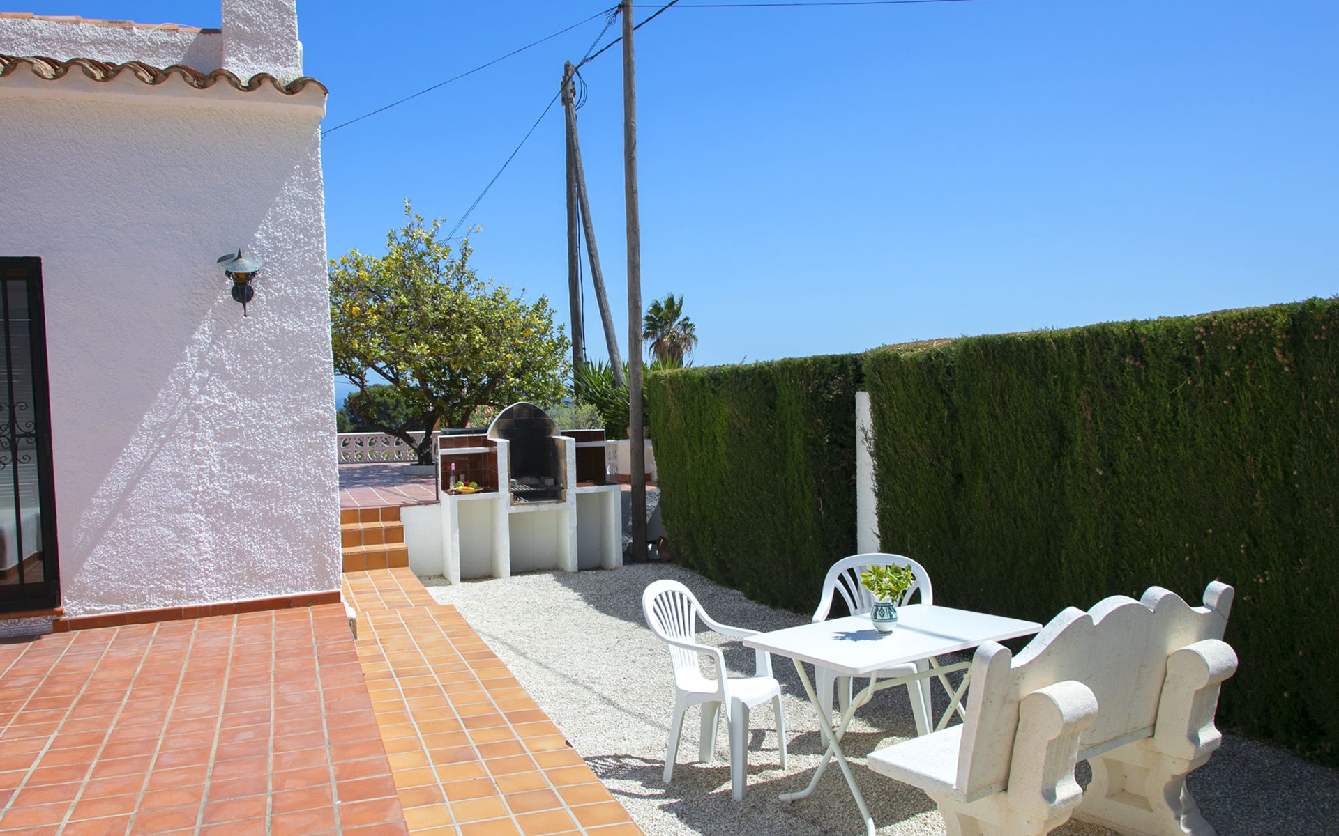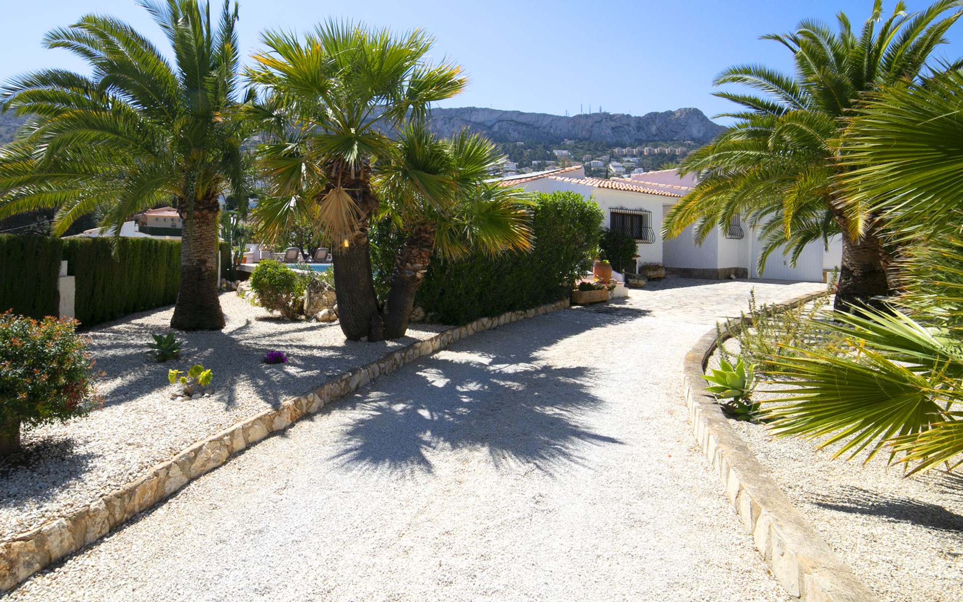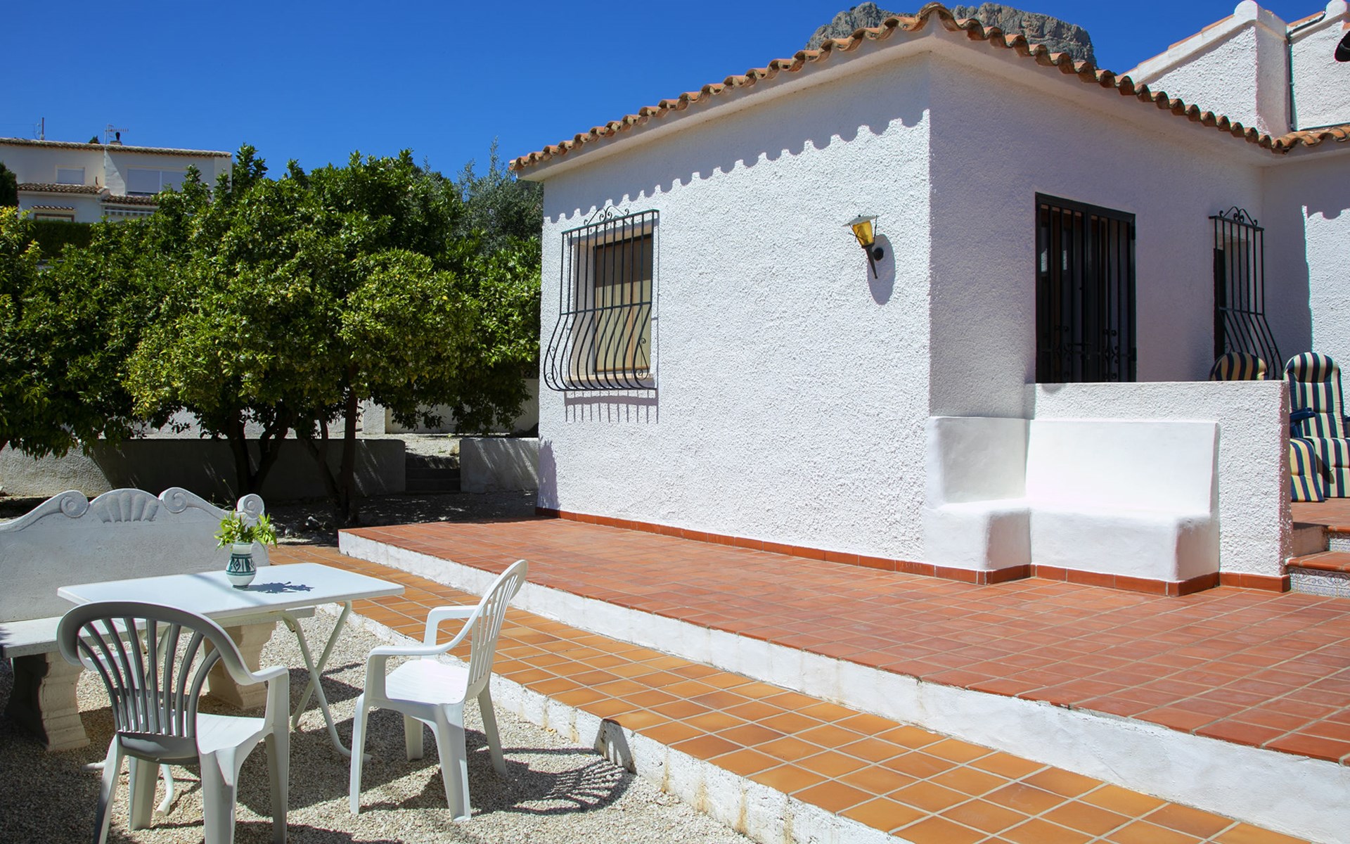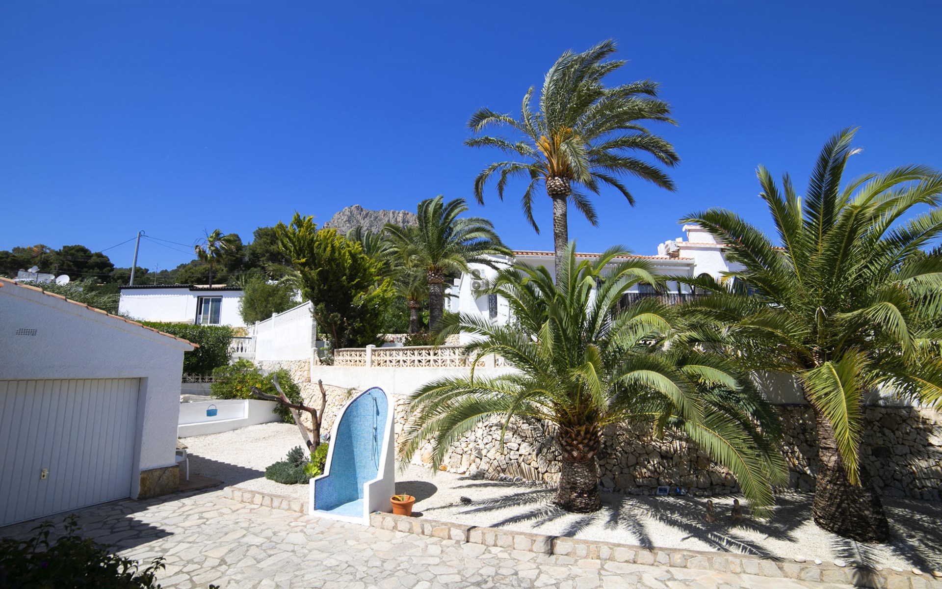 Canuta Ifach: Beautiful single-family house "Cecile". 2.2 km from the centre of Calpe, in a quiet position, 1.3 km from the sea, in a cul-de-sac. Private: property 1'100 m2 (fenced), garden, swimming pool (9 x 5 m, depth 90 - 170 cm, seasonal availability: 01.Jan. - 31.Dec.) with internal staircase. Outdoor shower, terrace, garden furniture, barbecue. In the house: central heating system, heating available only from 01.Nov. - 30.Apr.. Parking at the house. Supermarket 2.3 km, restaurant 500 m, bus stop 2 km, sandy beach 1.3 km. Sports harbour 1.3 km. Nearby attractions: Aqualandia, Mundomar, Terra MÃtica, Terra Natura, y Benidorm Palace (Benidorm). Terraces have both sun and shade.