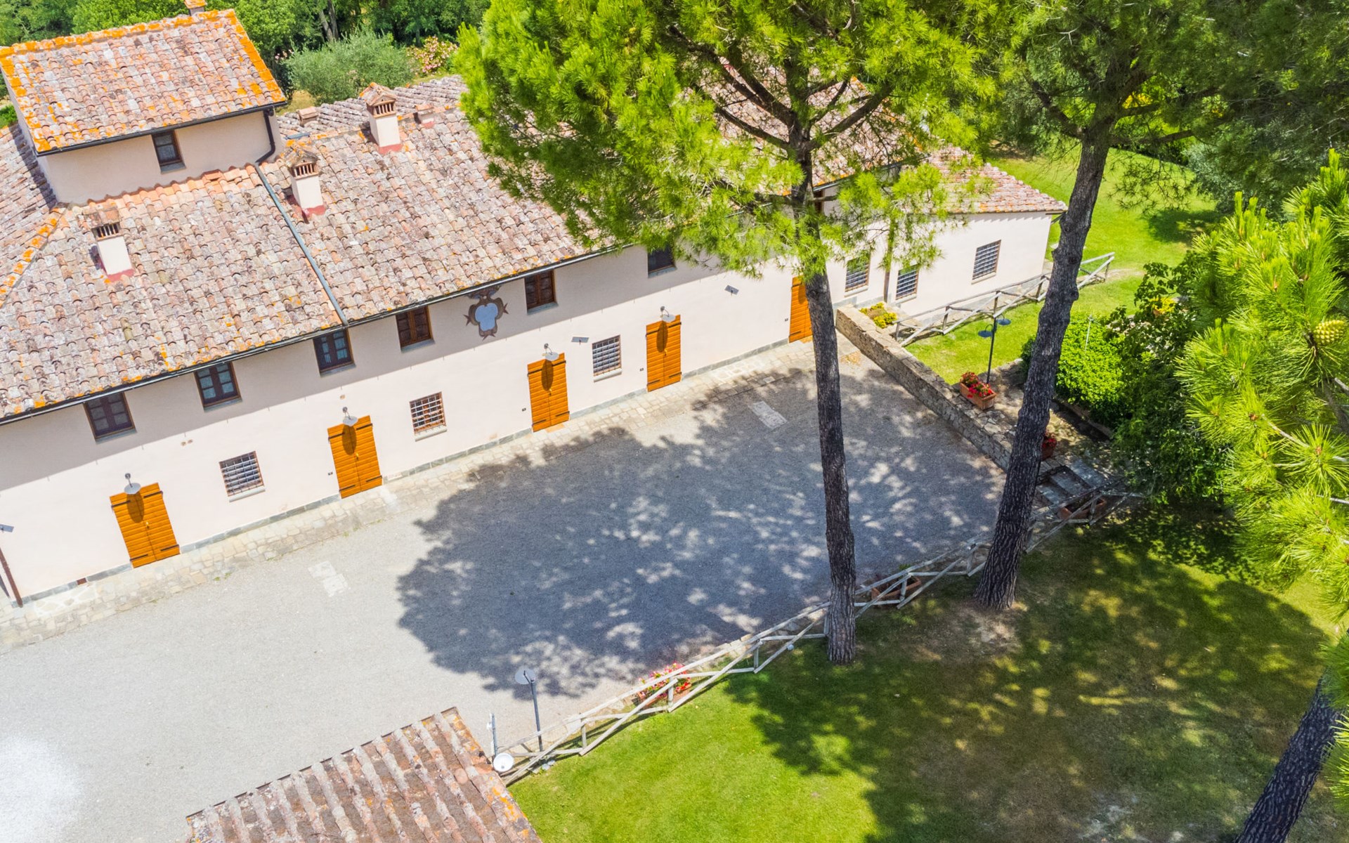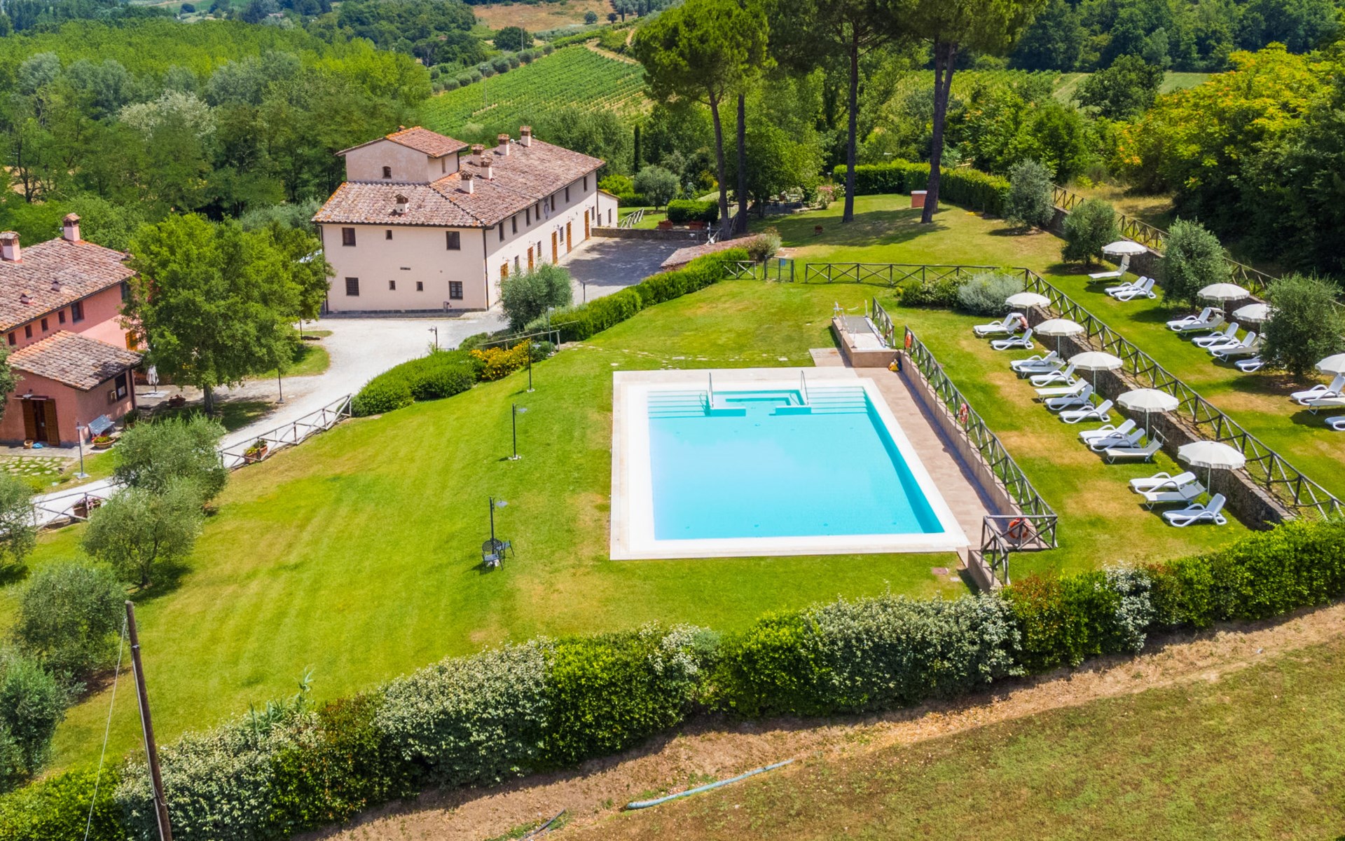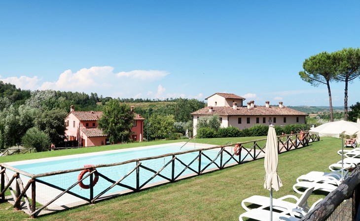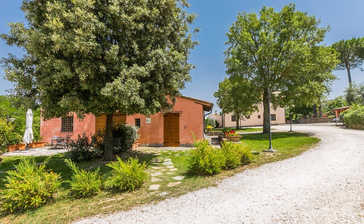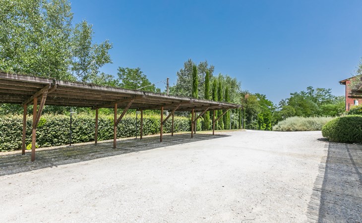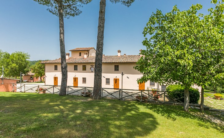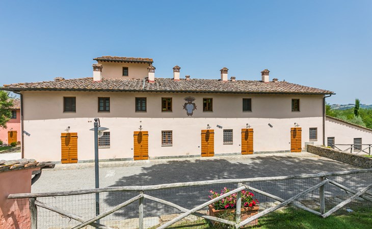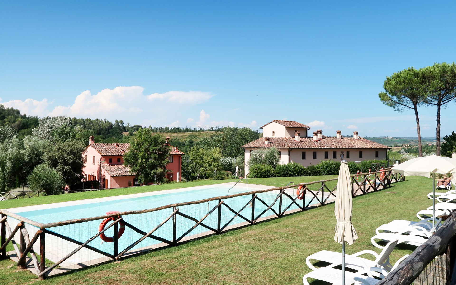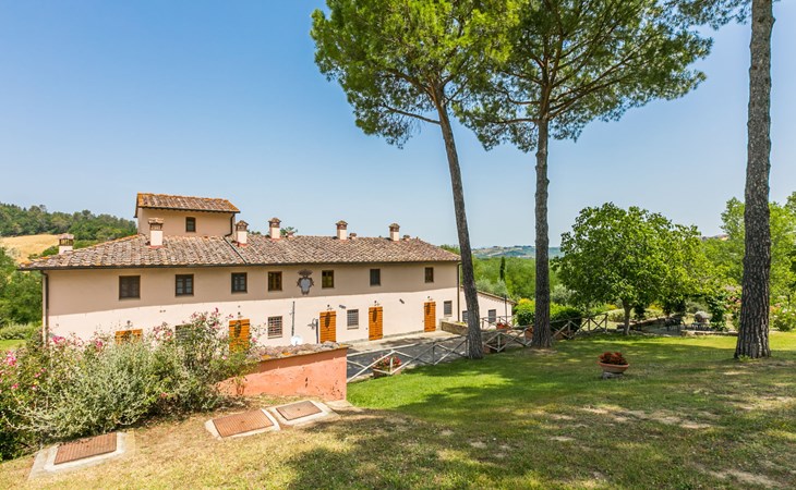 Beautiful, cosy country house "Francigena", surrounded by trees and fields. 9 apartments in the residence. 6 km from the centre of Castelfiorentino, 3 km from the centre of Castelnuovo d'Elsa, 30 km from the centre of San Gimignano, in a sunny position, 80 km from the sea, in the countryside. For shared use: property 20'000 m2, garden with lawn and trees, orchard (fenced), swimming pool fenced (15 x 9 m, depth 100 - 140 cm, seasonal availability: 01.Apr. - 31.Oct.). Outdoor shower, terrace, garden furniture, barbecue, pool maintenance by the owner/gardener. In the house: reception, washing machine, tumble dryer (for shared use, extra). Roofed, parking (for 12 cars) on the premises. E-charging station. Supermarket 6 km, bus stop 4 km, railway station "Castelfiorentino" 6 km, sandy beach "Calambrone" 80 km. Please note: car recommended. Baby equipment (included).