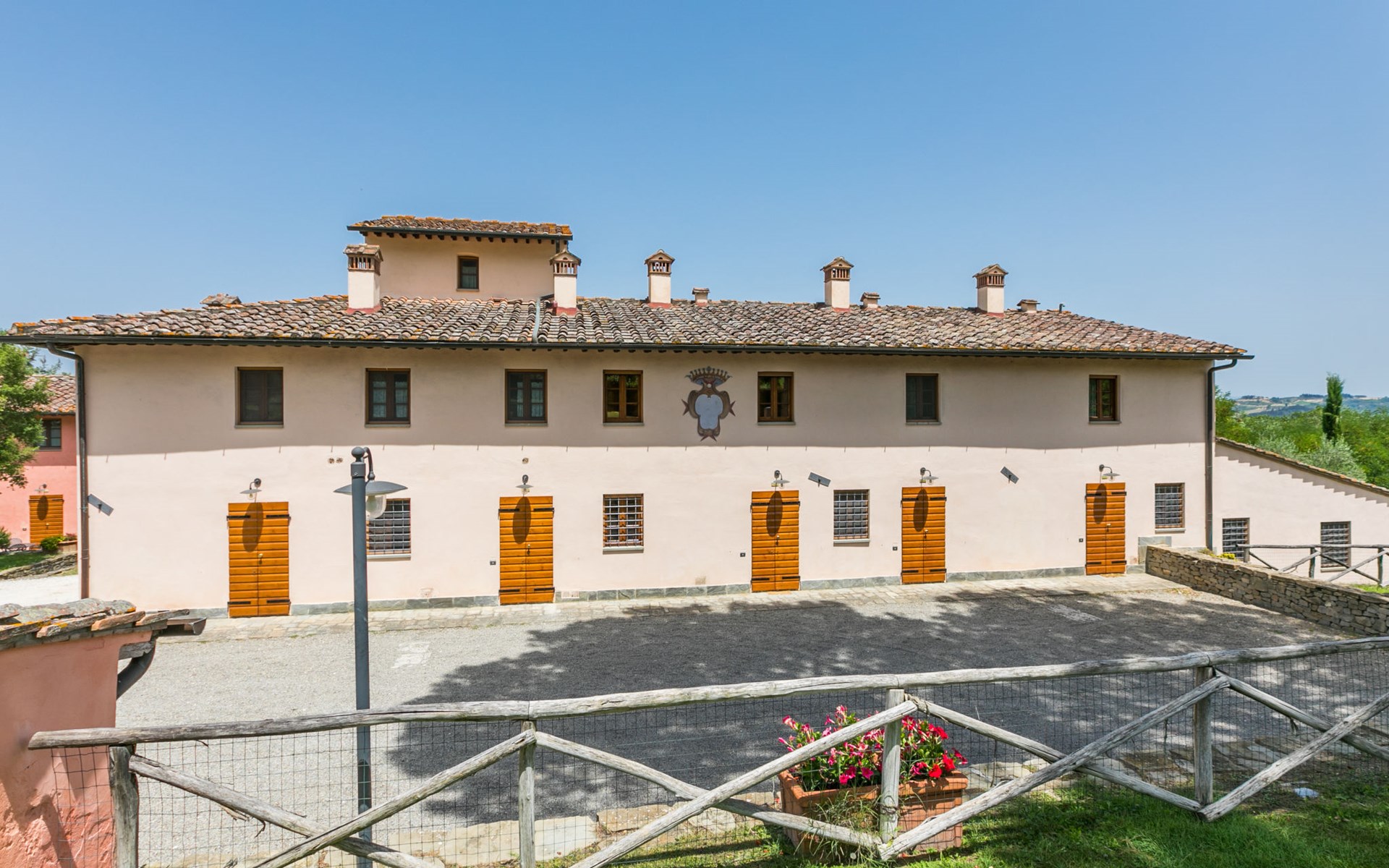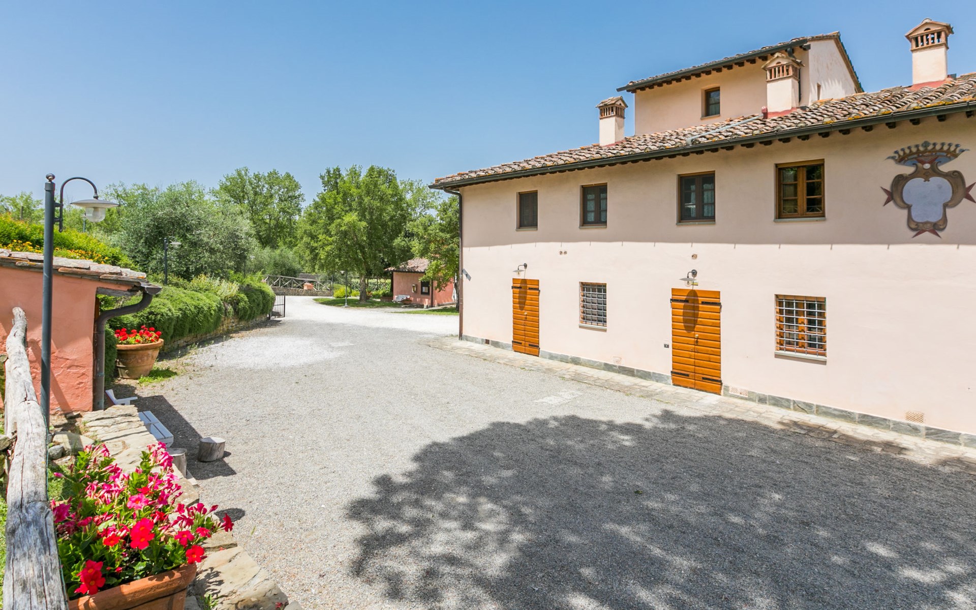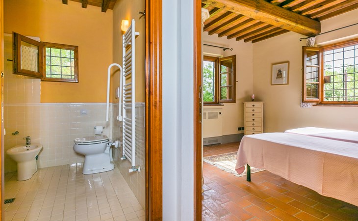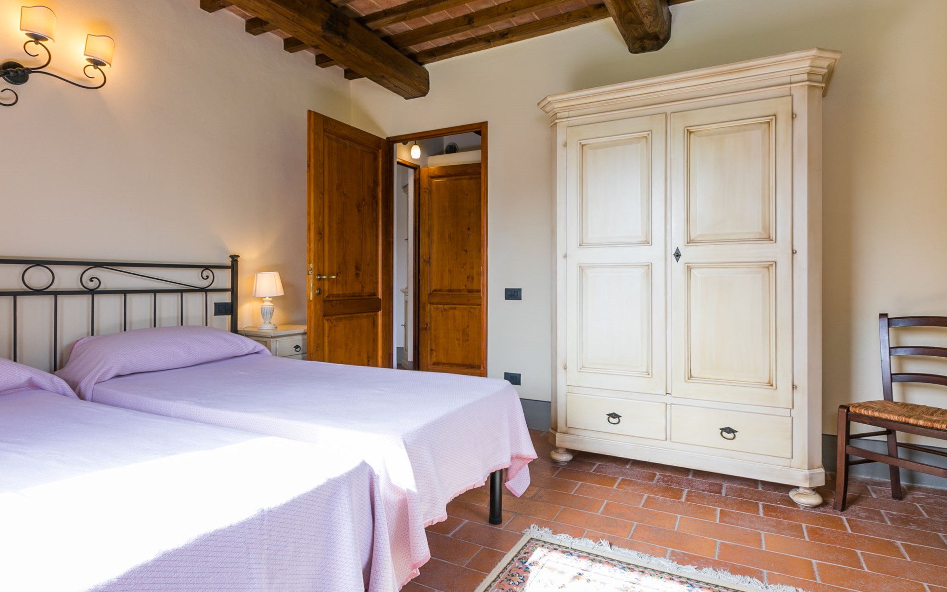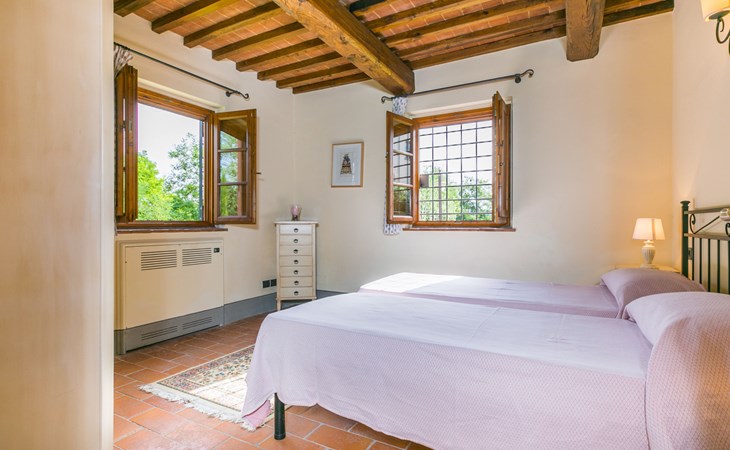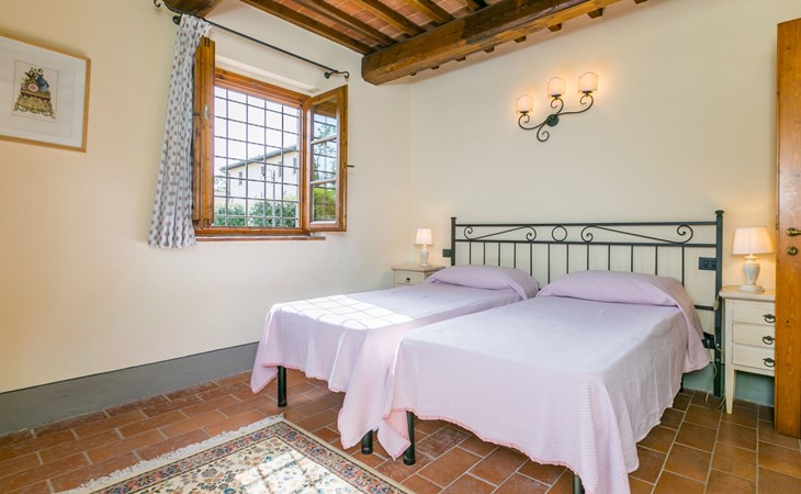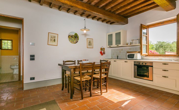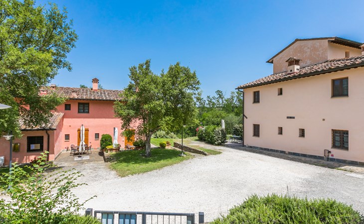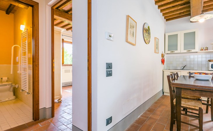 Beautiful, cosy country house "Francigena", surrounded by trees and fields. 9 apartments in the residence. 6 km from the centre of Castelfiorentino, 3 km from the centre of Castelnuovo d'Elsa, 30 km from the centre of San Gimignano, in a sunny position, 80 km from the sea, in the countryside. For shared use: property 20'000 m2, garden with lawn and trees, orchard (fenced), swimming pool fenced (15 x 9 m, depth 100 - 140 cm, seasonal availability: 01.Apr. - 31.Oct.). Outdoor shower, terrace, garden furniture, barbecue, pool maintenance by the owner/gardener. In the house: reception, washing machine, tumble dryer (for shared use, extra). Roofed, parking (for 12 cars) on the premises. E-charging station. Supermarket 6 km, bus stop 4 km, railway station "Castelfiorentino" 6 km, sandy beach "Calambrone" 80 km. Please note: car recommended. Baby equipment (included).