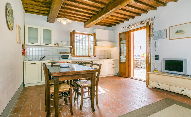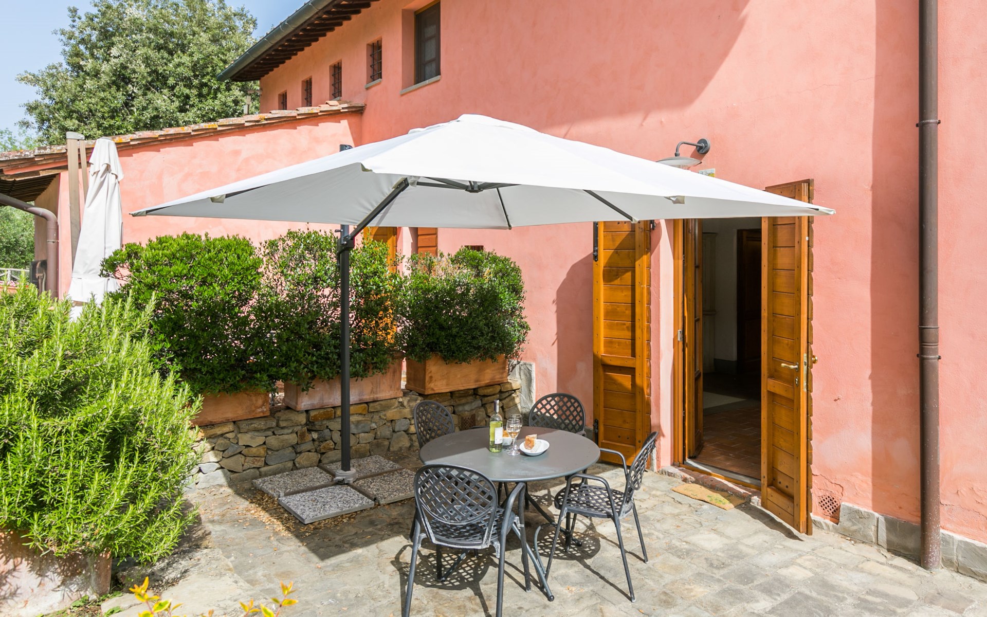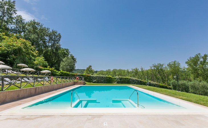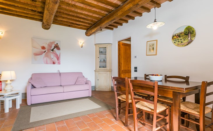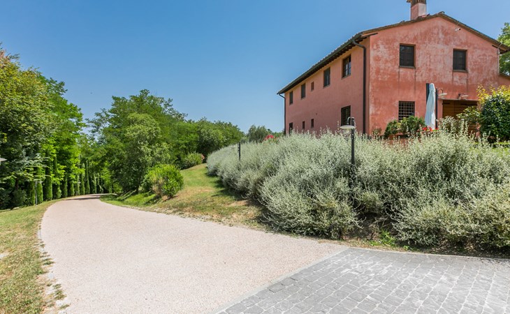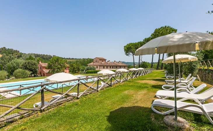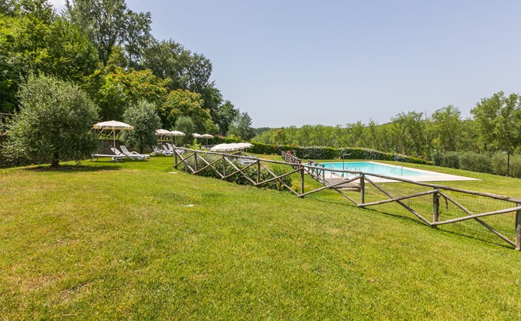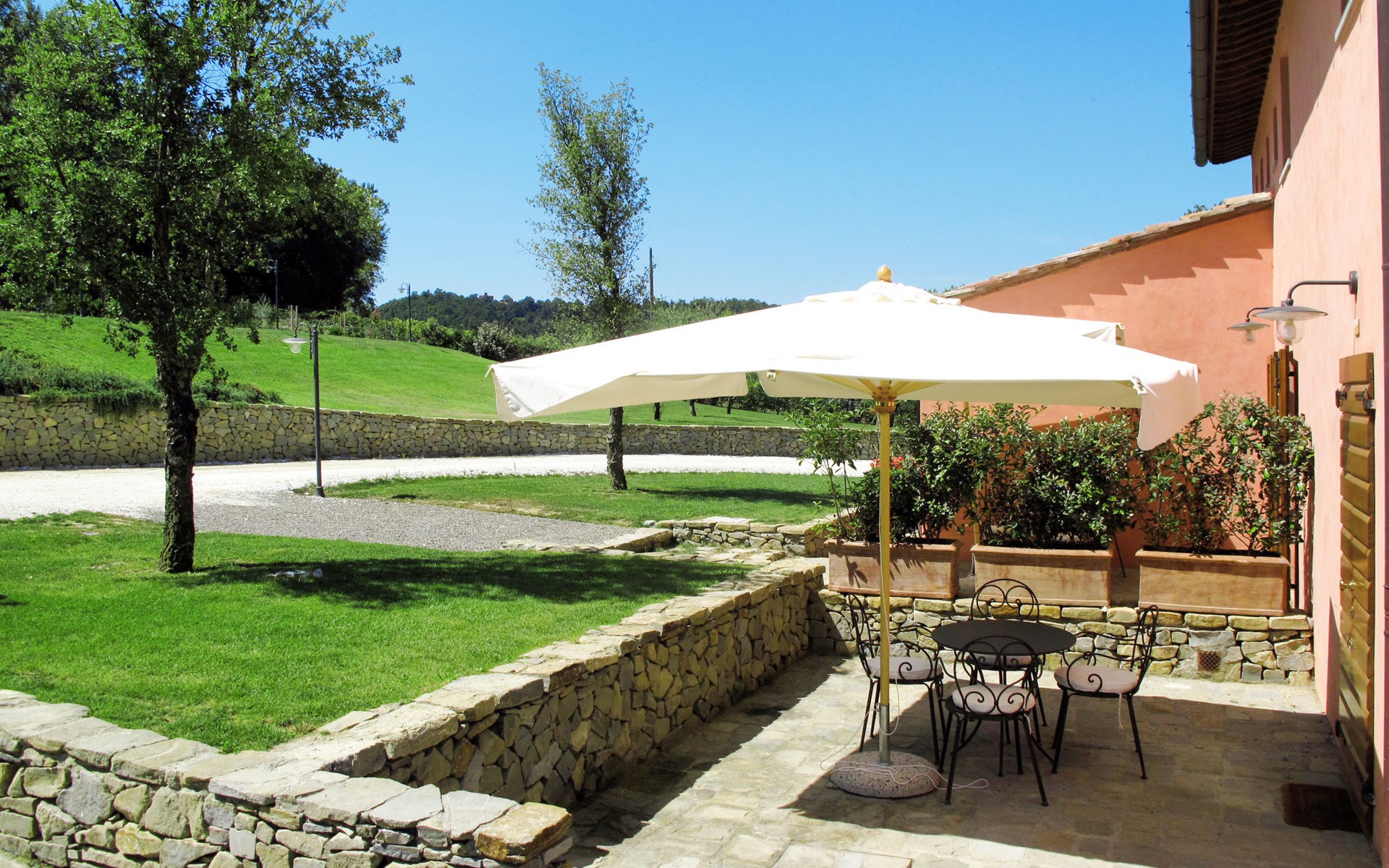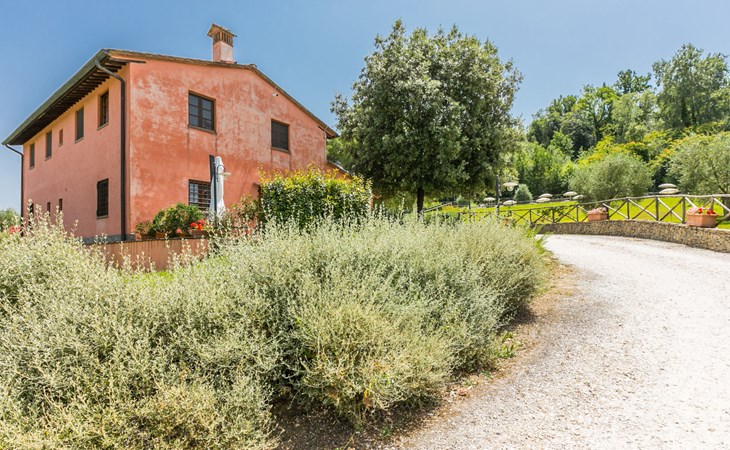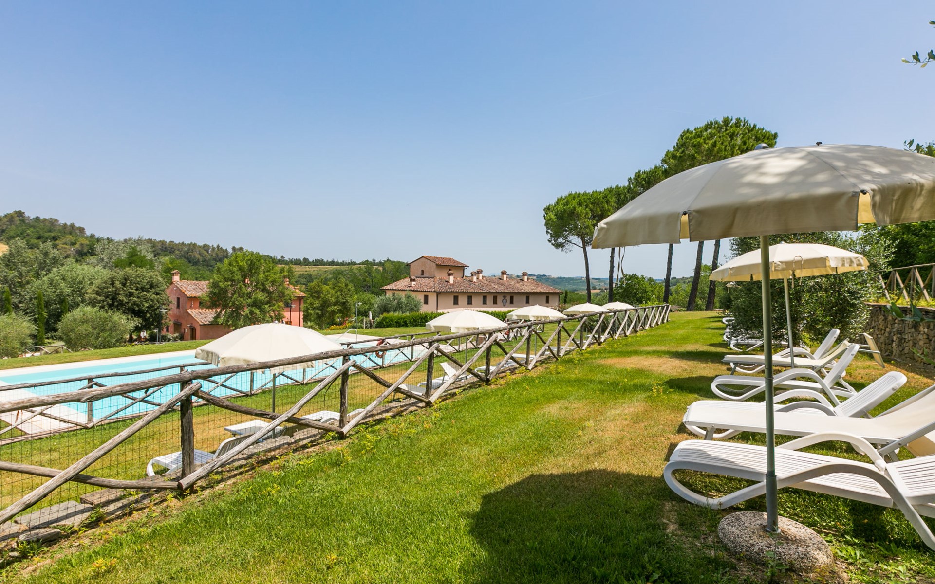 Beautiful, cosy country house "Francigena", surrounded by trees and fields. 9 apartments in the residence. 6 km from the centre of Castelfiorentino, 3 km from the centre of Castelnuovo d'Elsa, 30 km from the centre of San Gimignano, in a sunny position, 80 km from the sea, in the countryside. For shared use: property 20'000 m2, garden with lawn and trees, orchard (fenced), swimming pool fenced (15 x 9 m, depth 100 - 140 cm, seasonal availability: 01.Apr. - 31.Oct.). Outdoor shower, terrace, garden furniture, barbecue, pool maintenance by the owner/gardener. In the house: reception, washing machine, tumble dryer (for shared use, extra). Roofed, parking (for 12 cars) on the premises. E-charging station. Supermarket 6 km, bus stop 4 km, railway station "Castelfiorentino" 6 km, sandy beach "Calambrone" 80 km. Please note: car recommended. Baby equipment (included).