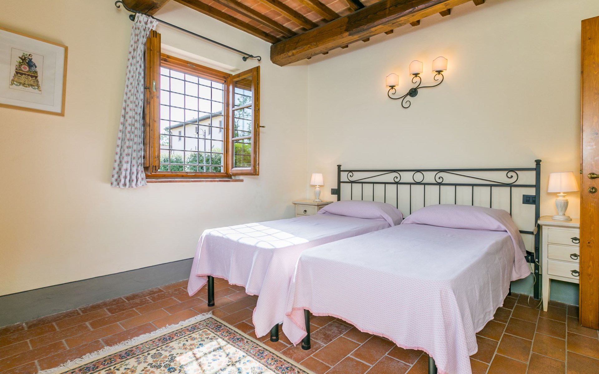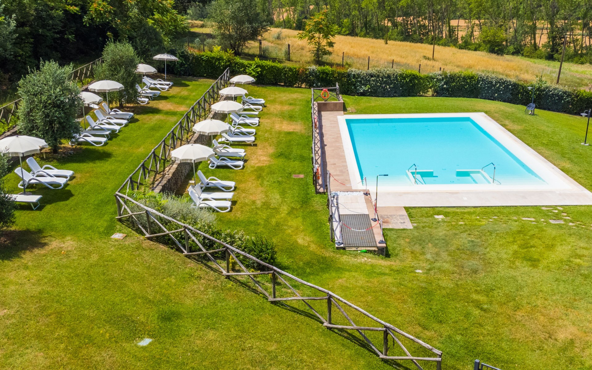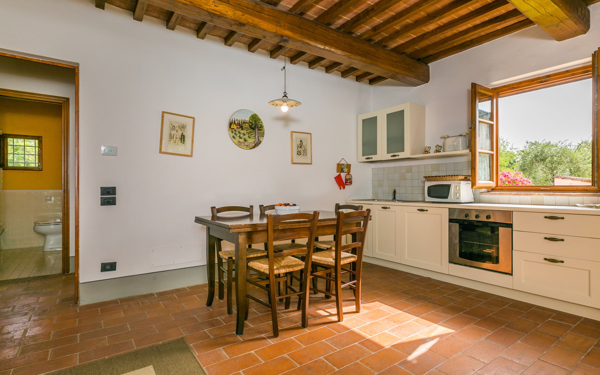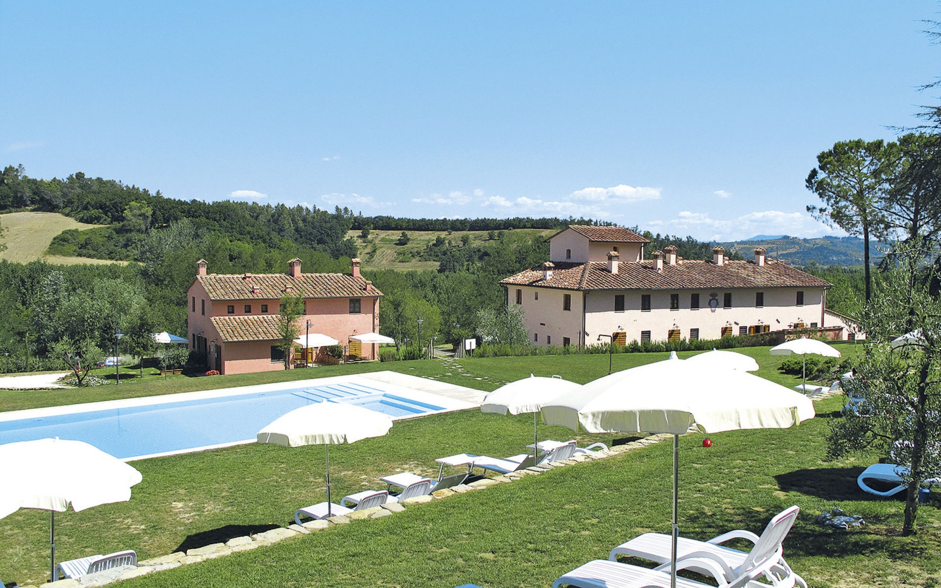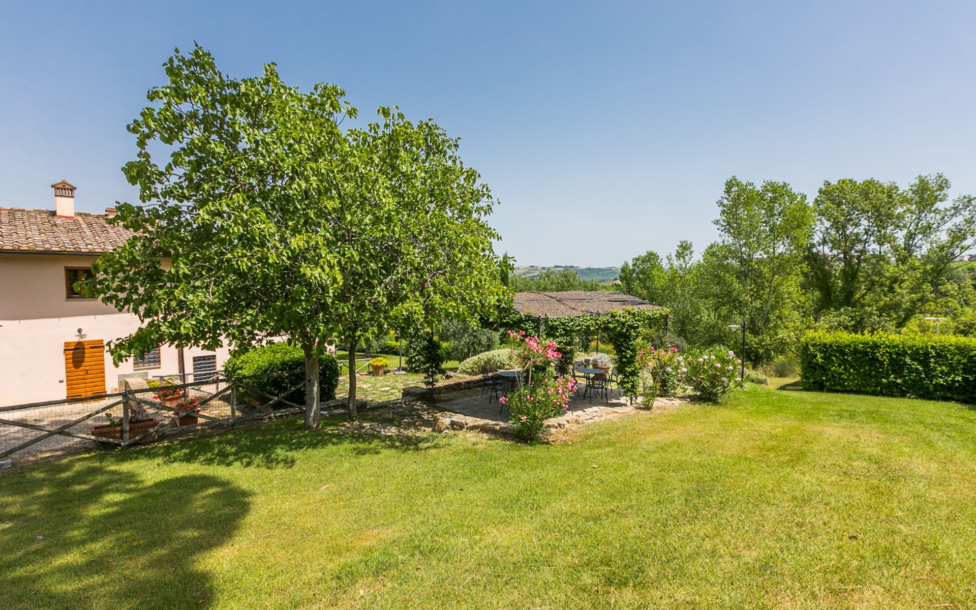 Beautiful, cosy country house "Francigena", surrounded by trees and fields. 9 apartments in the residence. 6 km from the centre of Castelfiorentino, 3 km from the centre of Castelnuovo d'Elsa, 30 km from the centre of San Gimignano, in a sunny position, 80 km from the sea, in the countryside. For shared use: property 20'000 m2, garden with lawn and trees, orchard (fenced), swimming pool fenced (15 x 9 m, depth 100 - 140 cm, seasonal availability: 01.Apr. - 31.Oct.). Outdoor shower, terrace, garden furniture, barbecue, pool maintenance by the owner/gardener. In the house: reception, washing machine, tumble dryer (for shared use, extra). Roofed, parking (for 12 cars) on the premises. E-charging station. Supermarket 6 km, bus stop 4 km, railway station "Castelfiorentino" 6 km, sandy beach "Calambrone" 80 km. Please note: car recommended. Baby equipment (included).