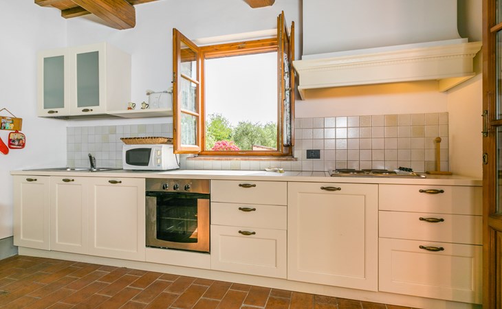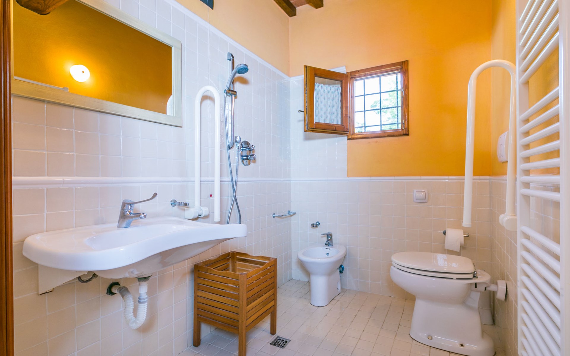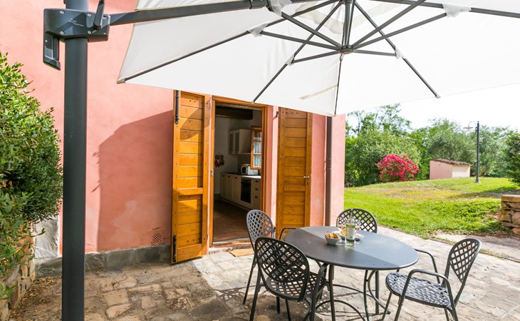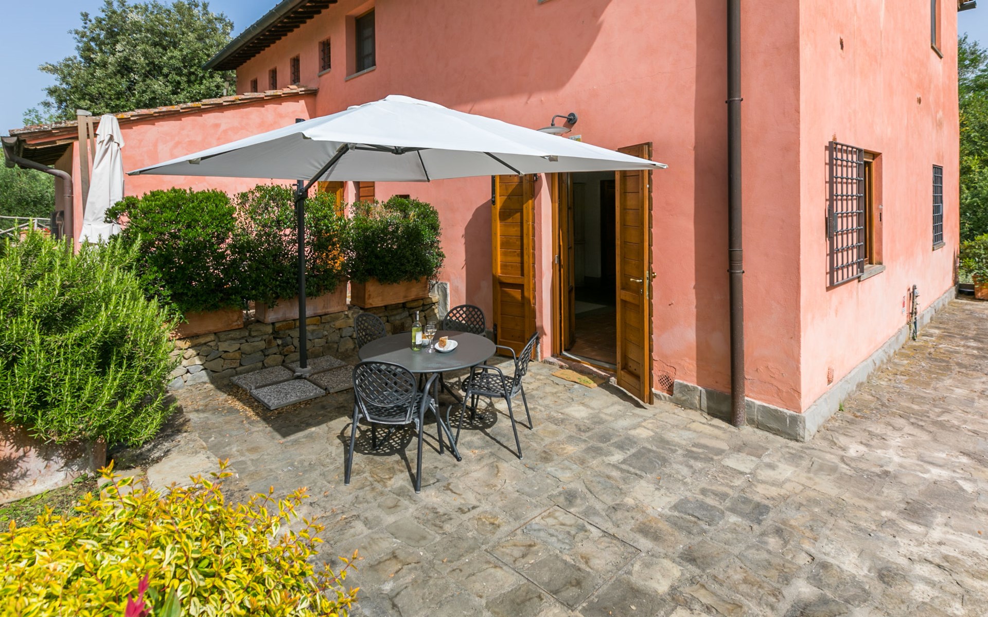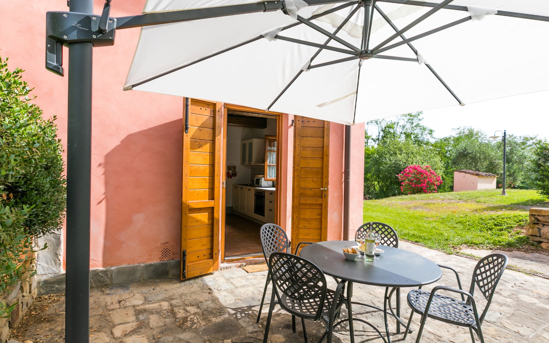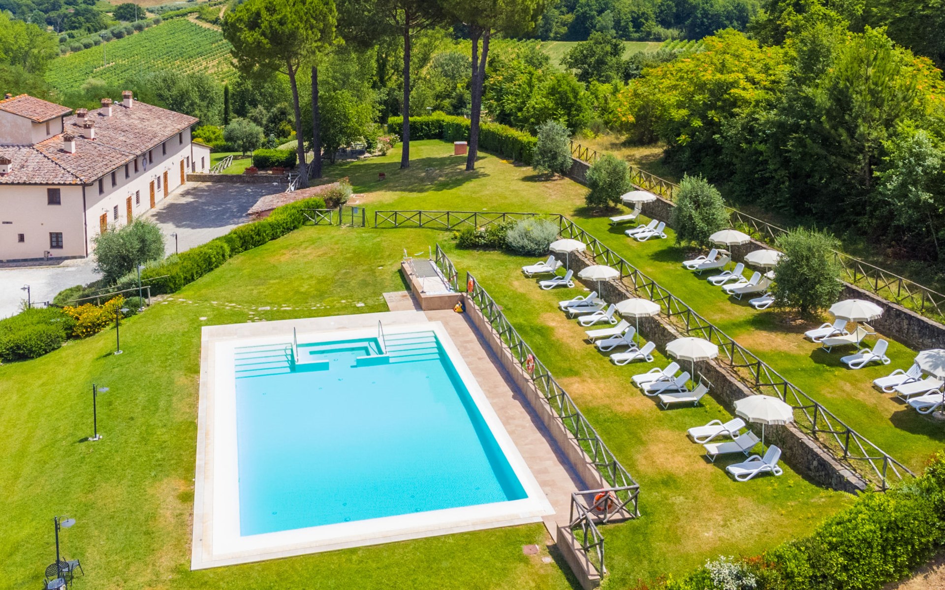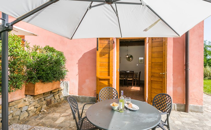 Beautiful, cosy country house "Francigena", surrounded by trees and fields. 9 apartments in the residence. 6 km from the centre of Castelfiorentino, 3 km from the centre of Castelnuovo d'Elsa, 30 km from the centre of San Gimignano, in a sunny position, 80 km from the sea, in the countryside. For shared use: property 20'000 m2, garden with lawn and trees, orchard (fenced), swimming pool fenced (15 x 9 m, depth 100 - 140 cm, seasonal availability: 01.Apr. - 31.Oct.). Outdoor shower, terrace, garden furniture, barbecue, pool maintenance by the owner/gardener. In the house: reception, washing machine, tumble dryer (for shared use, extra). Roofed, parking (for 12 cars) on the premises. E-charging station. Supermarket 6 km, bus stop 4 km, railway station "Castelfiorentino" 6 km, sandy beach "Calambrone" 80 km. Please note: car recommended. Baby equipment (included).